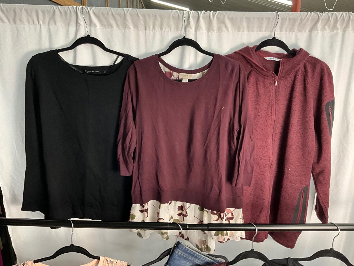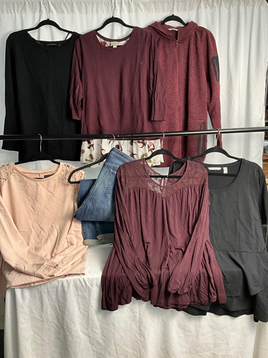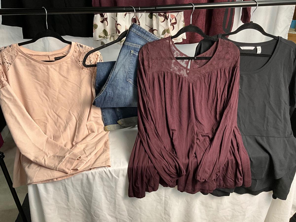 The lot contains 6 tops and one pair of jeans. Brands included are Mossimo, Lane Bryant, Loft and more.