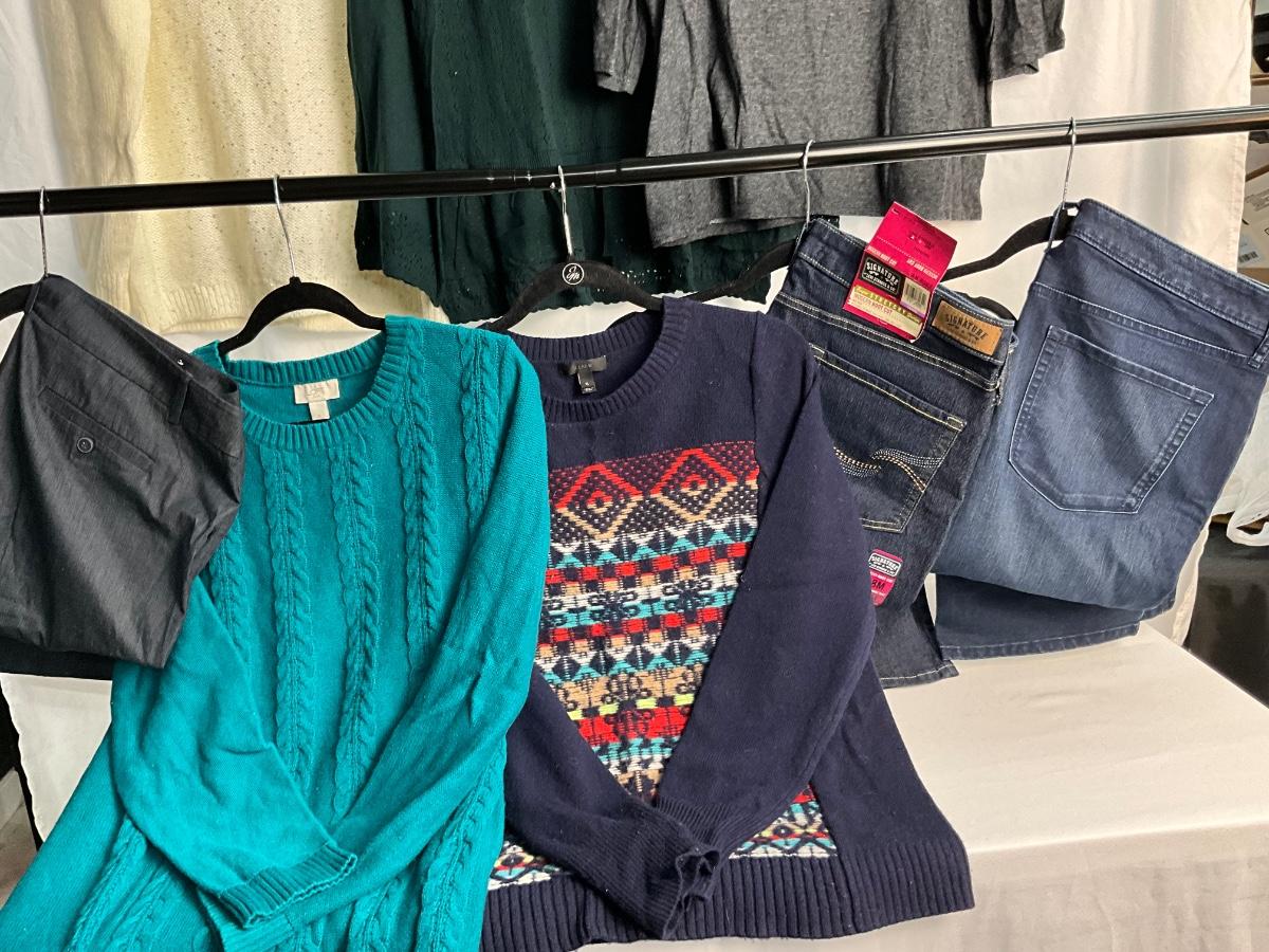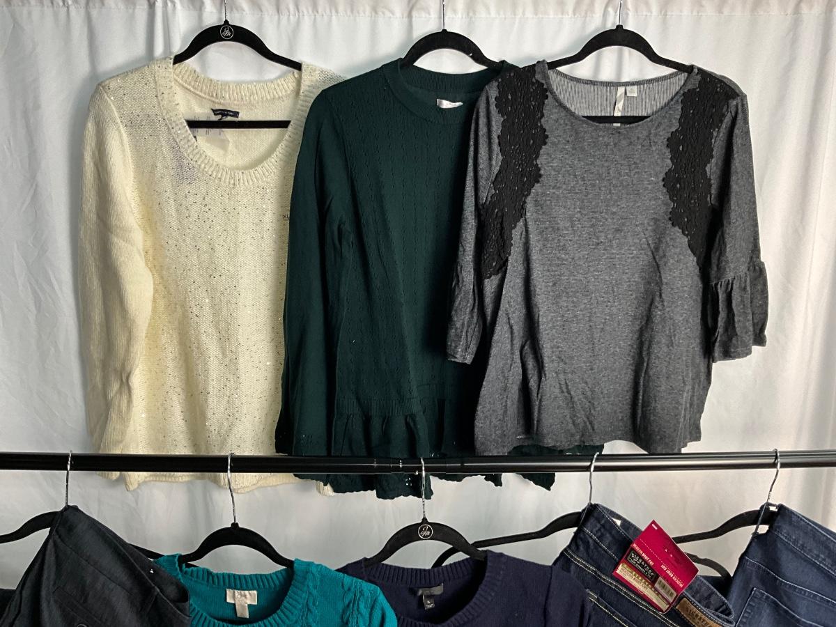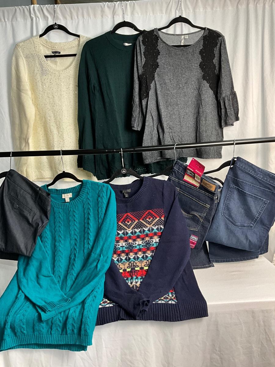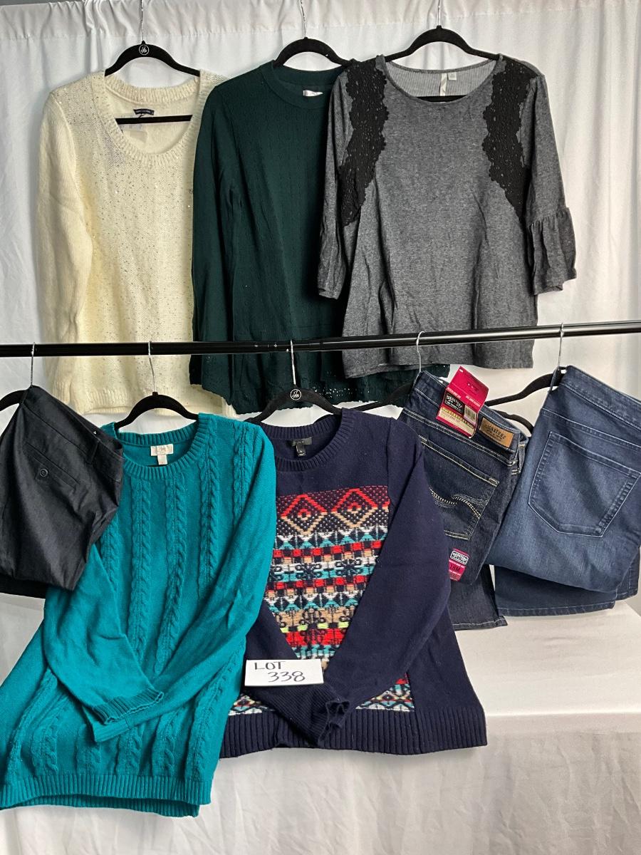 This lot contains several items that are brand new with tags. There are 8 items in the lot. There are 5 tops (XL) and 3 pair of pants (18). Brands included but not limited to are: Tommy Hilfiger, Levi’s, Lauren Conrad, Merona, J. Crew and more.