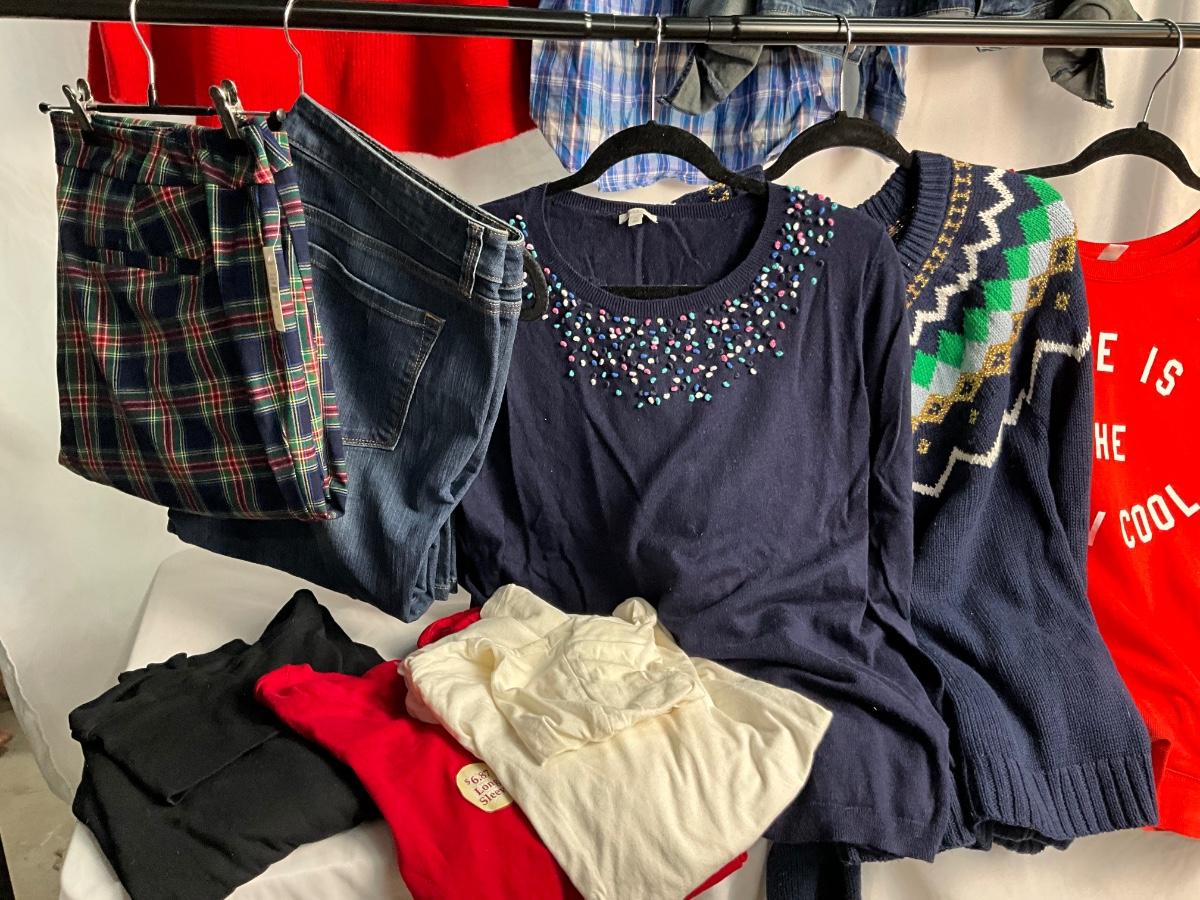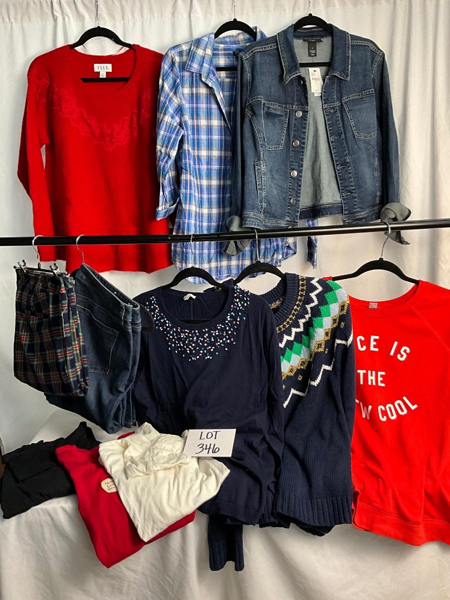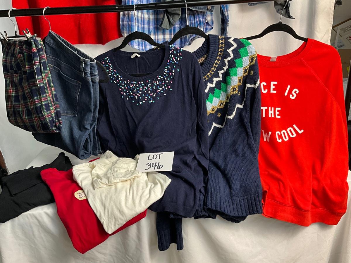 There are 11 items in this lot and several are new with tags. The tops in the lot are XL and the pants are 16/18. Brands included in the lot are Lane Bryant, J. Crew, Talbots, Loft and more.