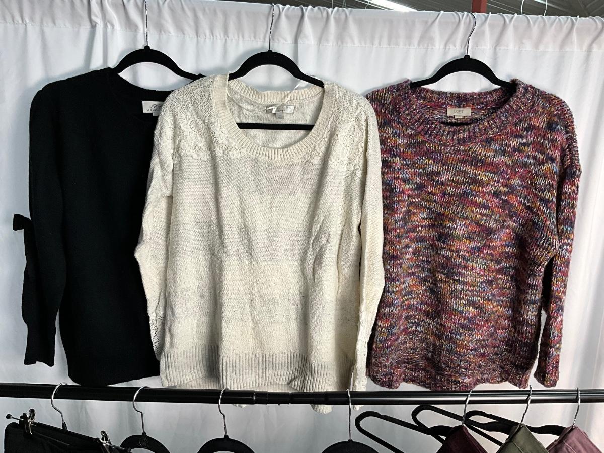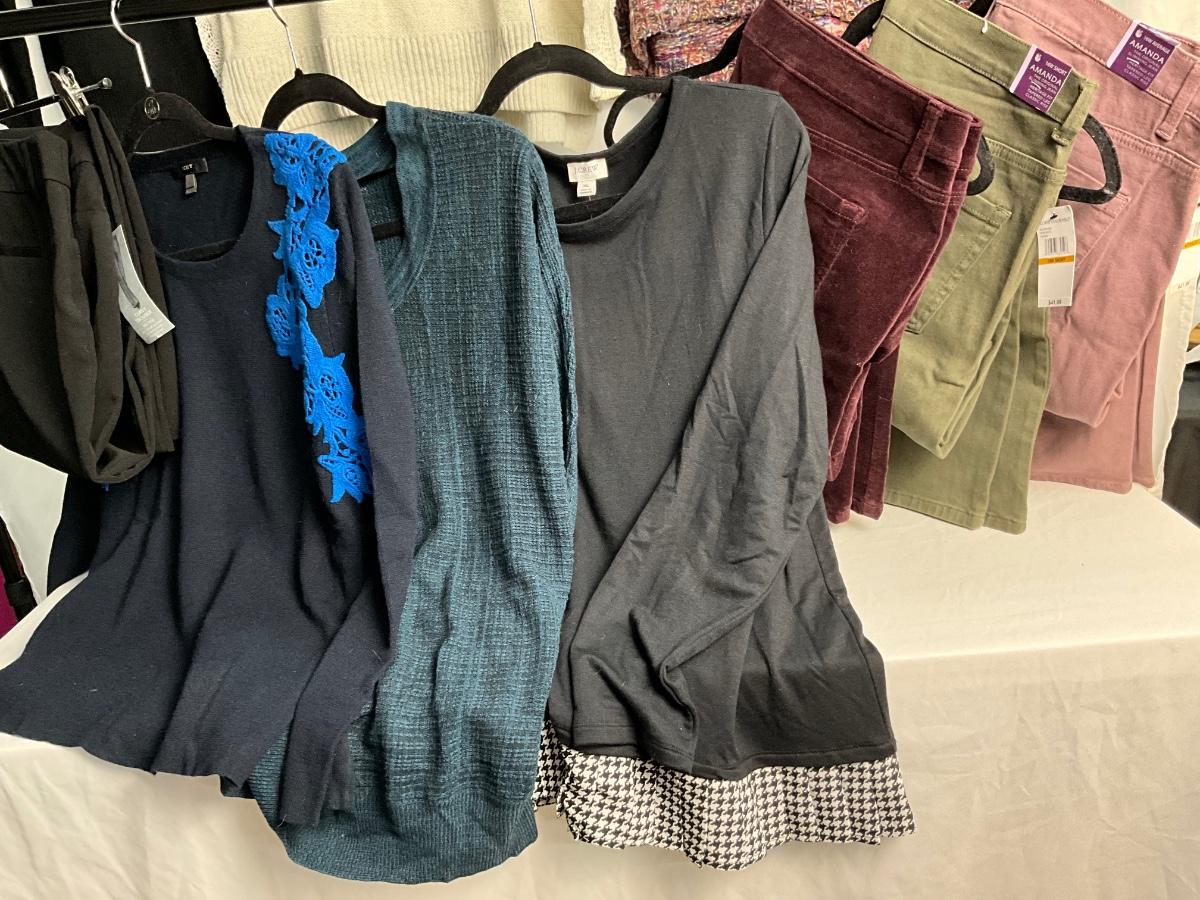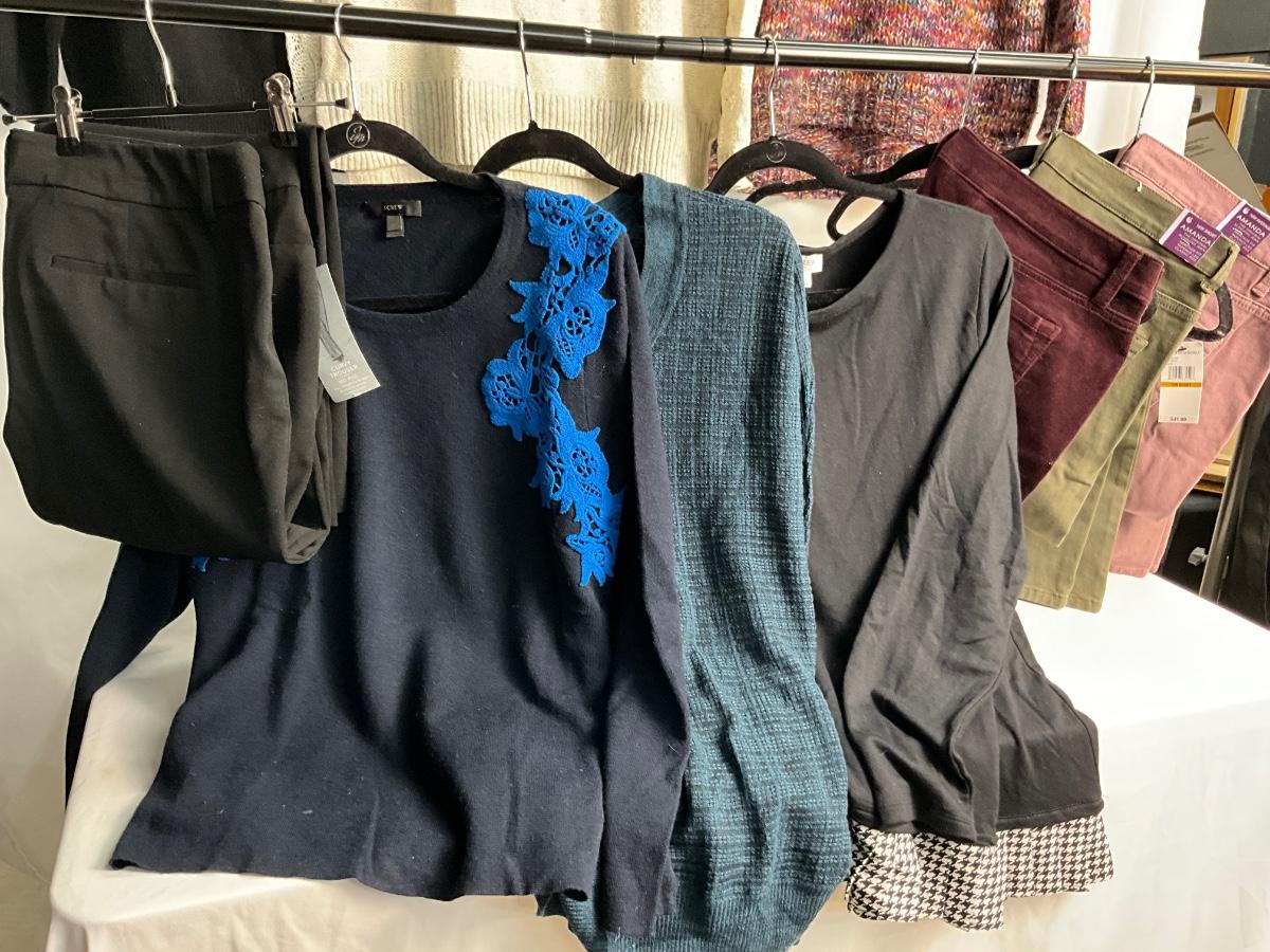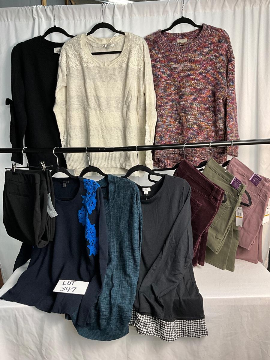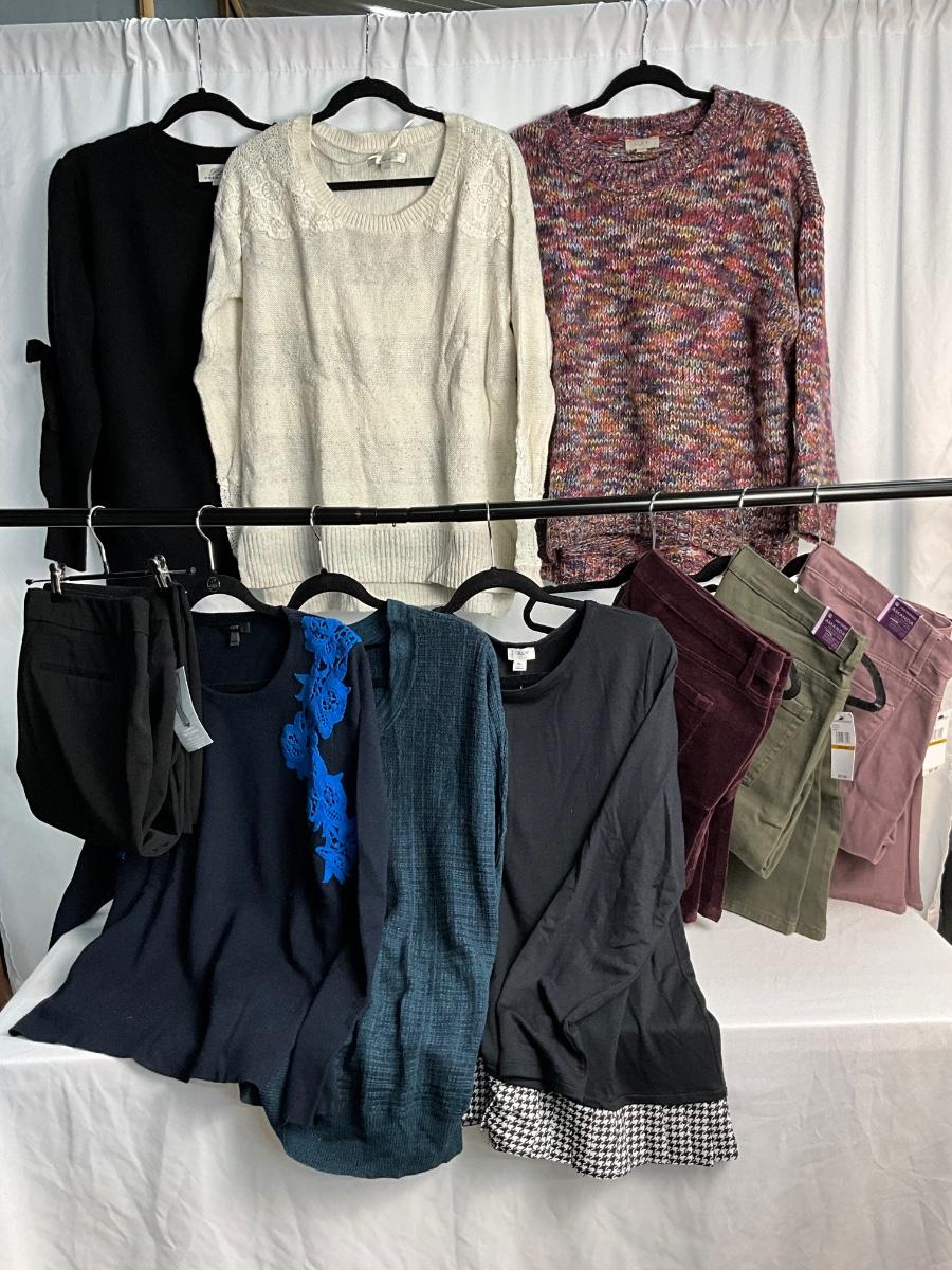 This lot contains many items that can be interchanged and worn together for several outfit option. The tops are XL and the pants are 16. Brands included are Loft, Gloria Vanderbilt, Apt.9, Lauren Conrad, J. Crew, PLY Cashmere and more.