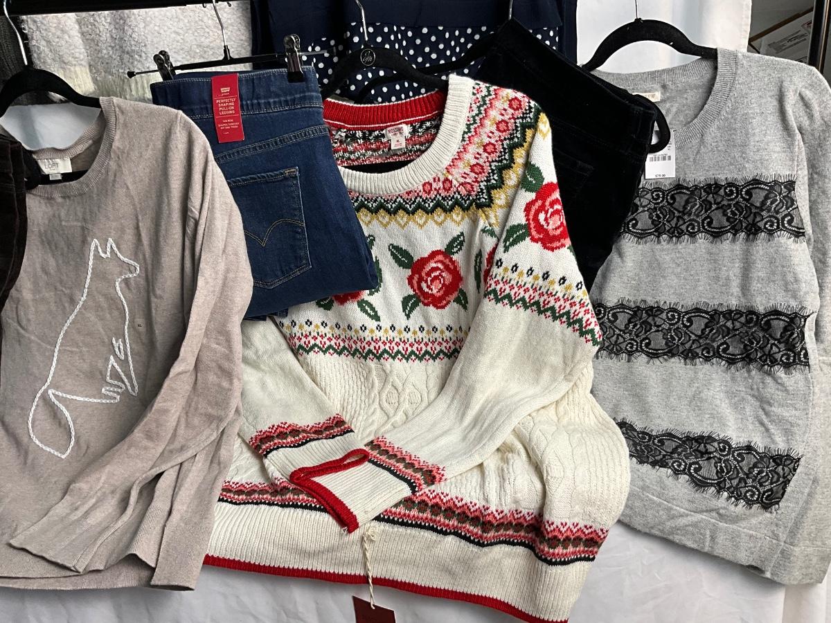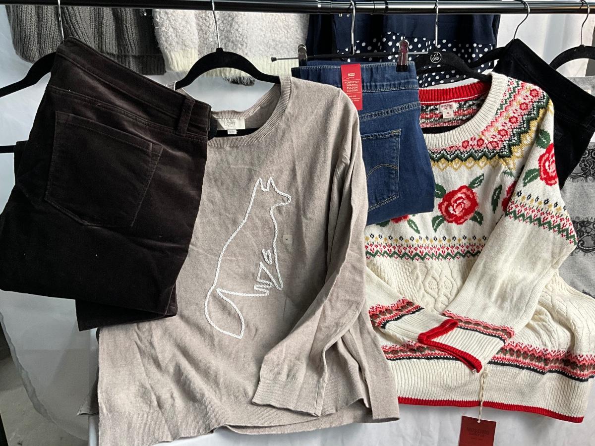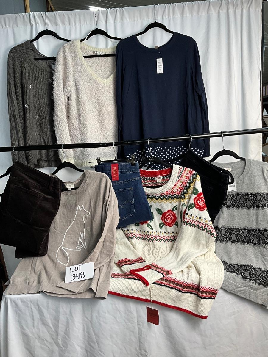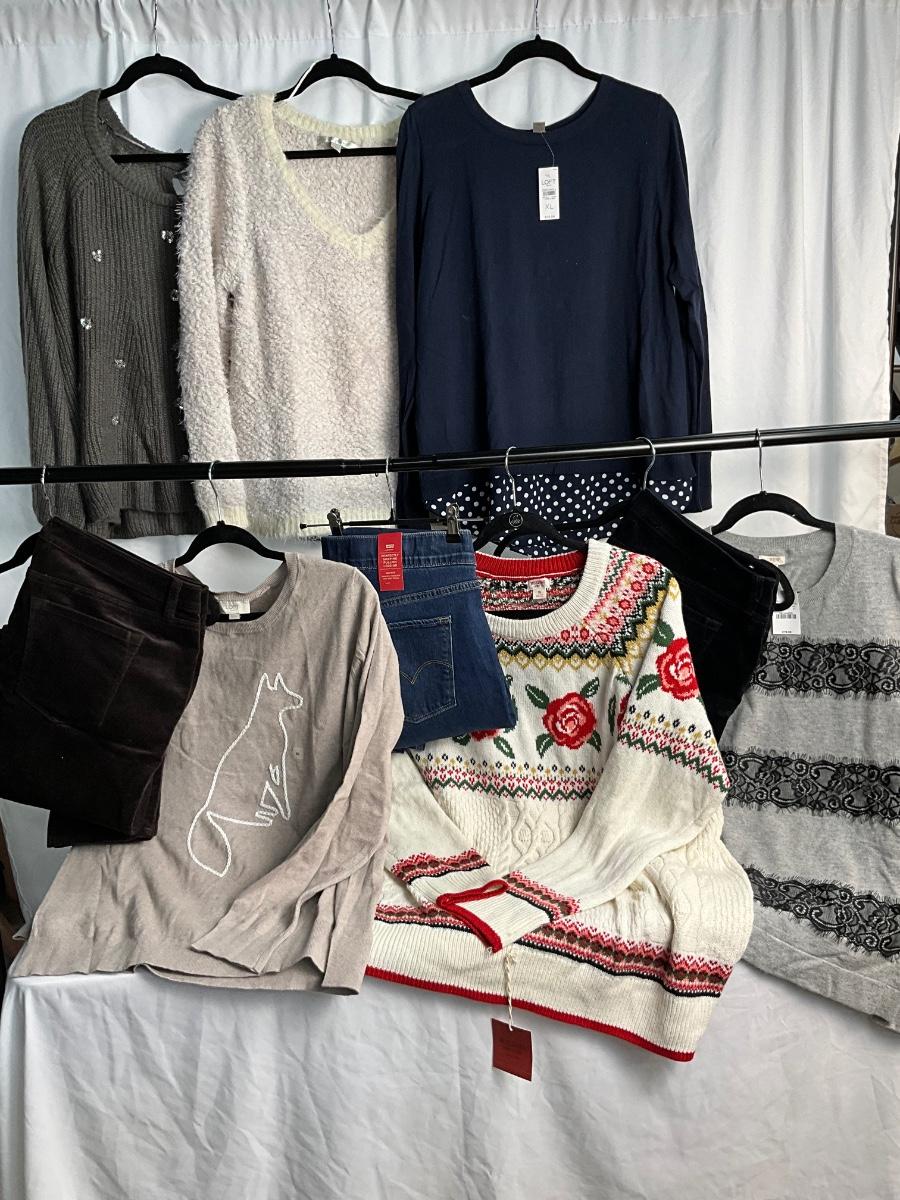 This lot contains 9 items, many of these are new with tags. There are 6 tops/sweaters that are size XL. There are 2 pair of slacks and 1 pair of jeans, all are size 16. Brands included in this lot are Lauren Conrad, Loft, Mossimo, Levi’s, J.Crew and more.