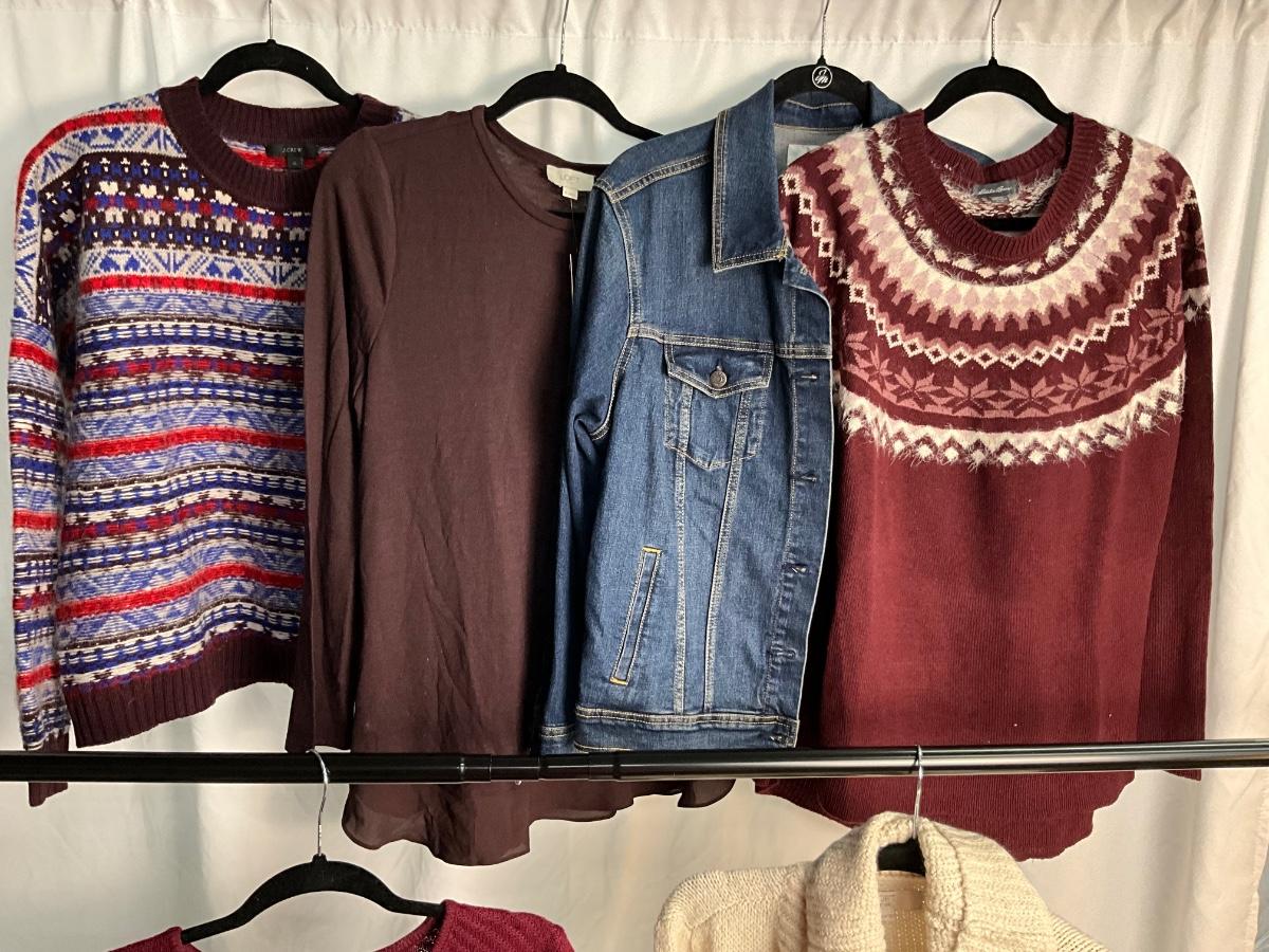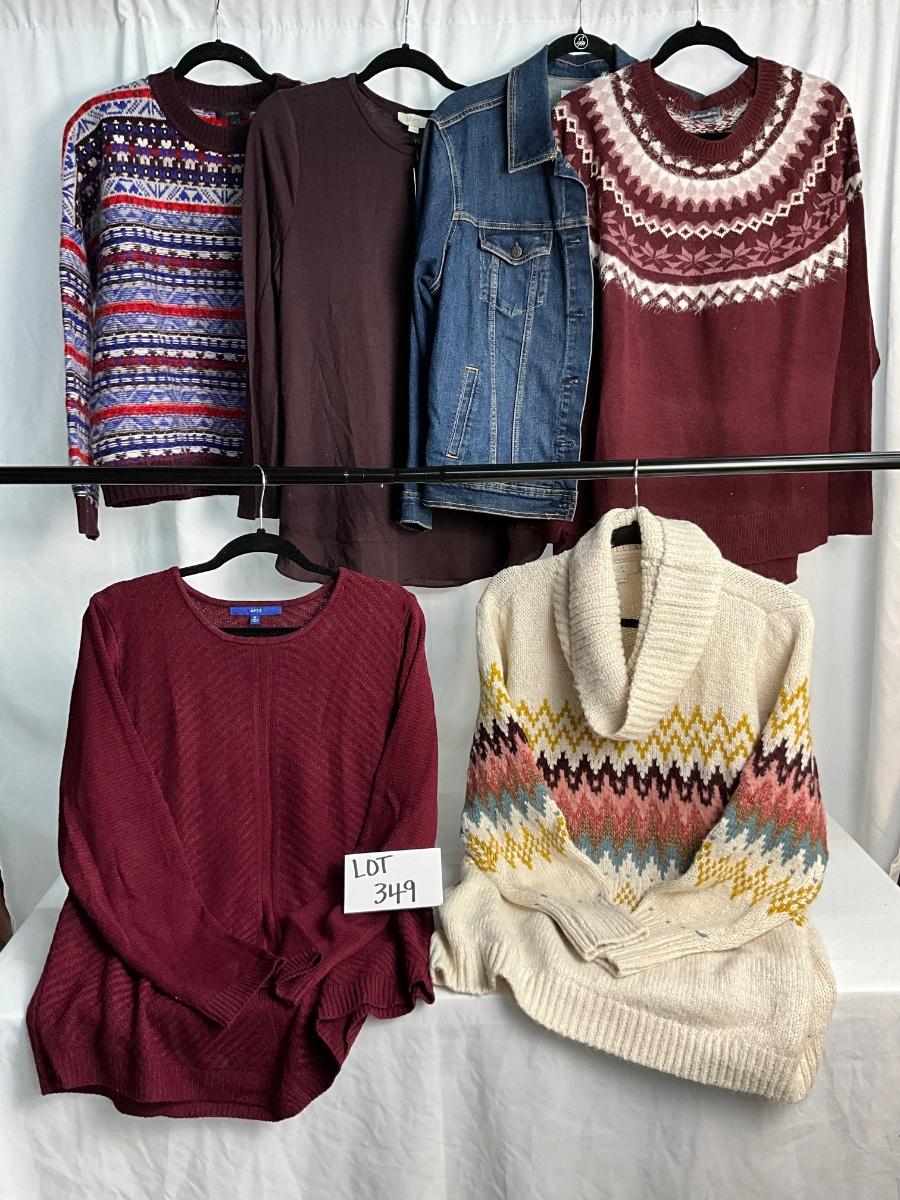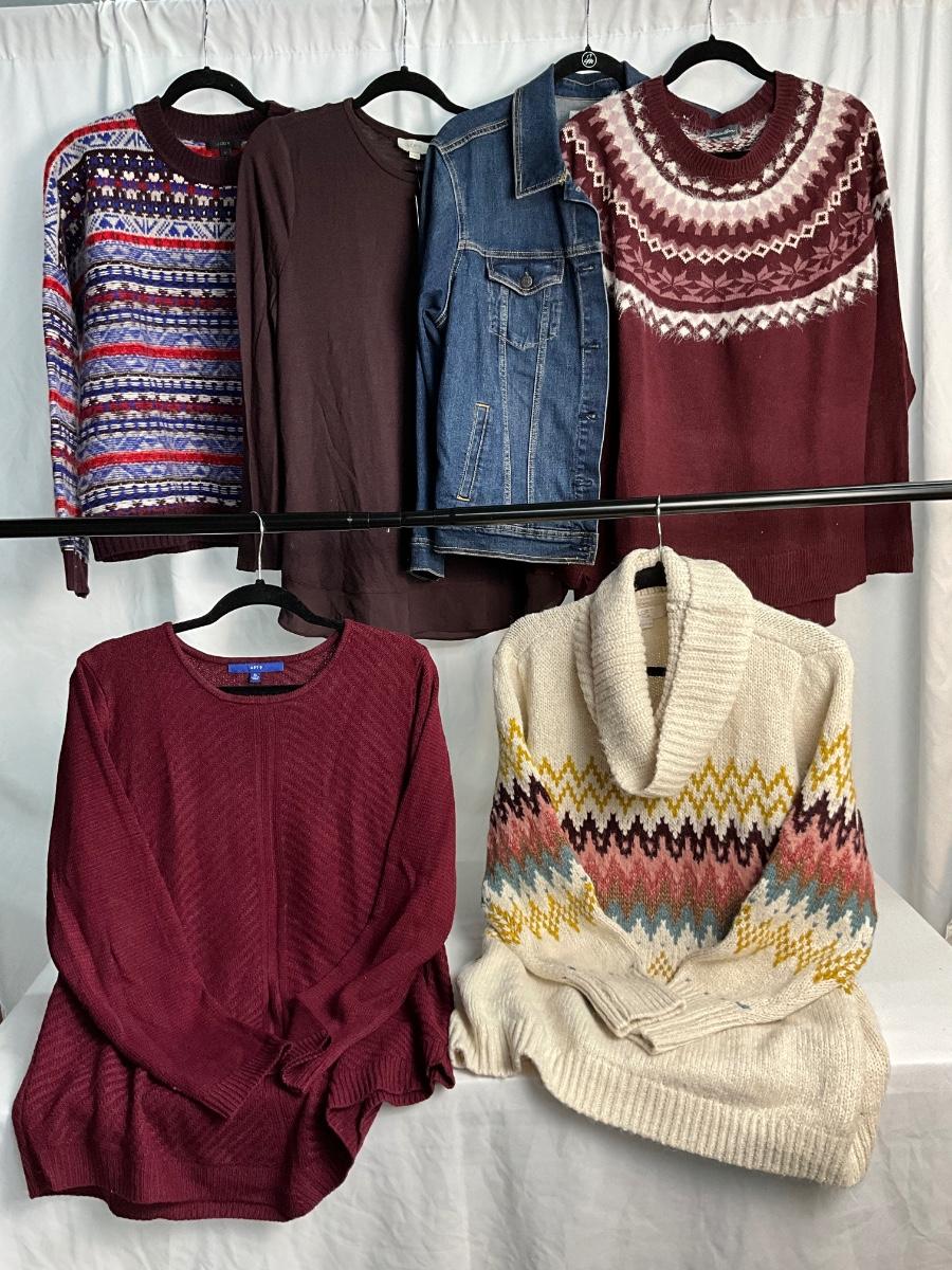 This lot contains 6 items, most are new with tags. There is 1 top, 1 jean jacket and 4 sweaters. Brands included are J.Crew, Old Navy, Loft Plus, Eddie Bauer and more.