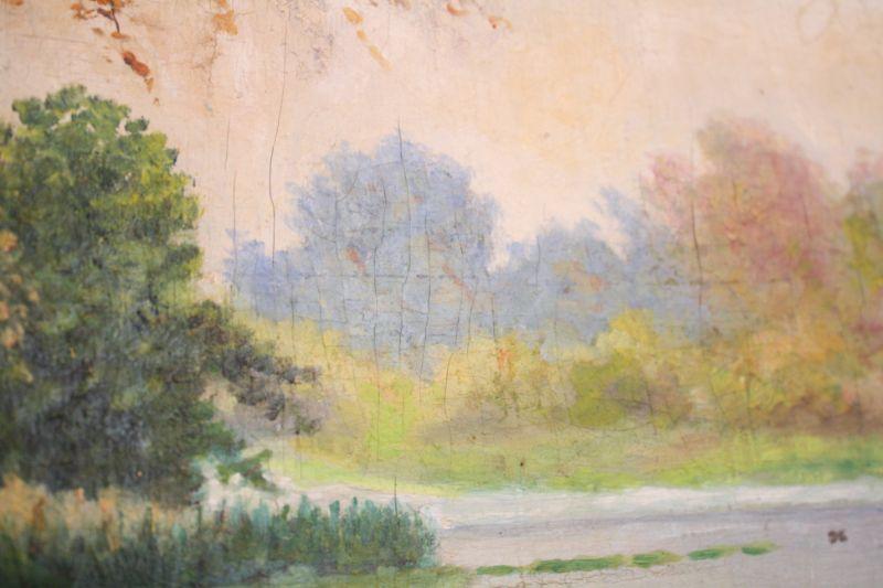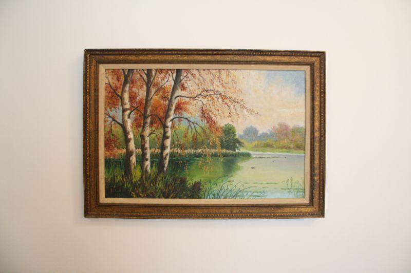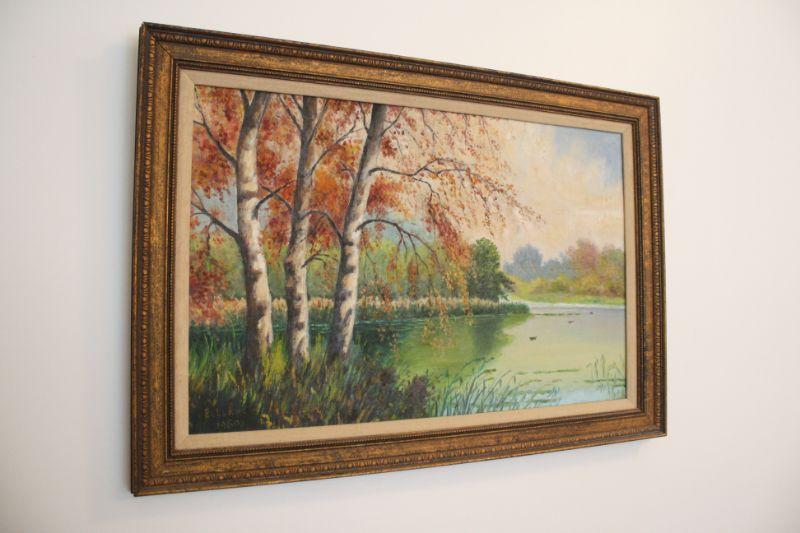 E Lukae 1960 Oil Painting on Board - Original oil painting on hard board signed by E Lukae. Painting depicts a nature scene of a lake surrounded by trees. Measures 27" x 19".