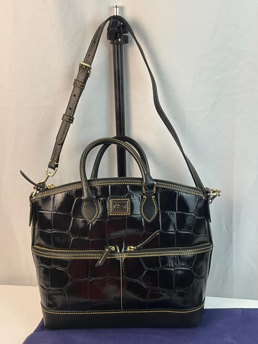 New With Tags Dooney & Bourke Black embossed crocodile handbag with optional shoulder strap and double front pockets.