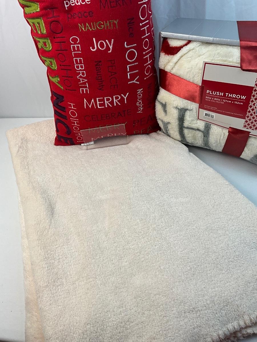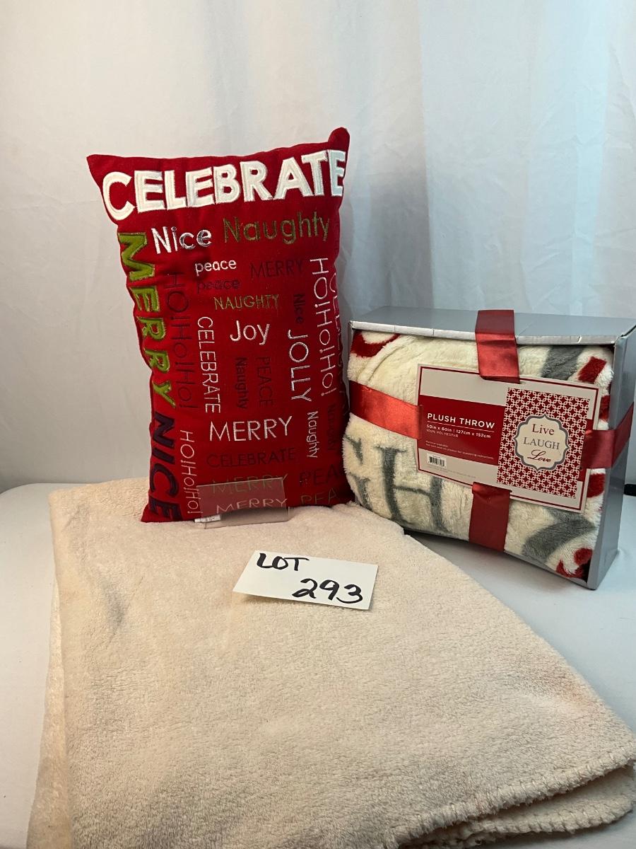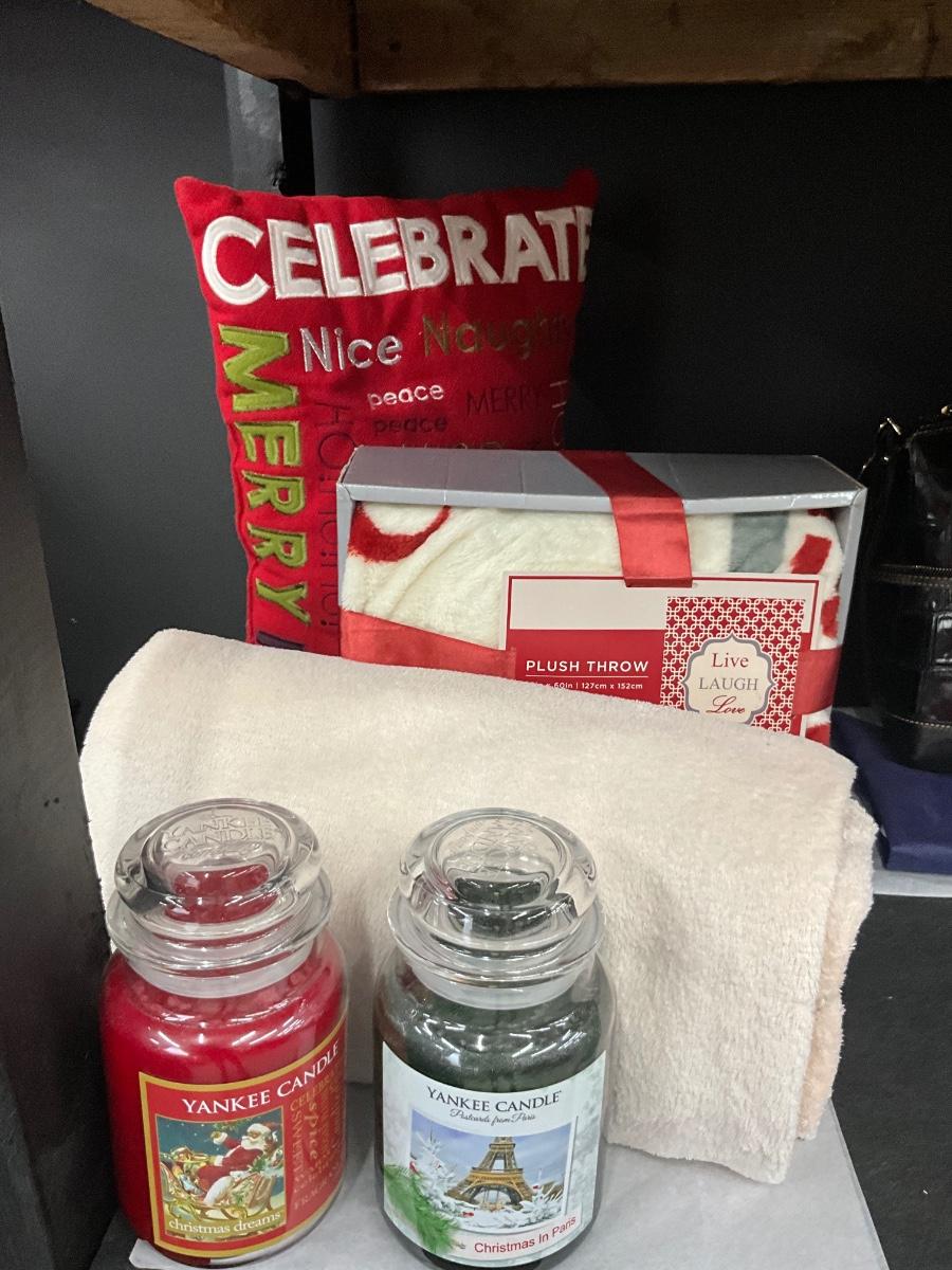 Lot of Holiday home decor contains 1 Christmas themed throw pillow, 1 Cream colored throw blanket, 1 Live, Laugh, Love throw blanket, 2 Yankee Candles Cristmas Dreams scent and Christmas In Paris scent.