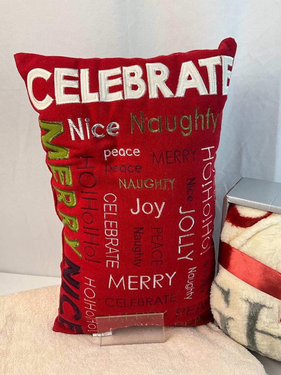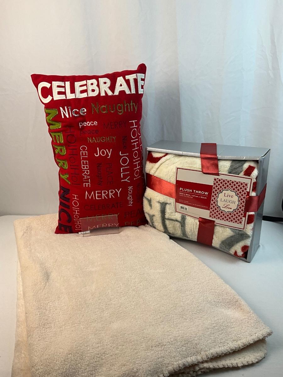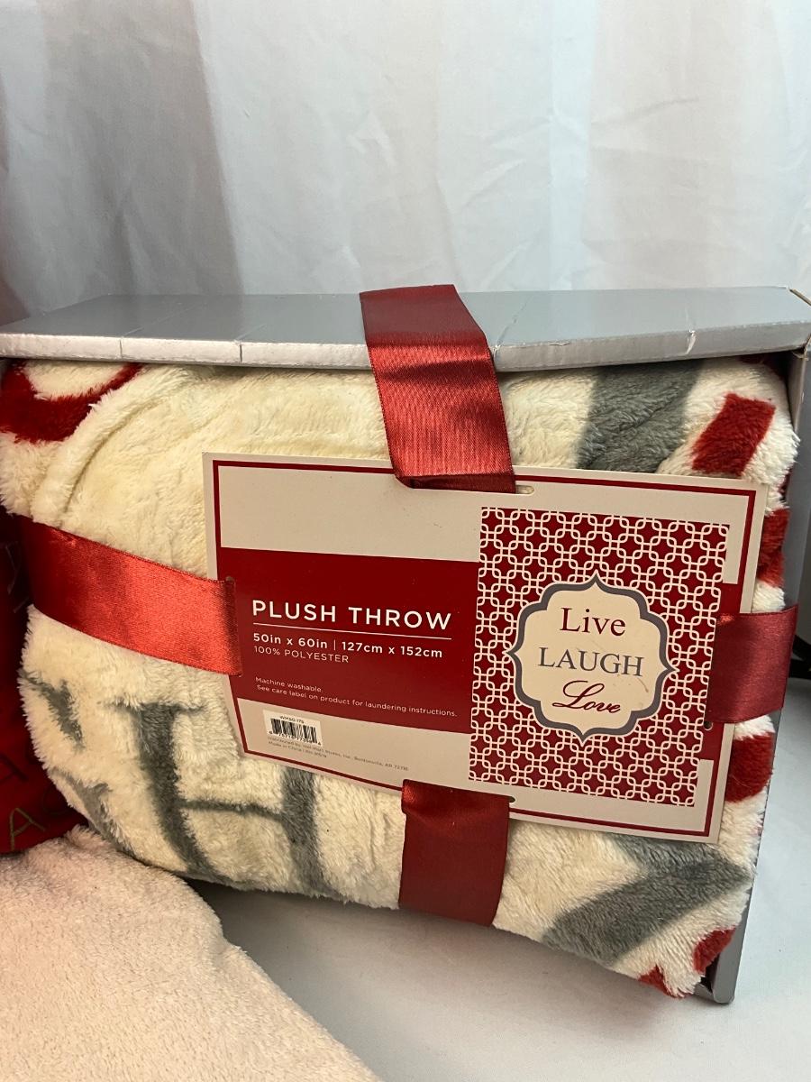 Lot of Holiday home decor contains 1 Christmas themed throw pillow, 1 Cream colored throw blanket, 1 Live, Laugh, Love throw blanket, 2 Yankee Candles Cristmas Dreams scent and Christmas In Paris scent.