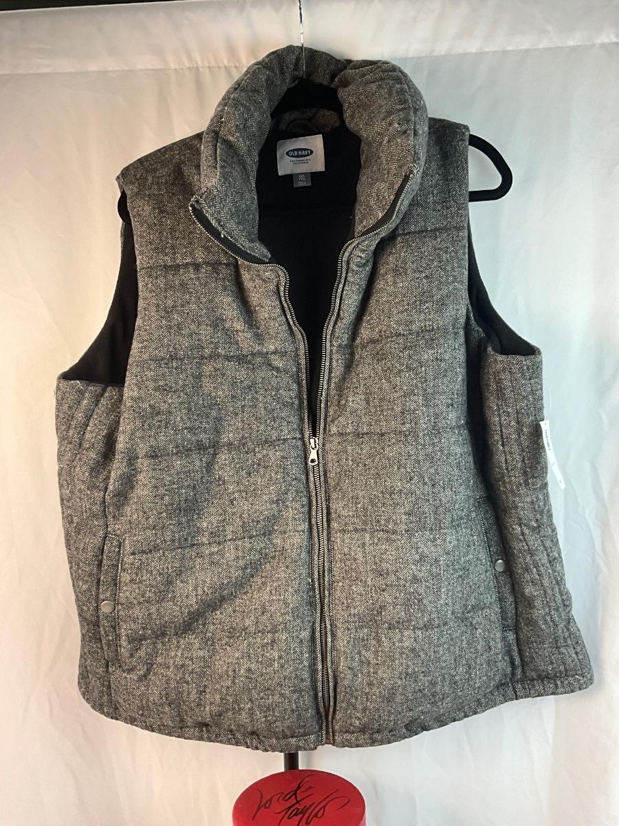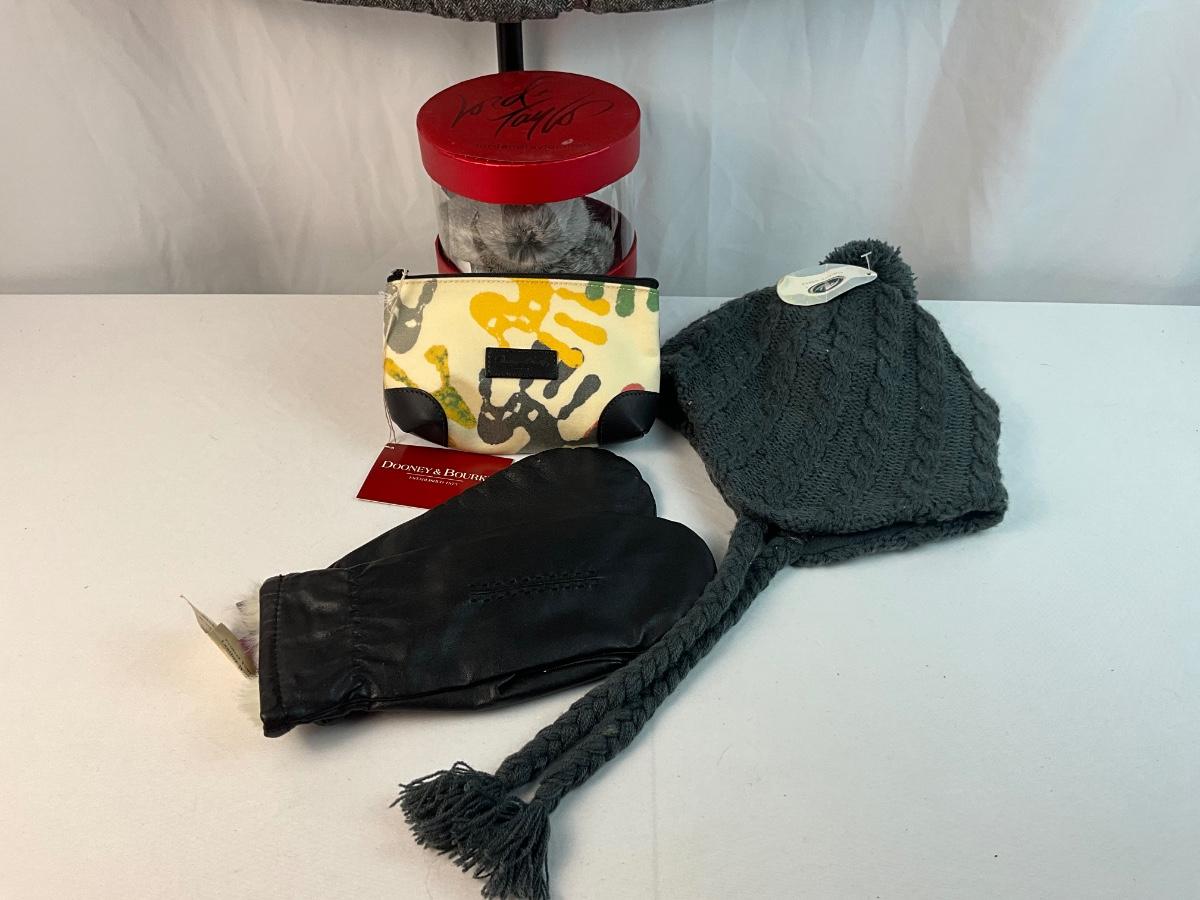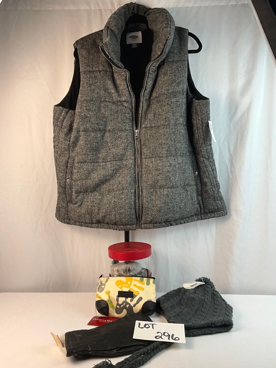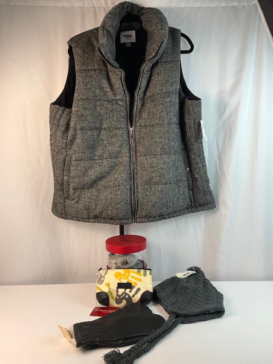 New WIth Tags Dooney & Bourke coin purse, New With Tags Gray Old Navy vest size XXL, New With Tags Gray hat, Lord & Taylor earmuffs and Black leather mittens.