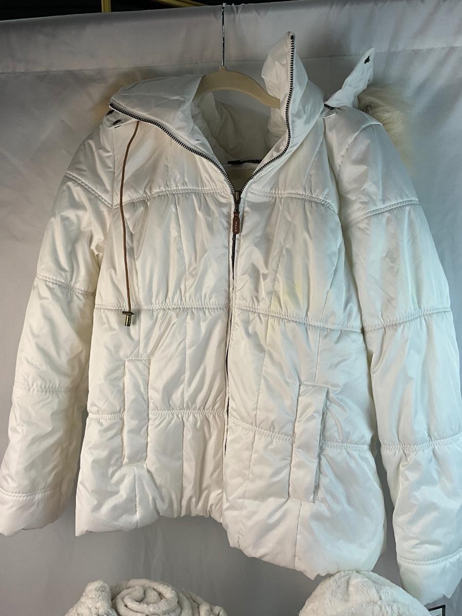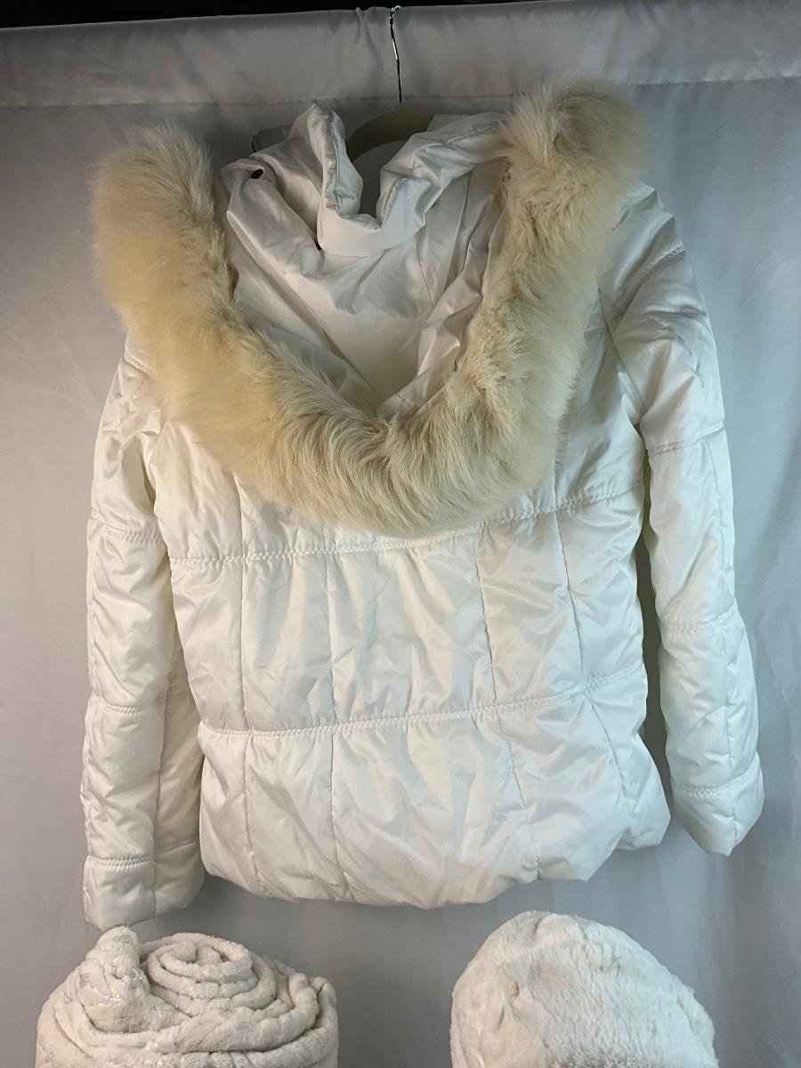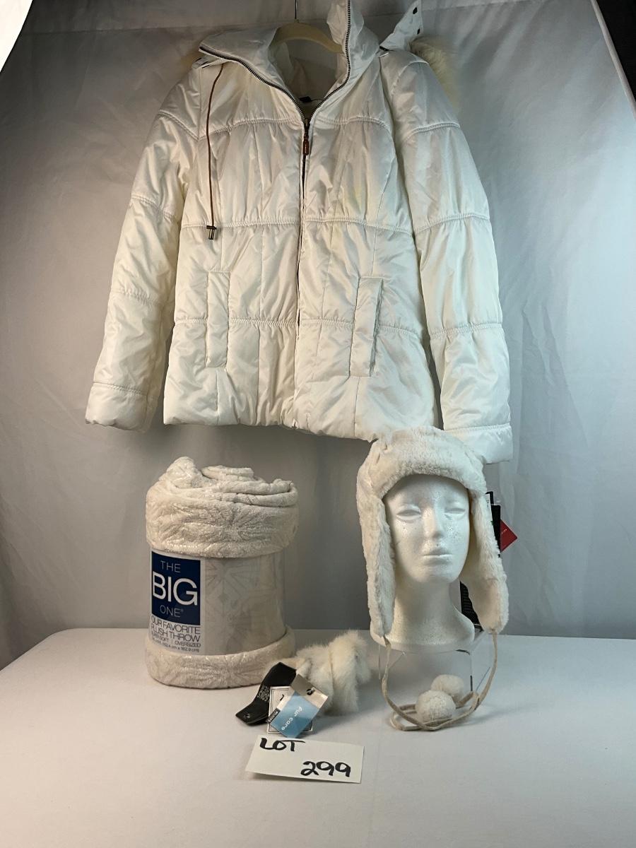 Madison ladies winter coat size large, winter hat, pair of gloves, earmuffs, plush throw blanket.