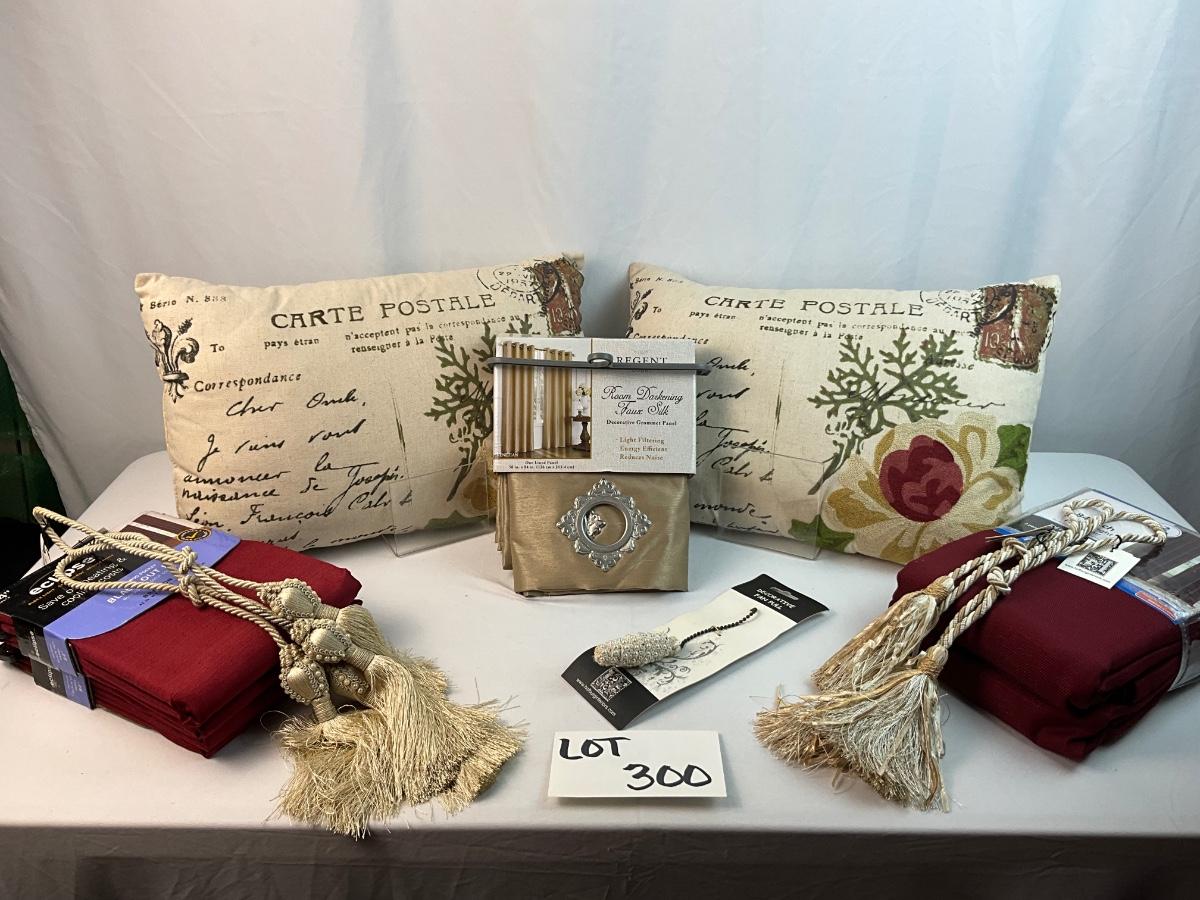 Lot F 300 Pair of Throw Pillows Three Burgundy Curtain Panels Gold Curtain Panel
