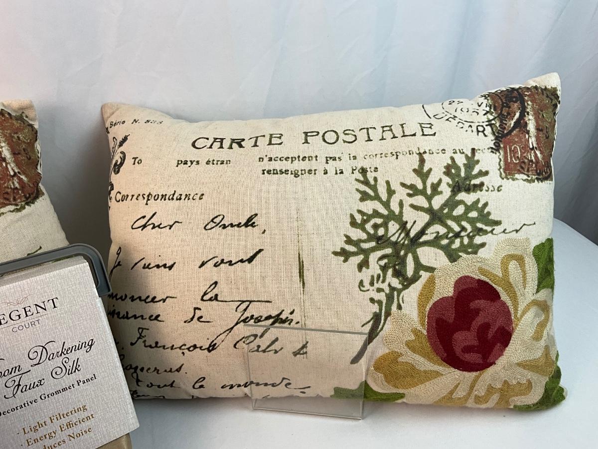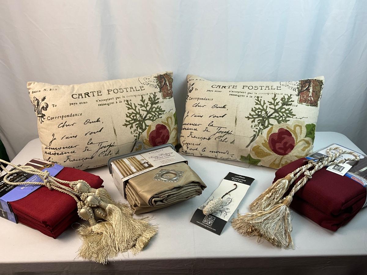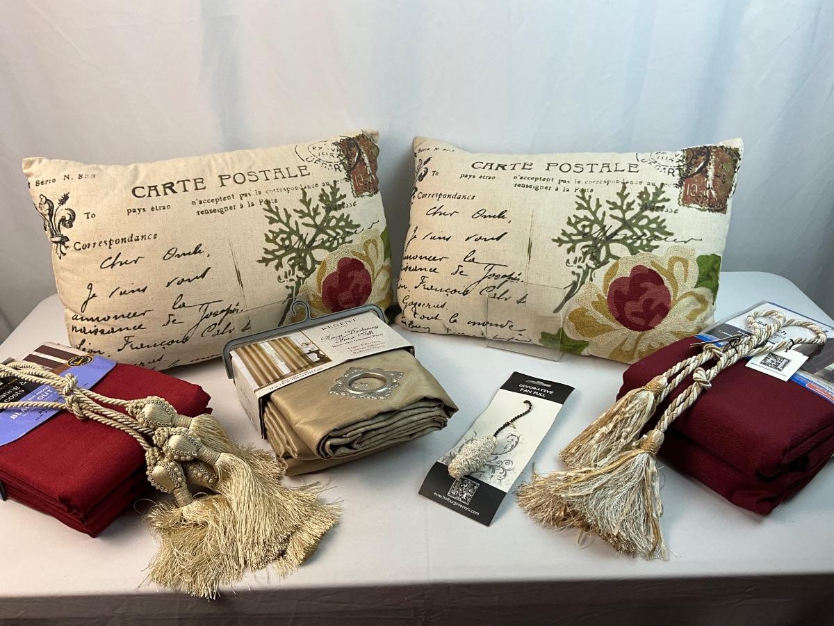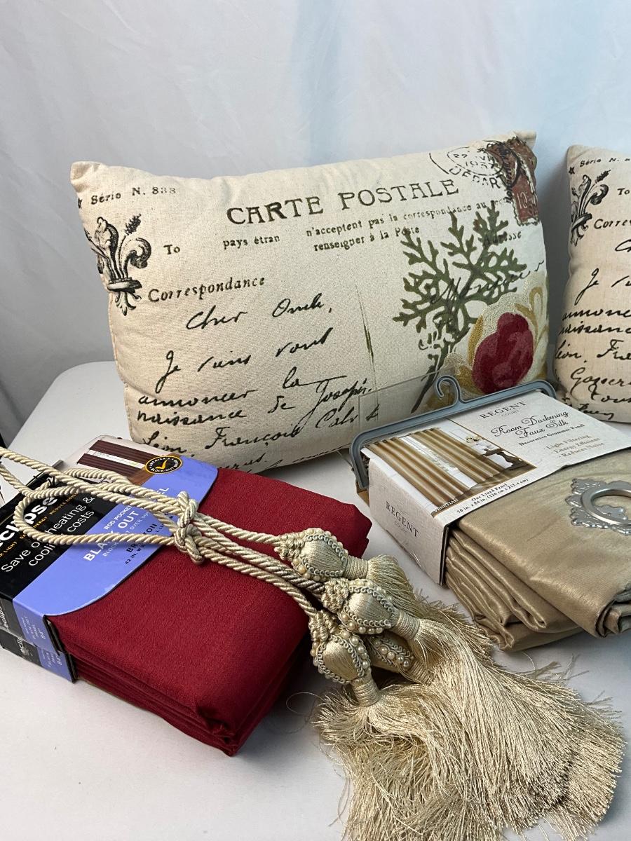 Pair of Carte Postale throw pillows. Three Burgundy Black Out curtain panels measuring 42” wide by 84” long. One Gold light filtering curtain panel measuring 50” wide by 84” long. Pair of Gold curtain tassels.