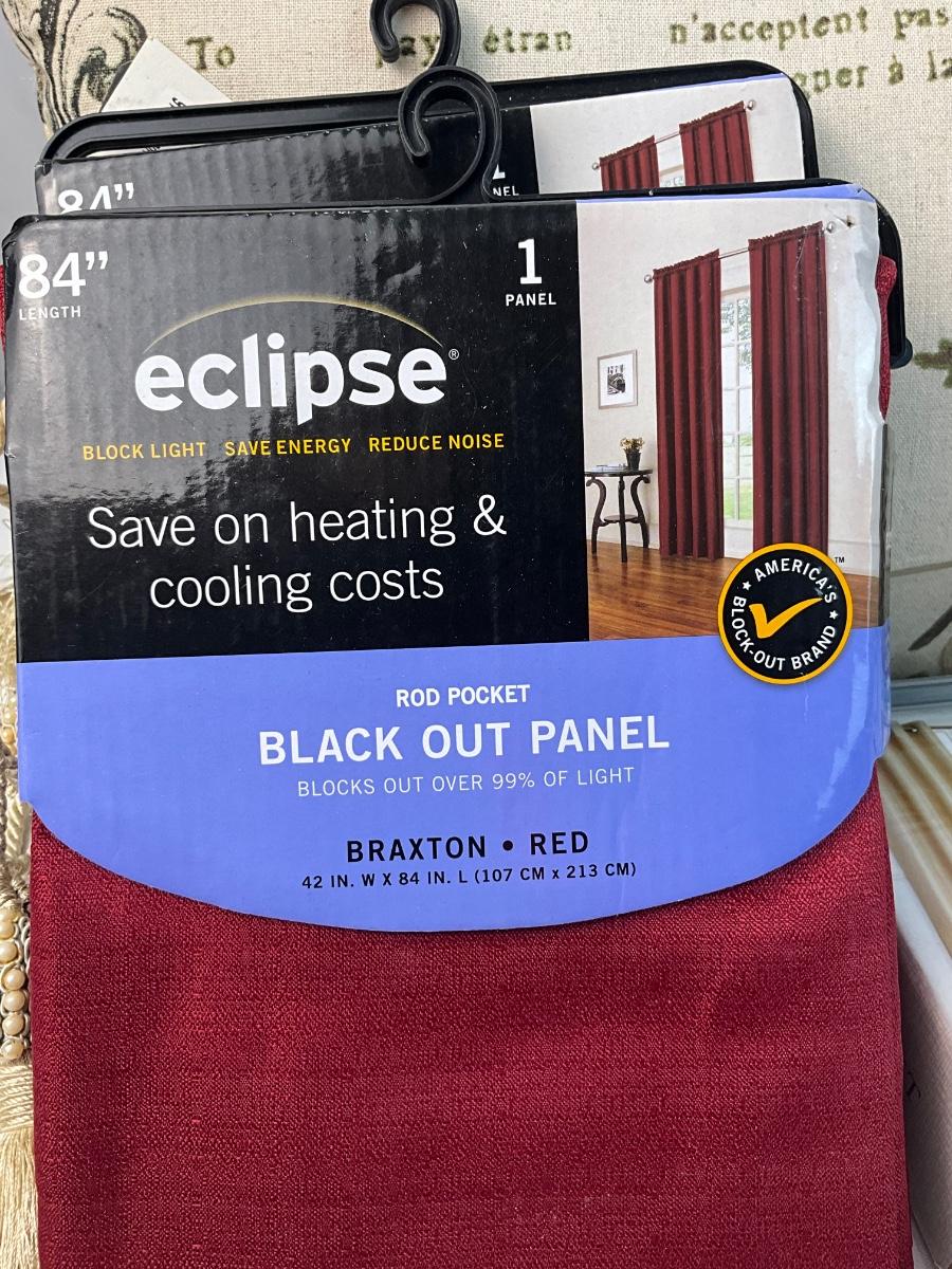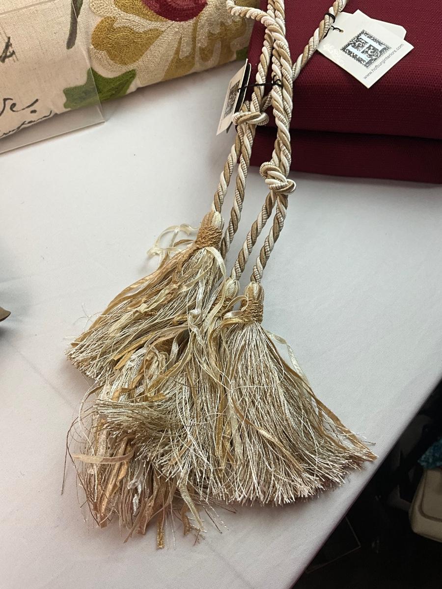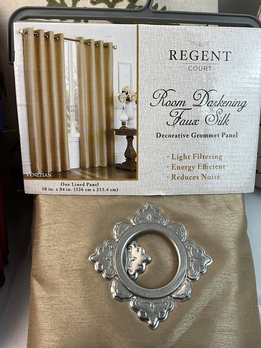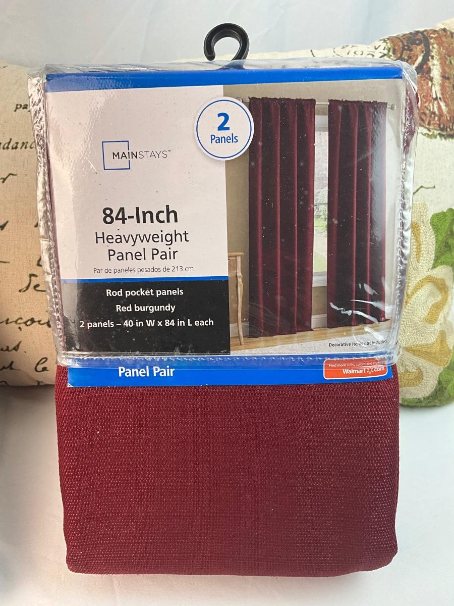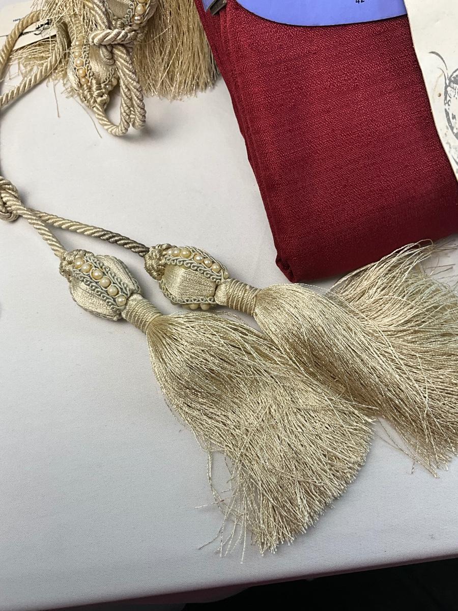 Pair of Carte Postale throw pillows. Three Burgundy Black Out curtain panels measuring 42” wide by 84” long. One Gold light filtering curtain panel measuring 50” wide by 84” long. Pair of Gold curtain tassels.