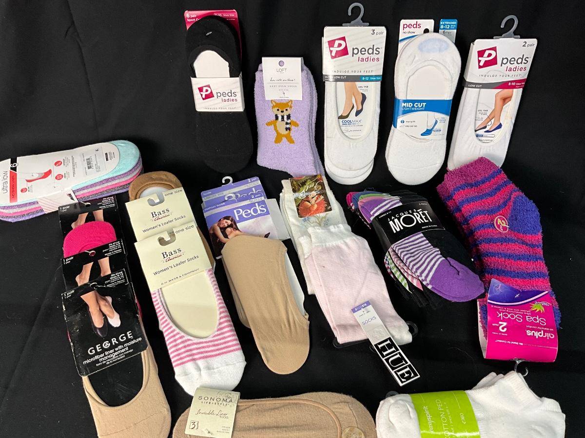Socks are all brand new, there are 50 pair of assorted styles such as peds, loafer socks, dress socks and athletic socks. Brands included but not limited to are Easy Spirit, Peds, Bass, Loft, AVIA.
