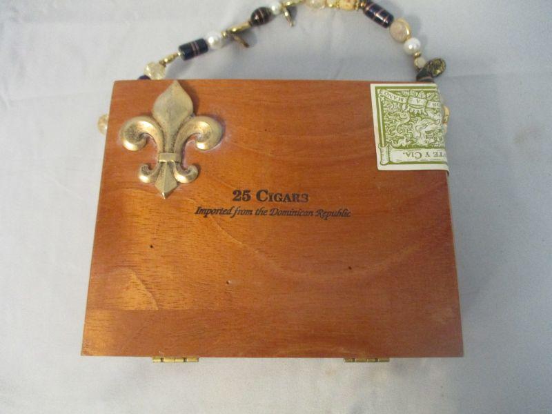 This is a vintage wood cigar box that was re-purposed into a cute purse that is 7.5" x 6" x 2.5". I don't see any issues.