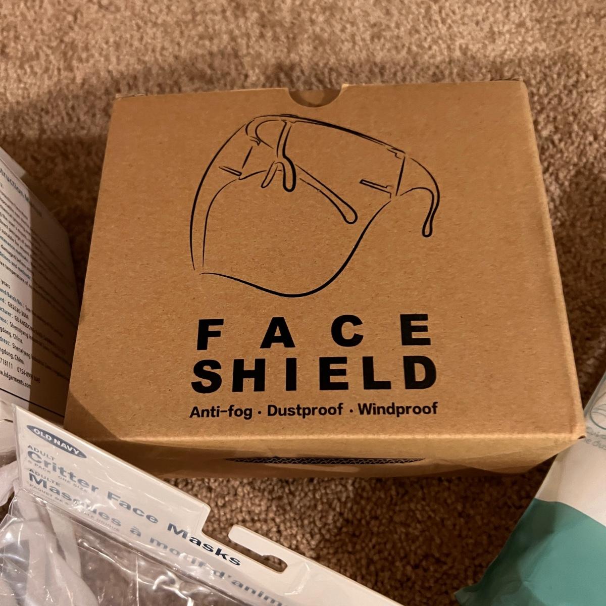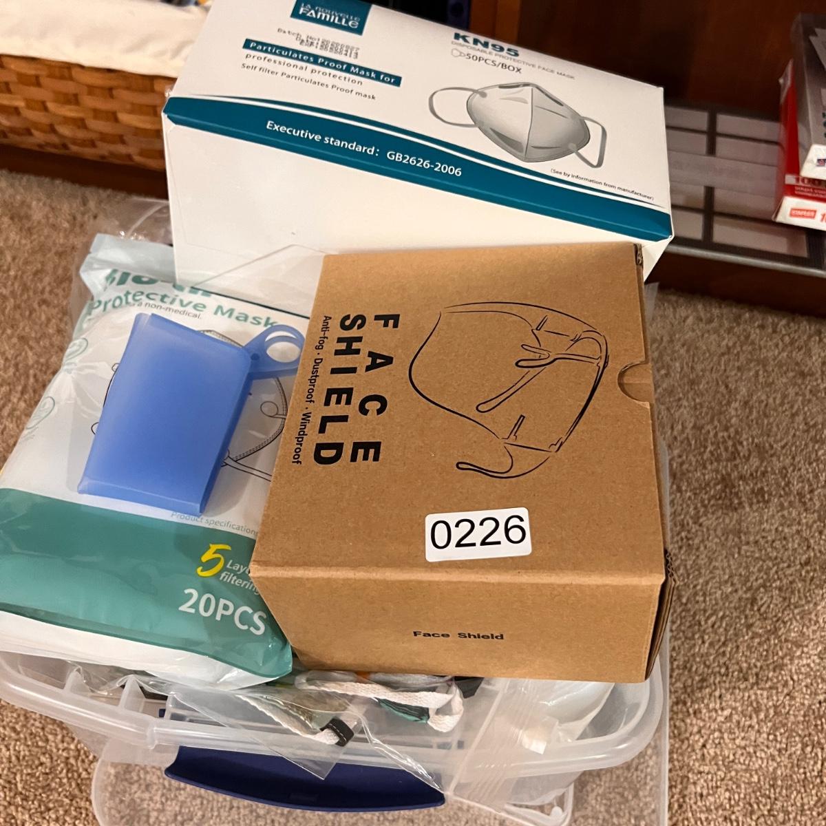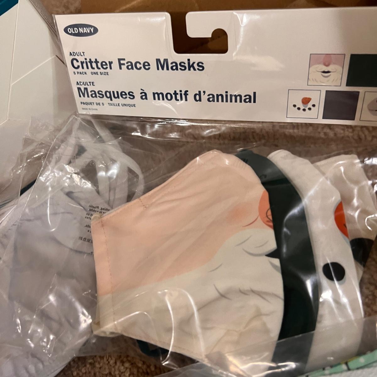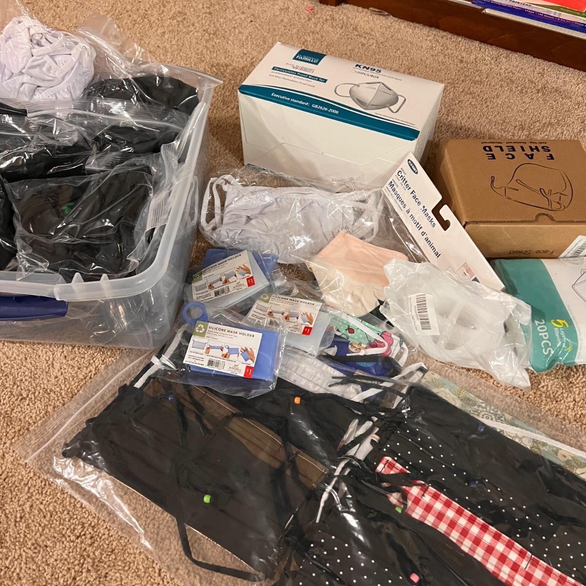 Boxes of disposable face masks, cloth masks, silicone mask holders, Old Navy critter face masks, storage box included.