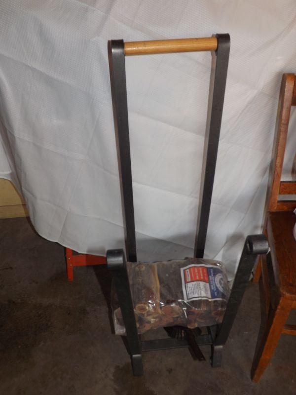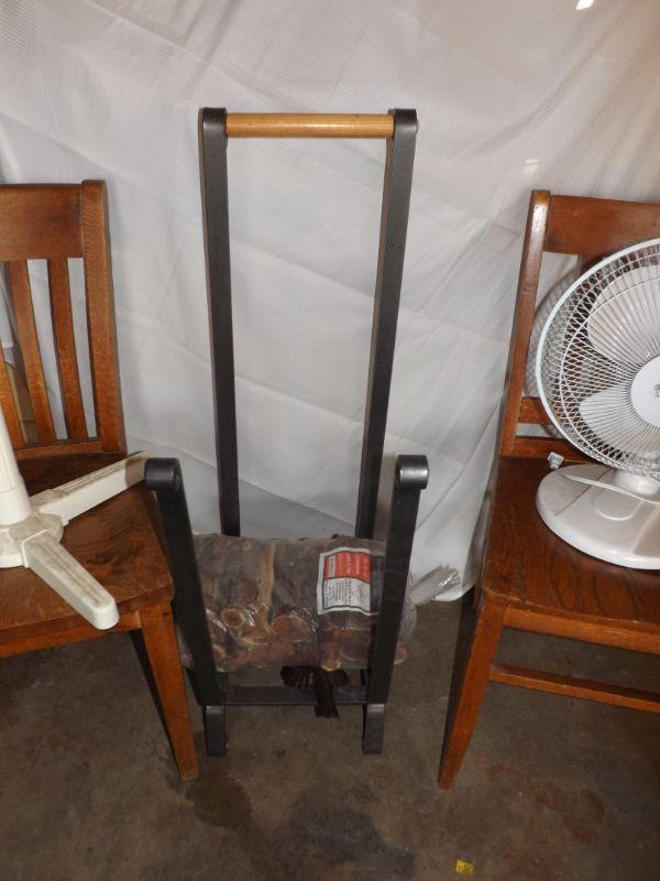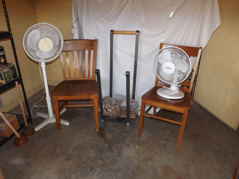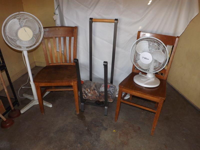 TWO FANS, TWO MATCHING ANTIQUE WOODEN CHAIRS (ONE NEEXDS BACK TIGHTNING), IRON FIREWOOD RACK WITH A SMALL BUNDLE OF WOOD!