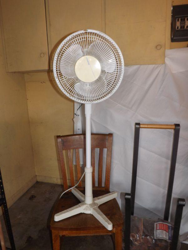 LOT 409 FANS, FIREWOOD RACK, OLD CHAIRS