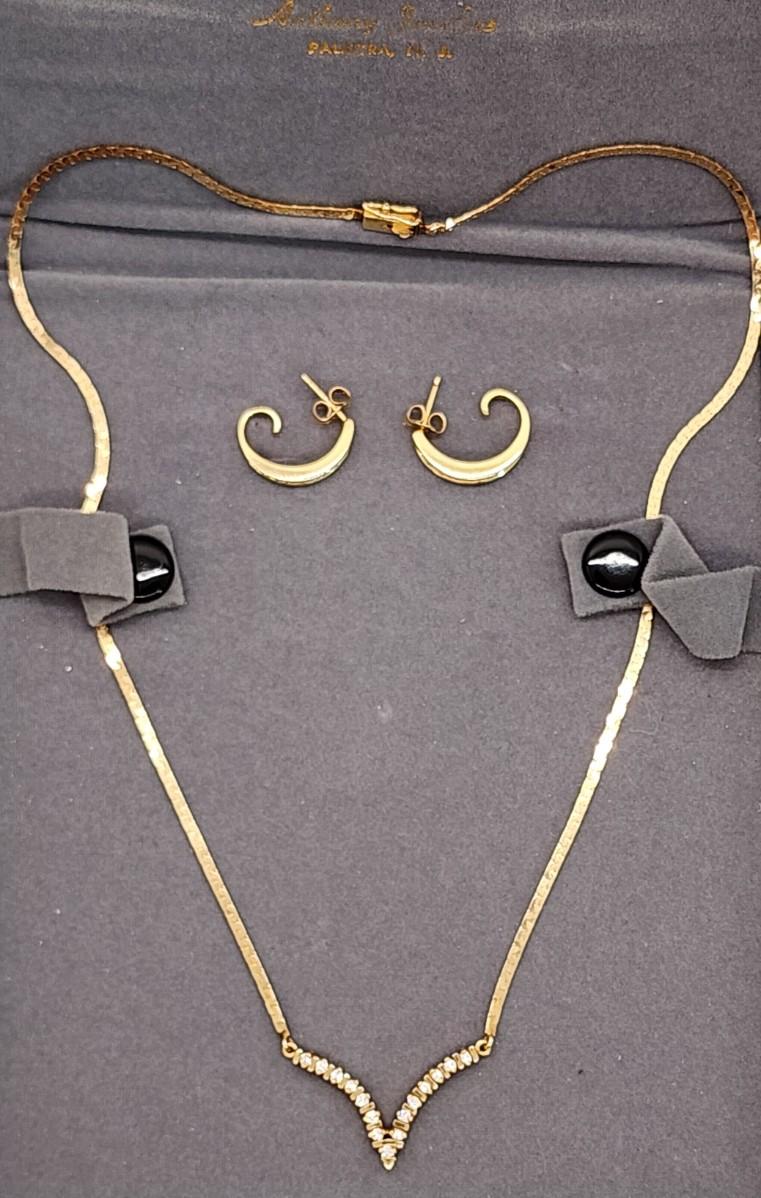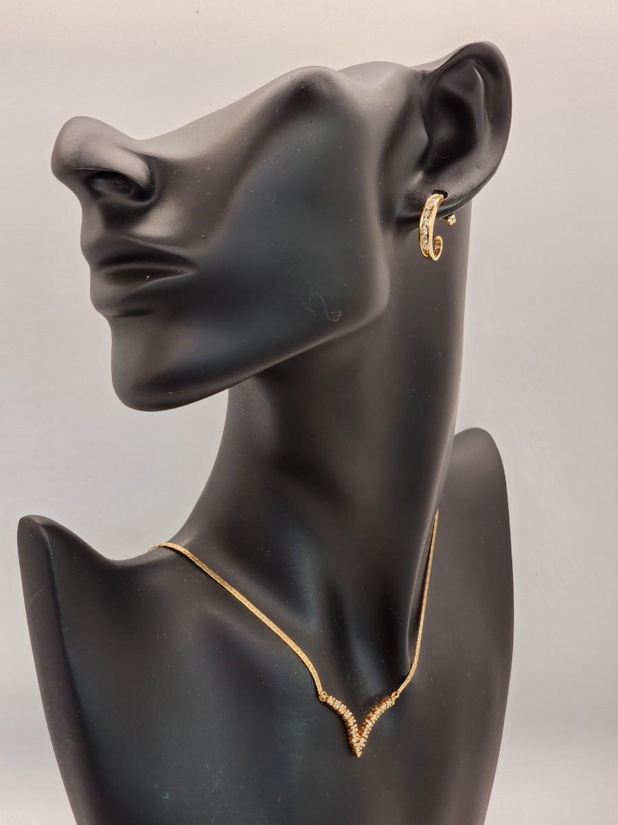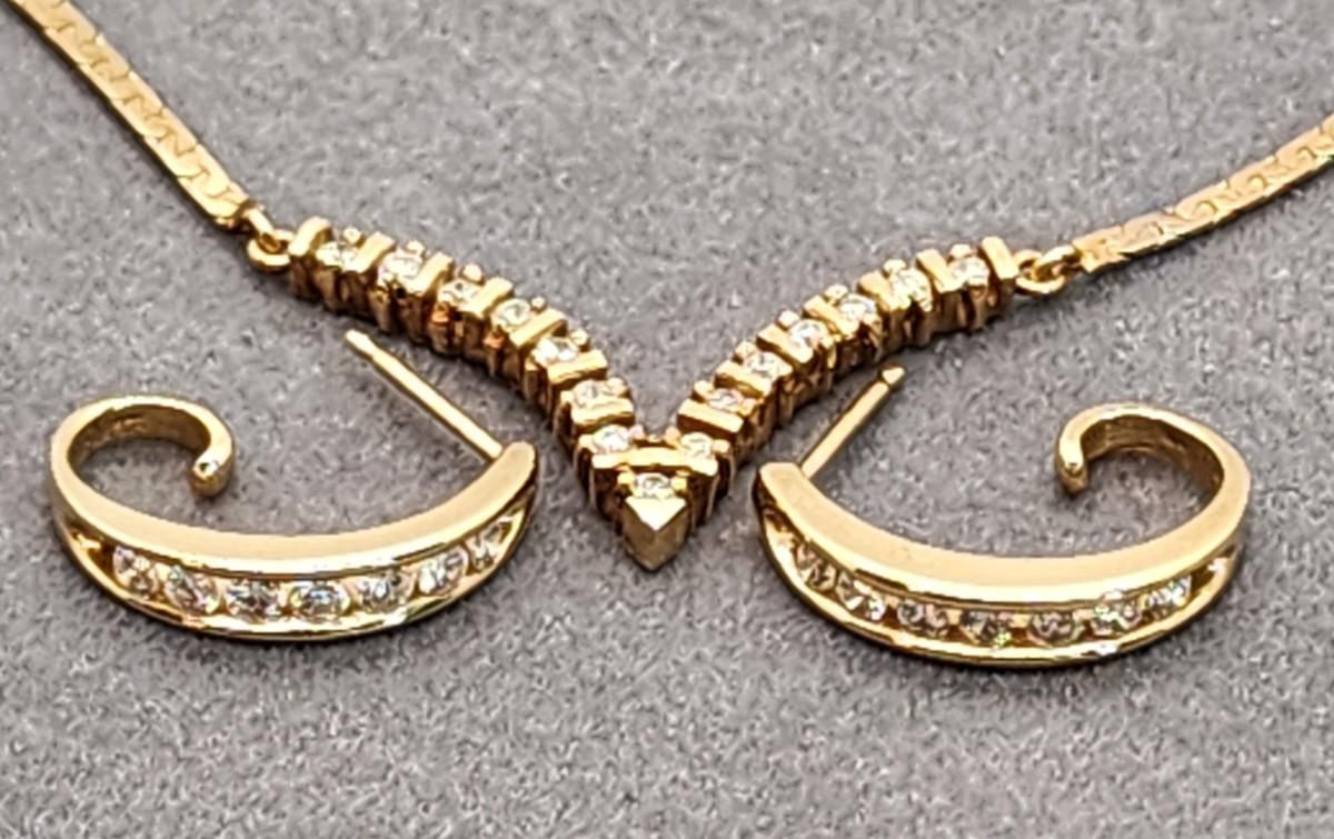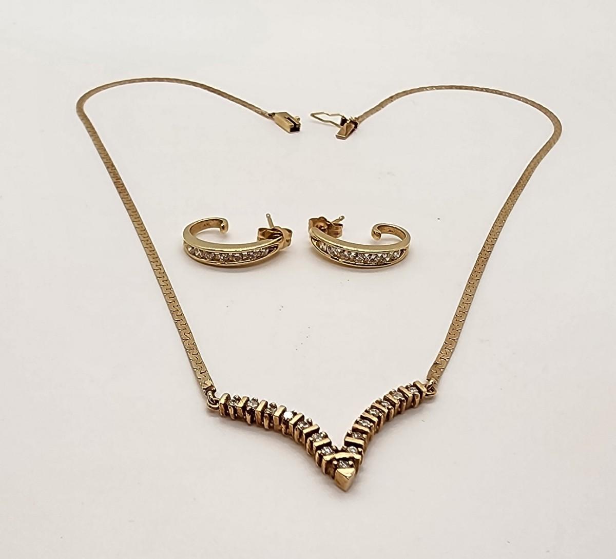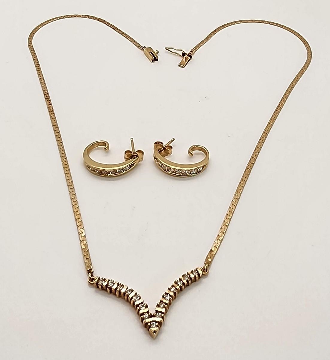 Lot FJ 300: 8.8gtw 14k yellow Gold Herringbone Channel Set Diamond V Necklace and matching earrings