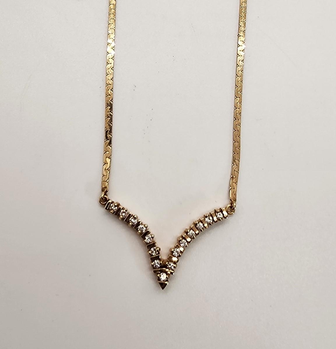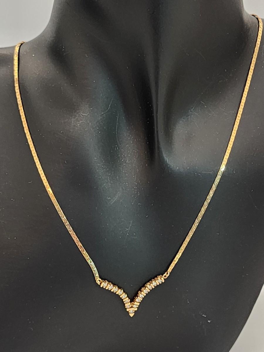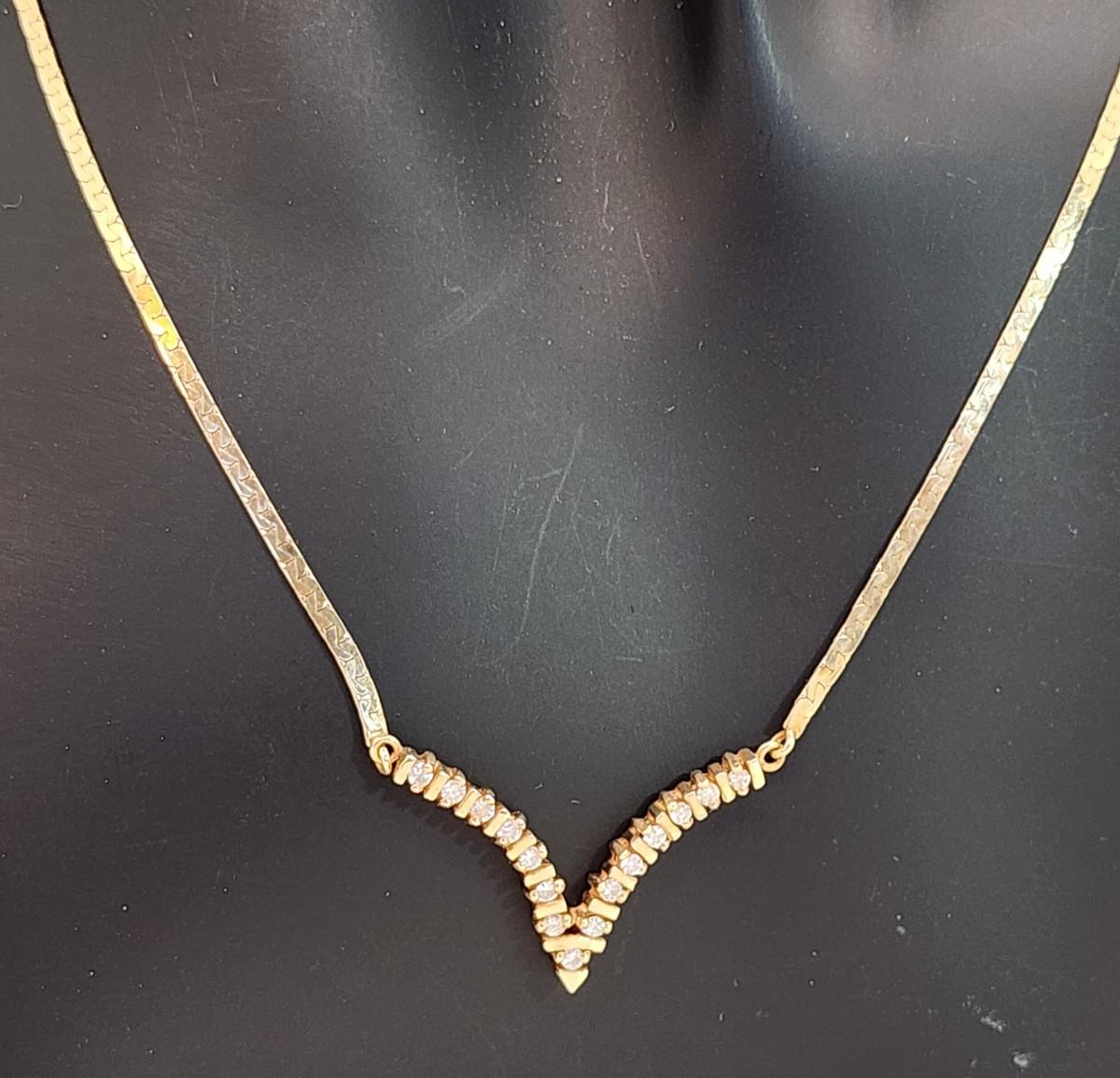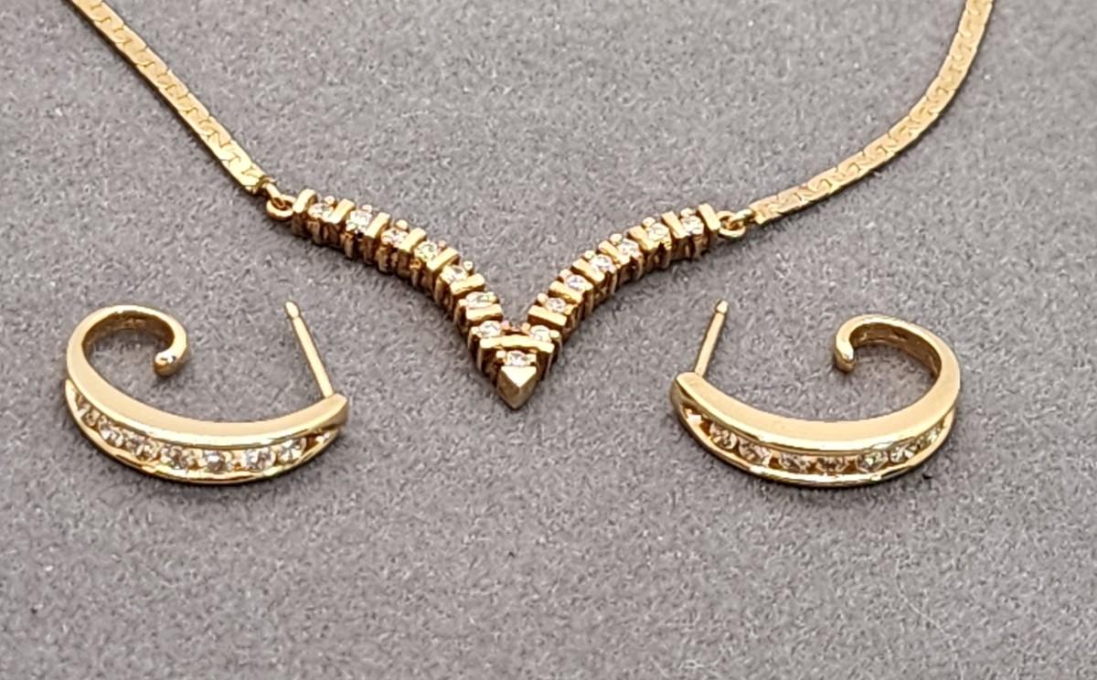Lot FJ 300: 8.8gtw 14k yellow Gold Herringbone Channel Set Diamond V Necklace and matching earrings