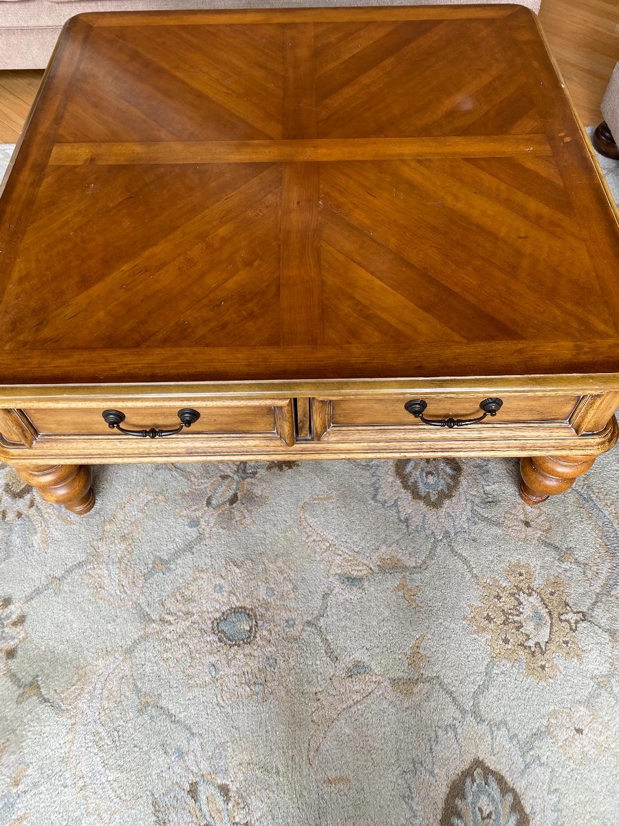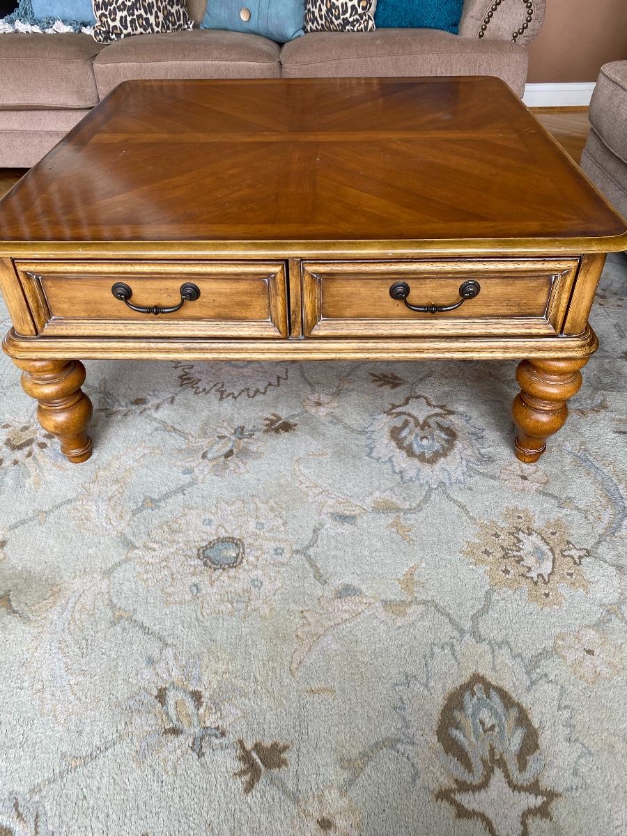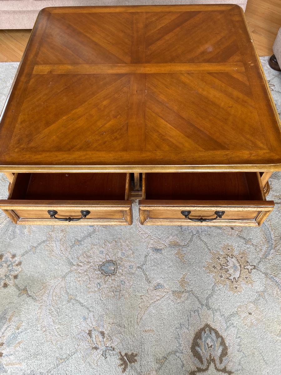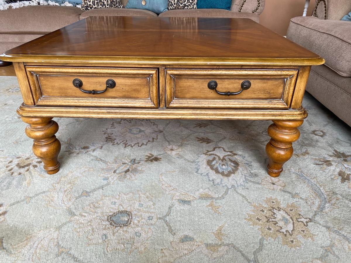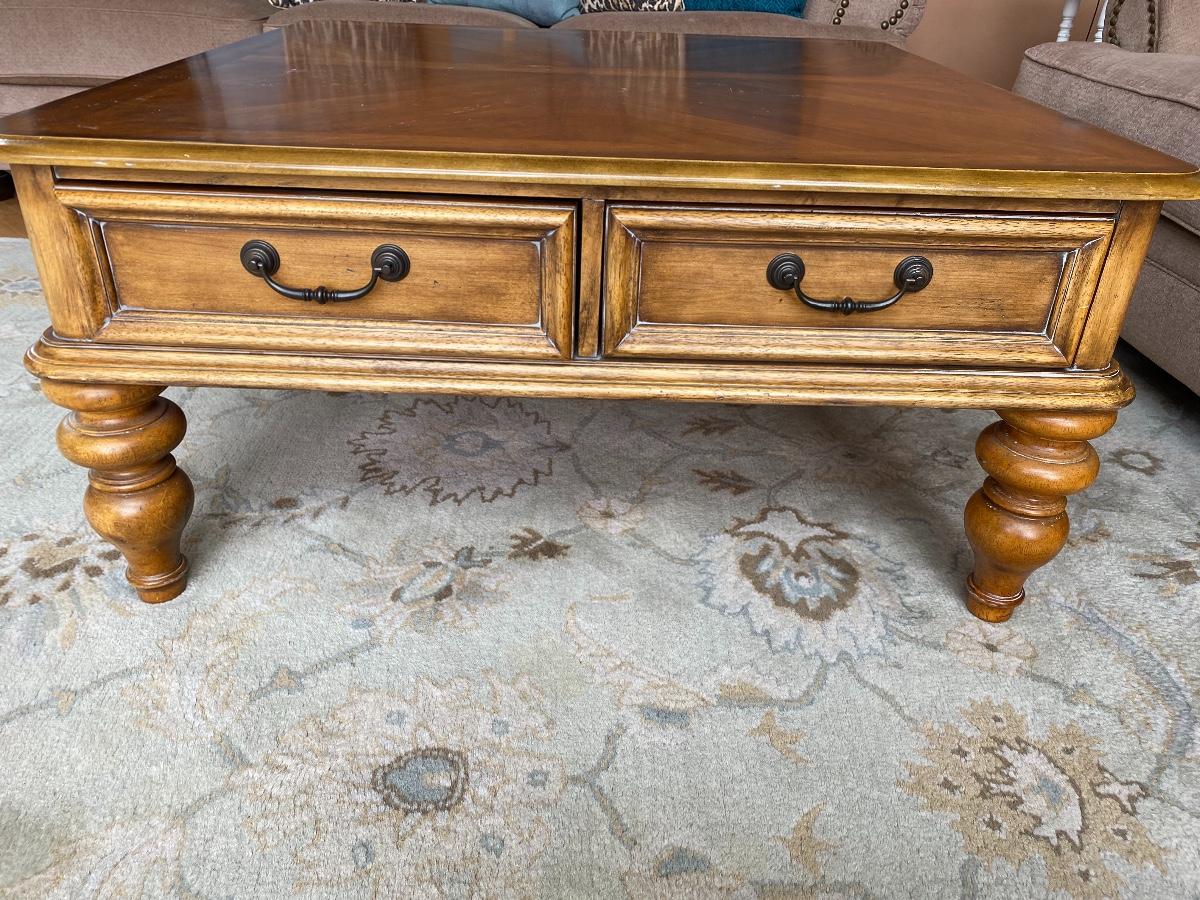 Stunning design that can be mixed with any decor, this has a new feel with old character, solid wood coffee table w two storage drawers. 42x20 Please see all pictures for content of the lot, condition of the lot, and measurements if taken. Pictures are the best representation of the items listed and items are untested unless indicated in description. Thank you for looking and have fun bidding!
