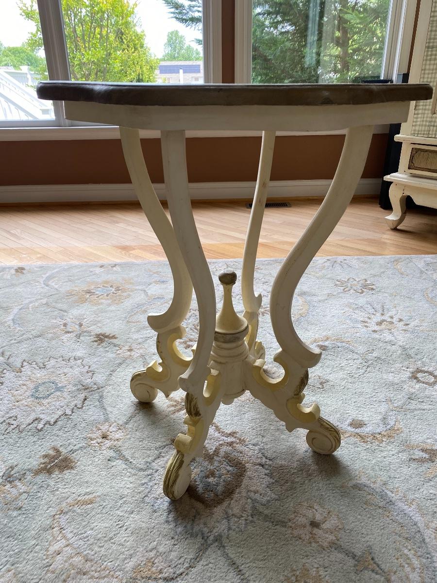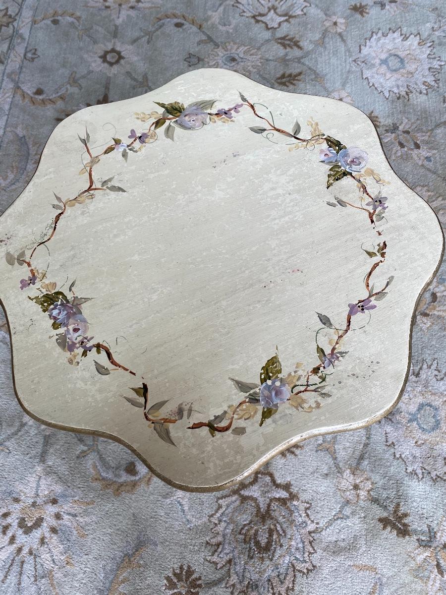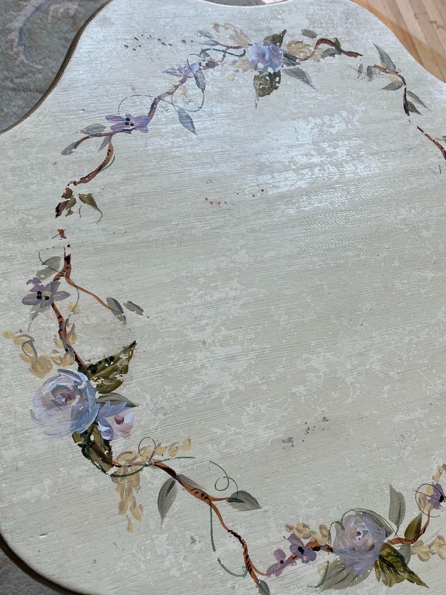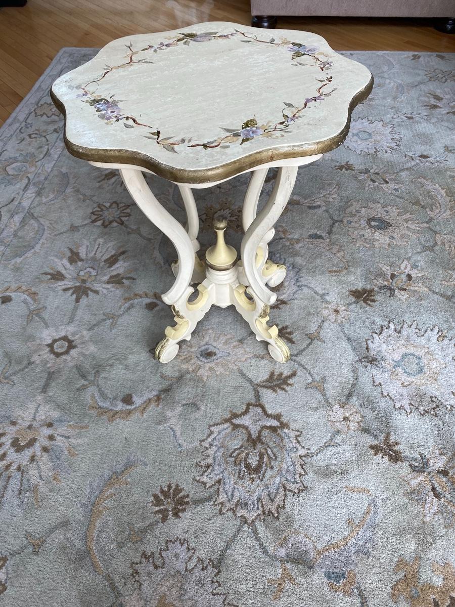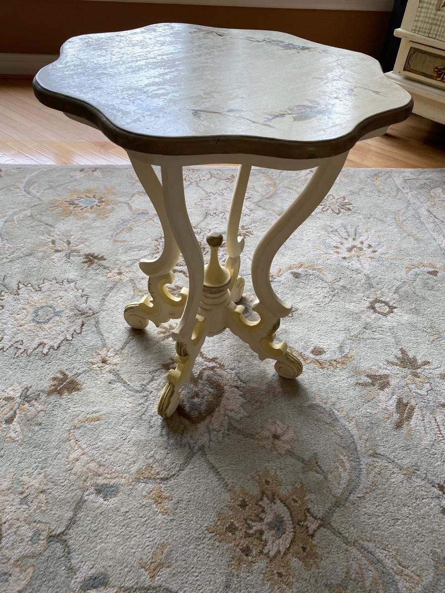 Side table has hand painted floral design. 24x28 Please see all pictures for content of the lot, condition of the lot, and measurements if taken. Pictures are the best representation of the items listed and items are untested unless indicated in description. Thank you for looking and have fun bidding!
