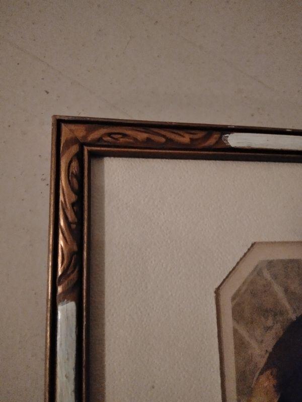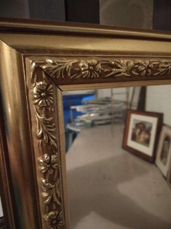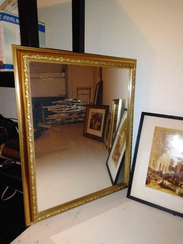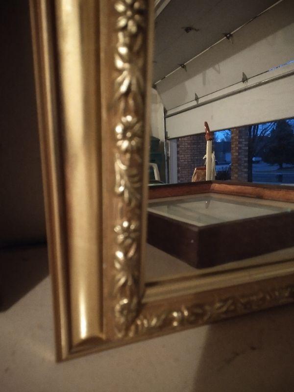 FRAMED ARTWORK AND GOLD FRAMED MIRROR WITH DAINTY FLOWERS.