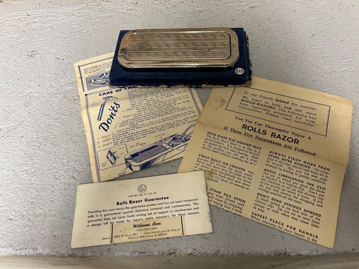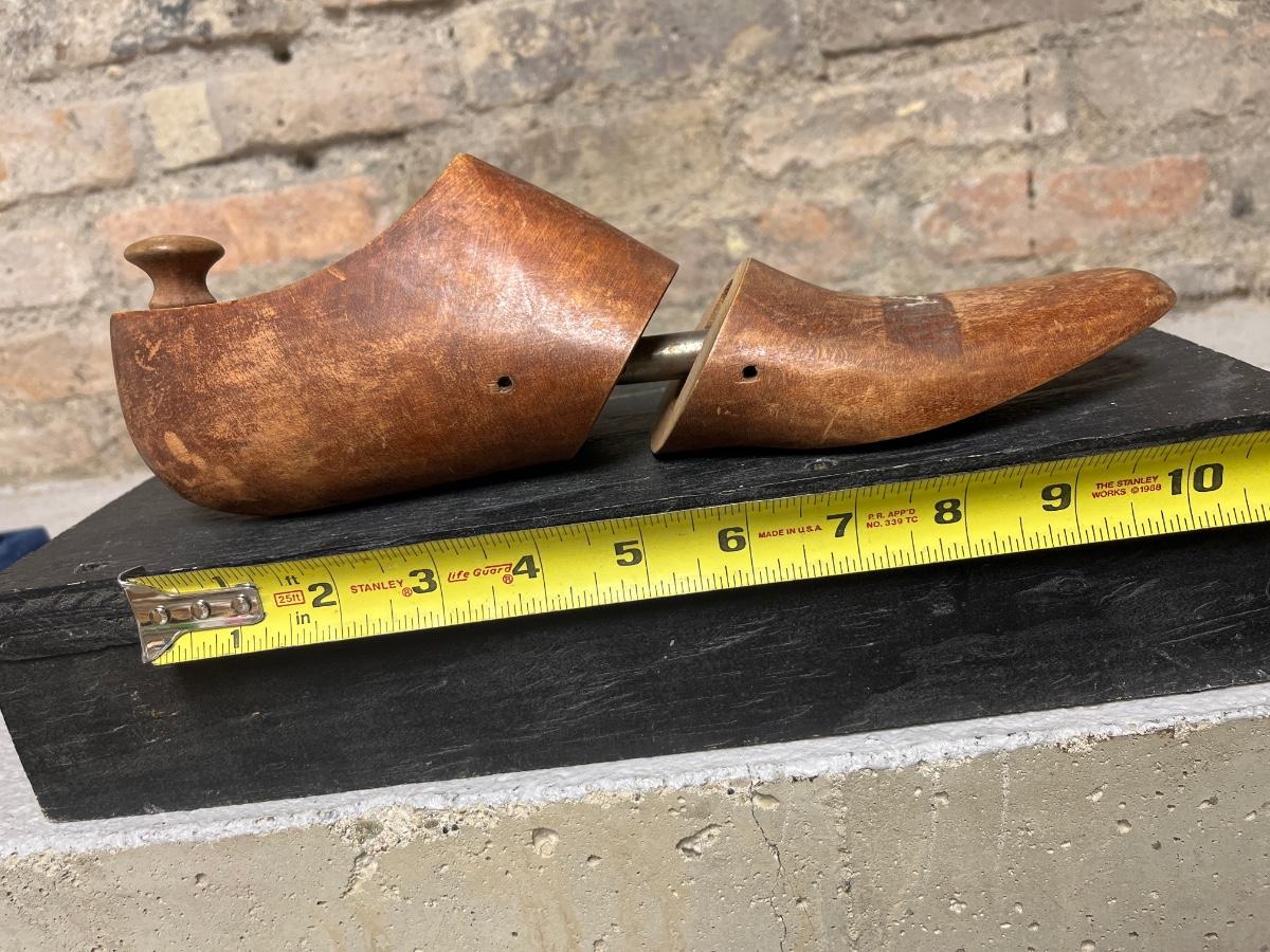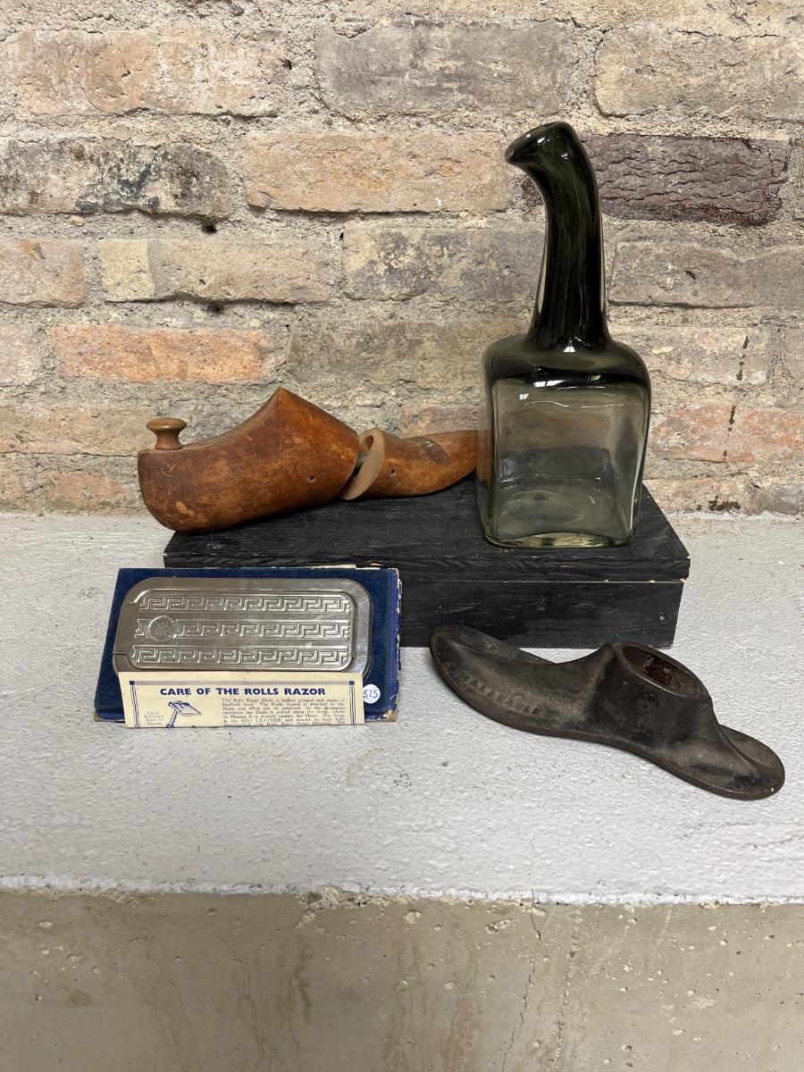 Articulated wooden shoe mold, cast iron she mold, square glass jug, and very unique Rolls razor in the box
