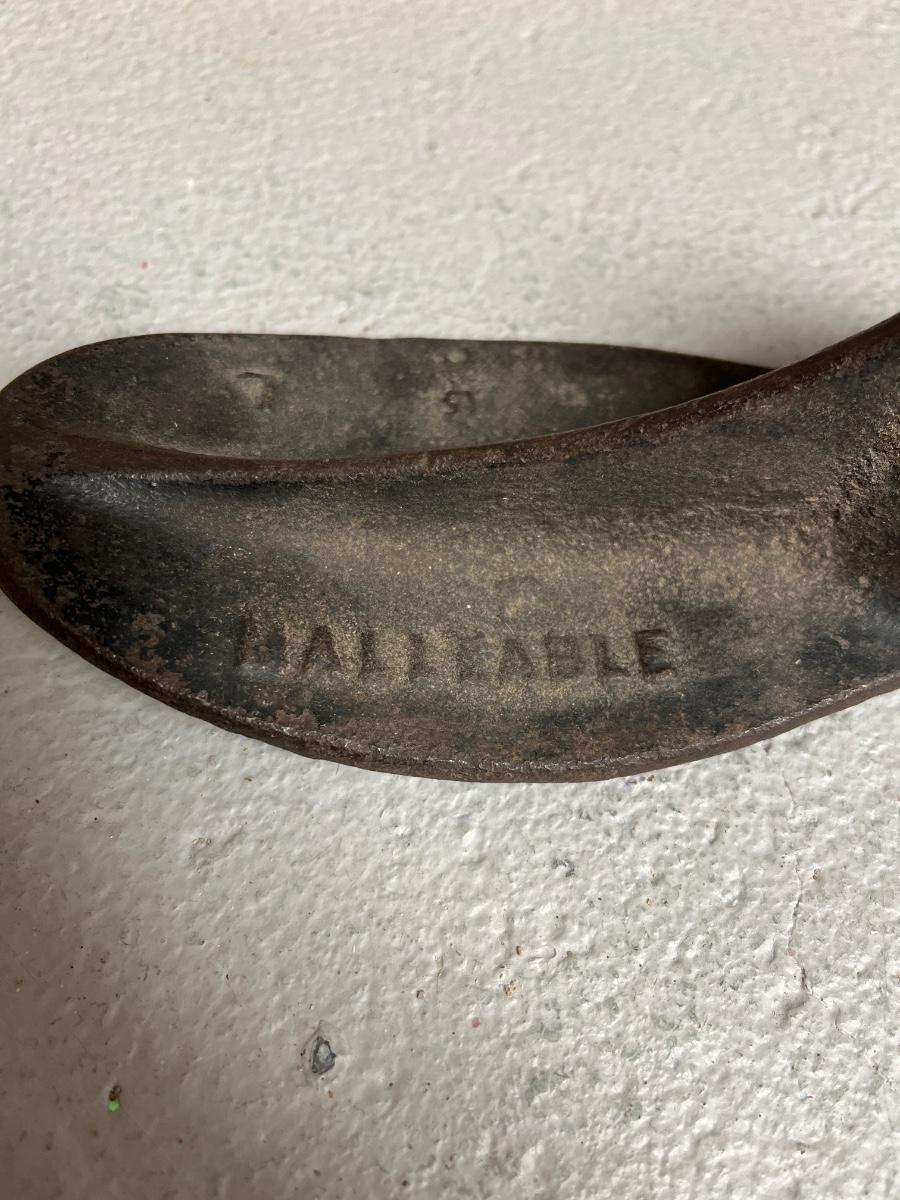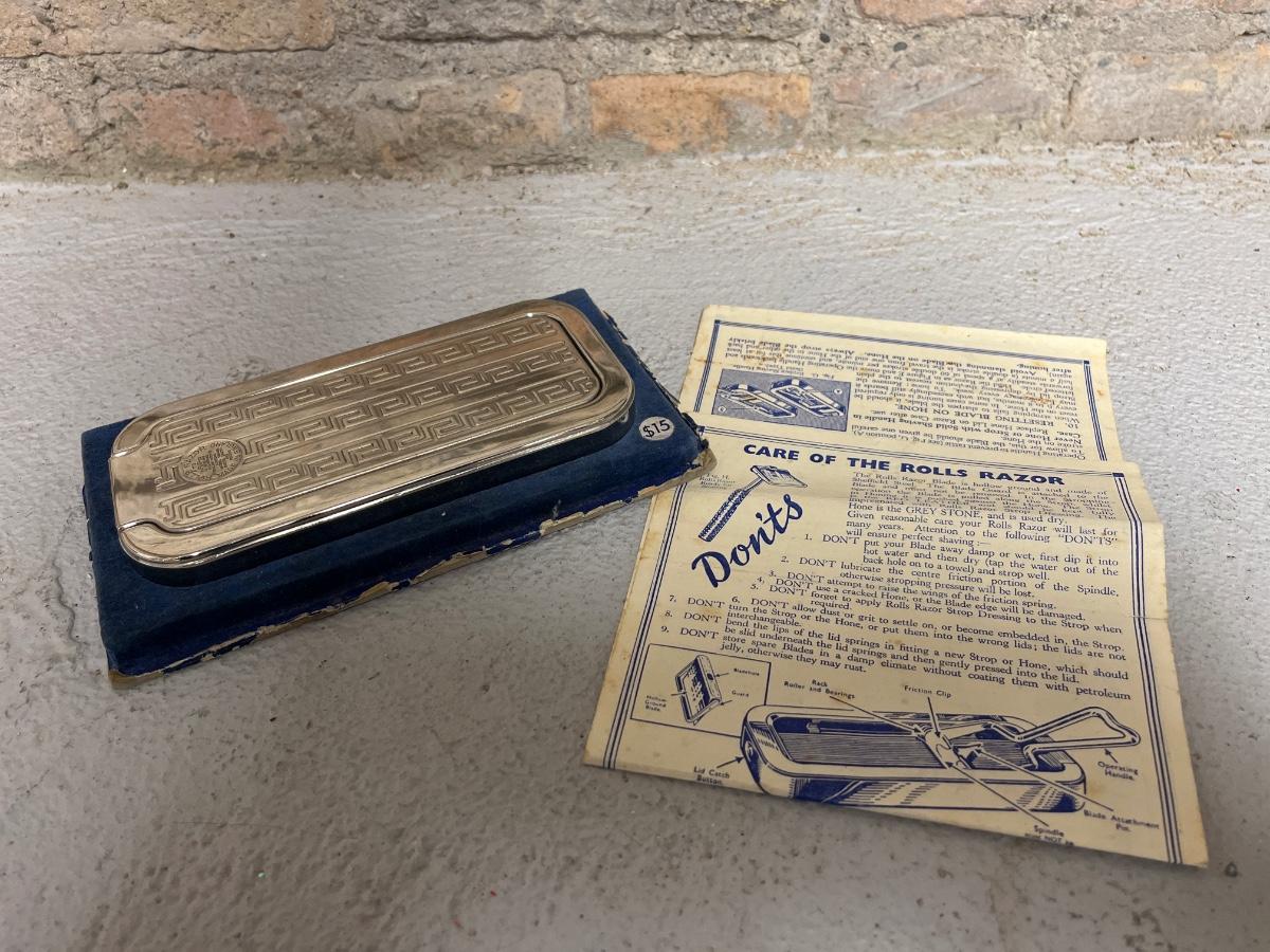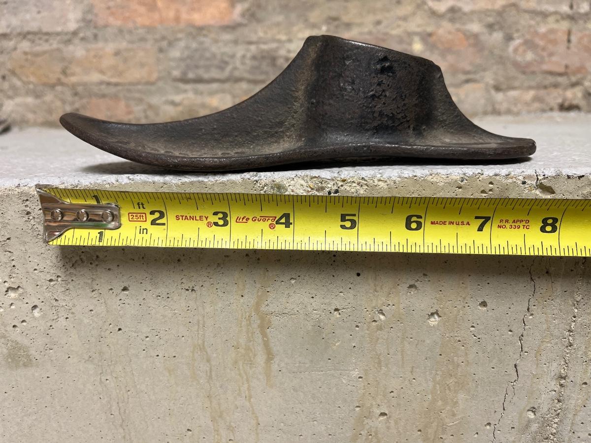 Articulated wooden shoe mold, cast iron she mold, square glass jug, and very unique Rolls razor in the box
