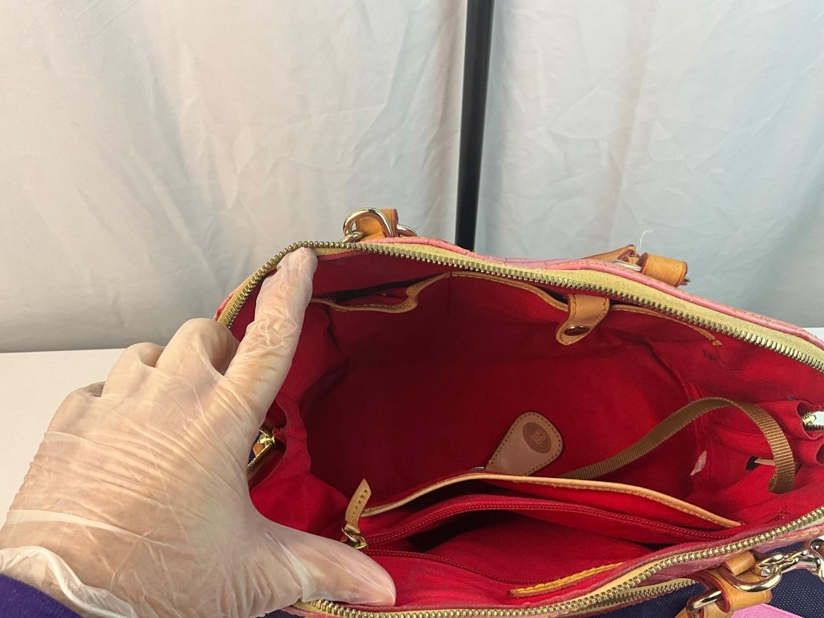 Dooney & Bourke croc embossed leather satchel with shoulder strap. Has some signs of use on inside (please see photos), Keychain and two wallets.