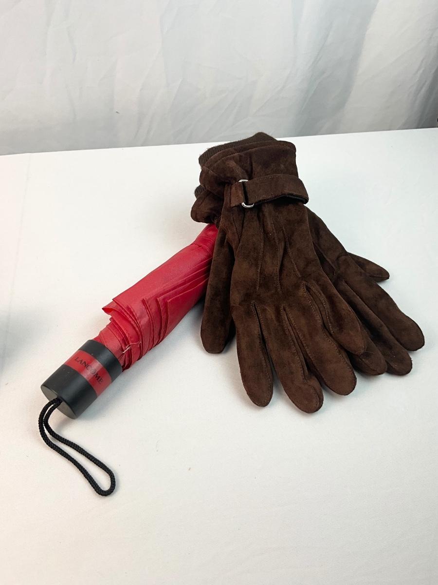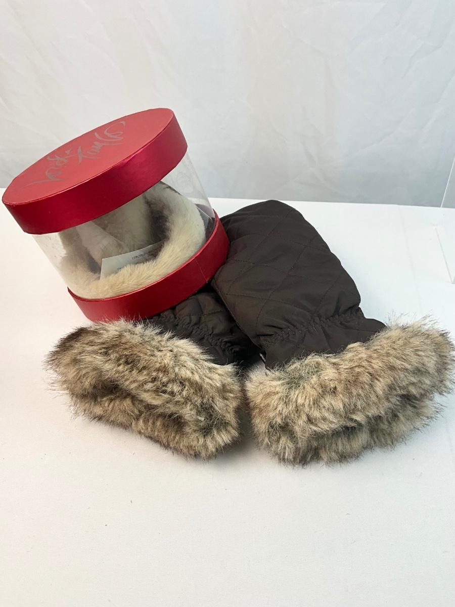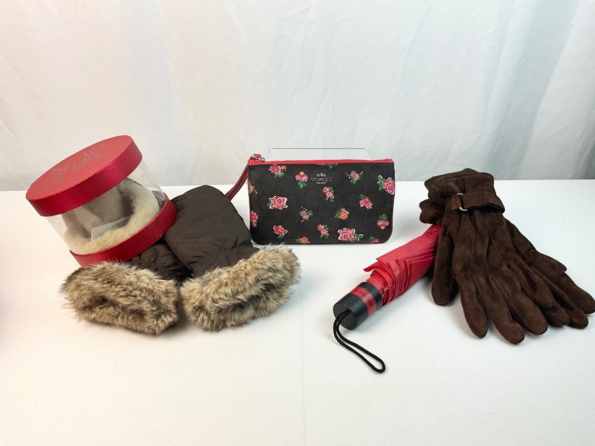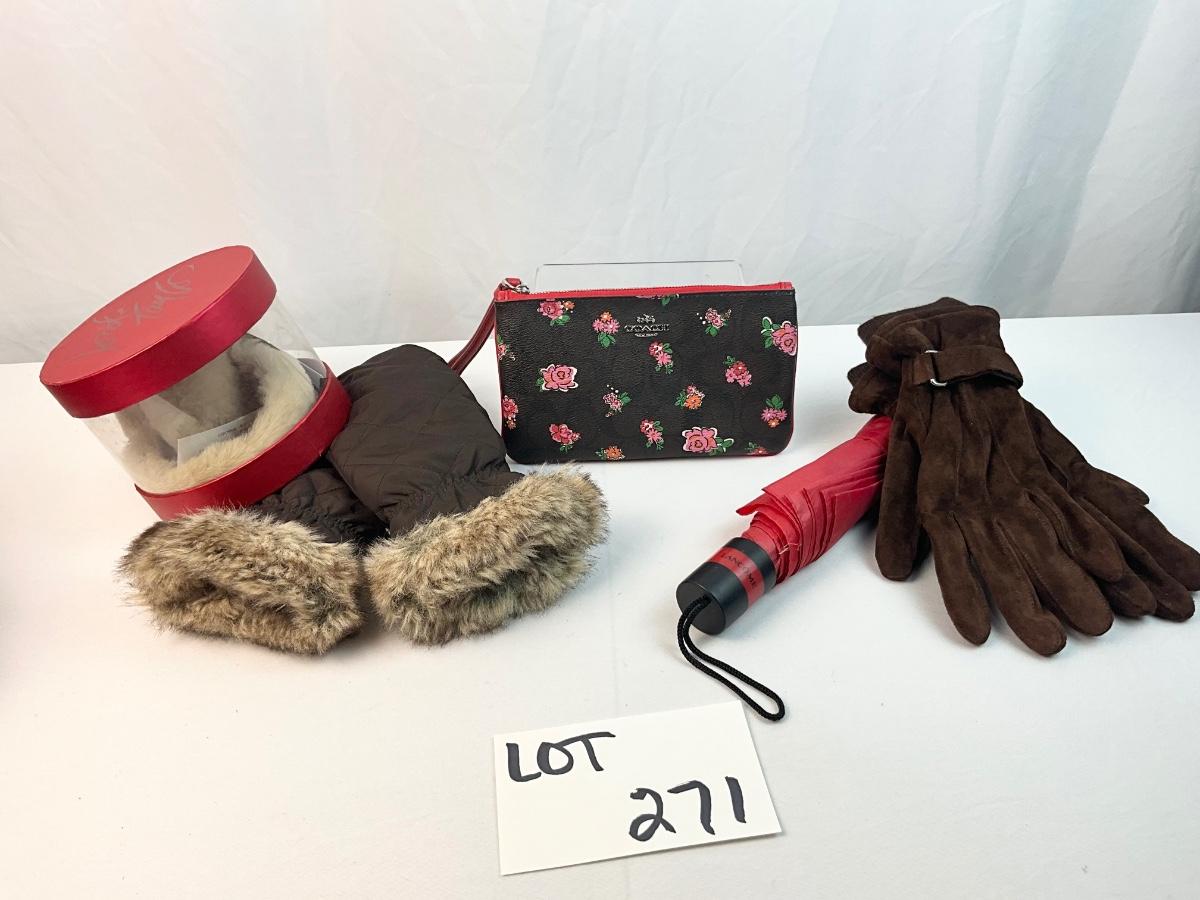 New With Tags Coach Floral wristlet. Pair of suede gloves. Pair of faux fur trim gloves, ear muffs and umbrella.
