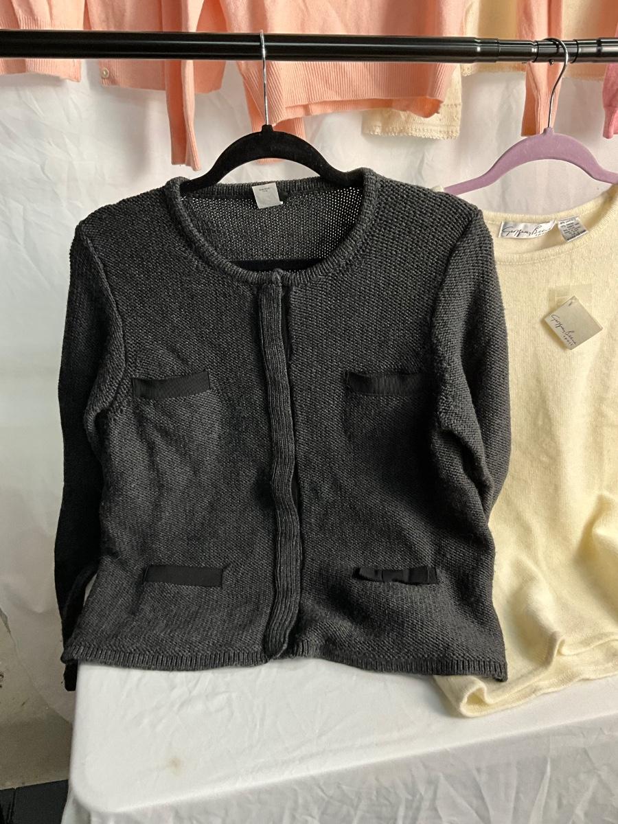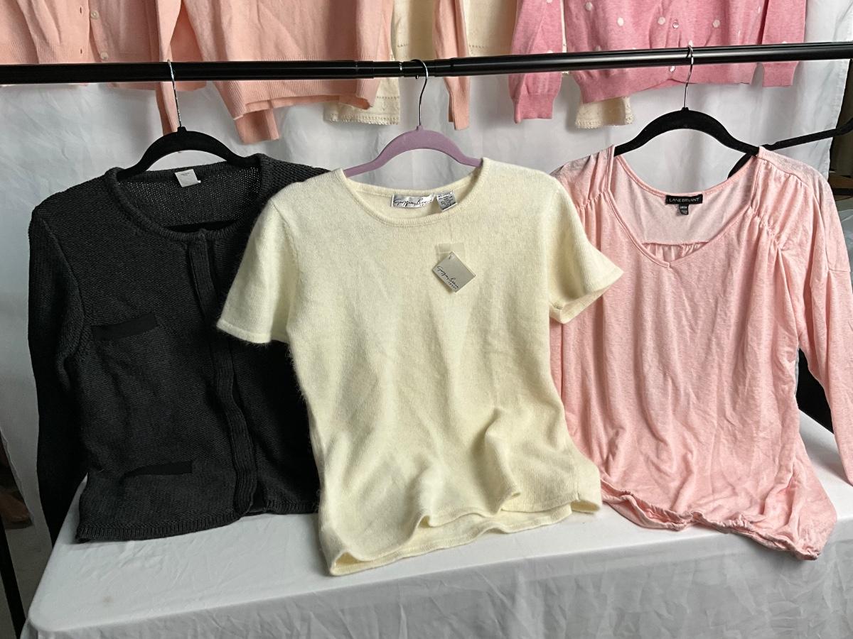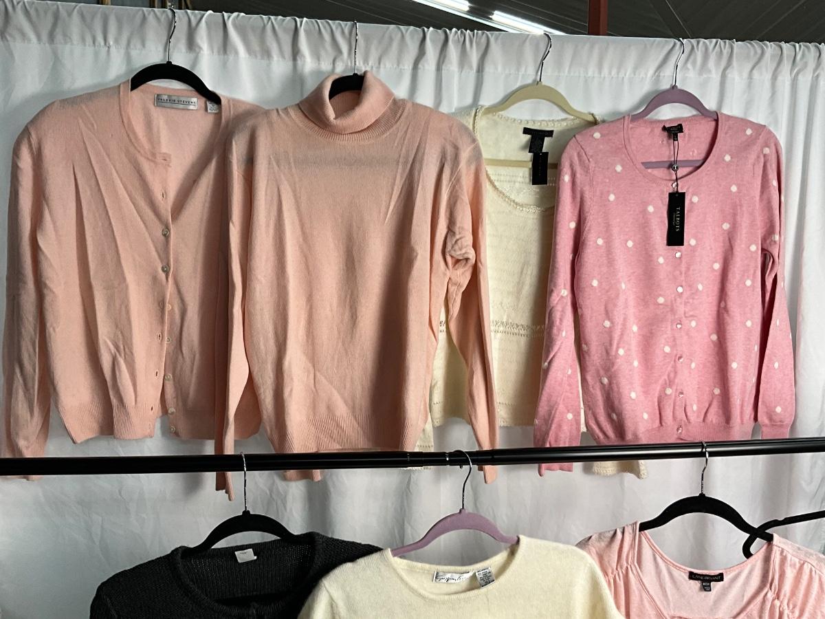 The lot contains 7 tops, some are cashmere, all sized large. Brands included but not limited to are Geoffrey Beene, J. Crew, Talbots, The Limited and more.