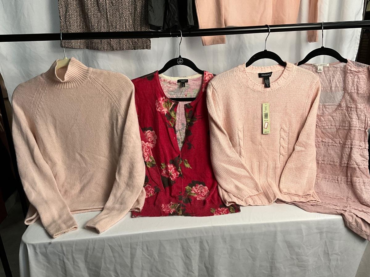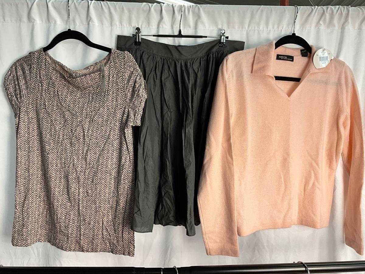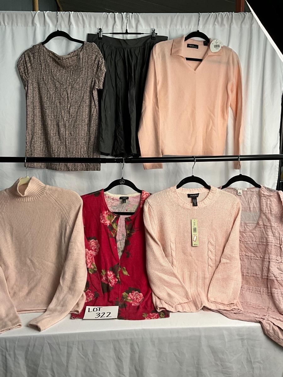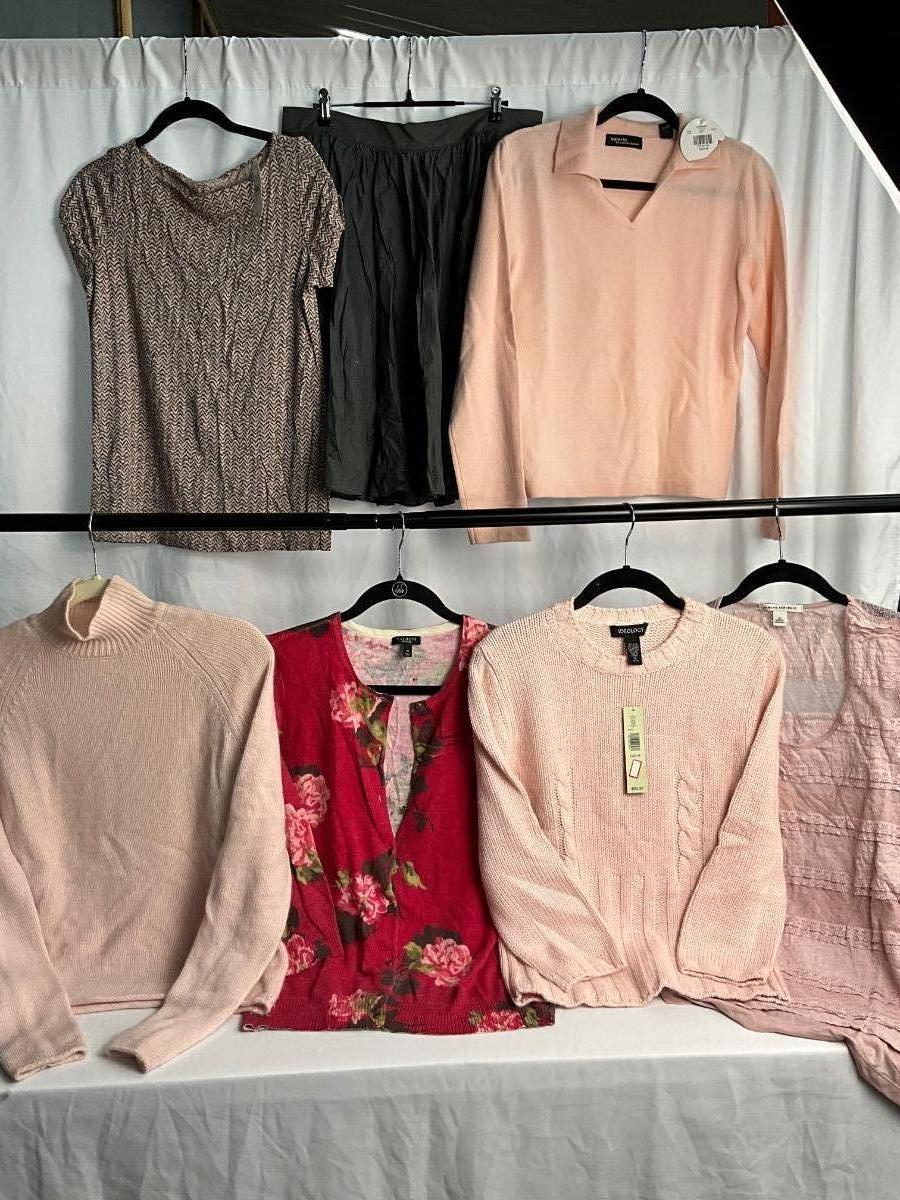 The lot contains 7 items, most are new with tags. All items are a size large except for one skirt that is a size 12. Brands included in this lot but are not limited to are Loft, J. Crew, Valerie by Valerie Stevens, Lord & Taylor (cashmere) and more.