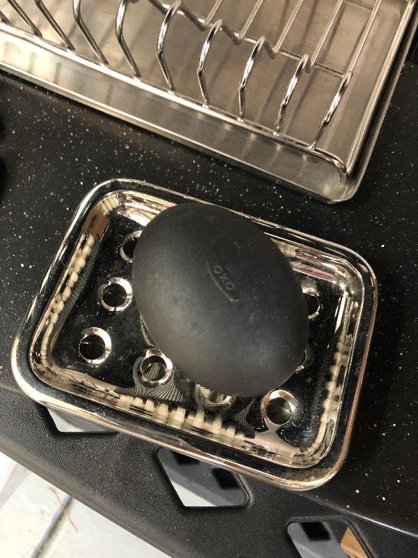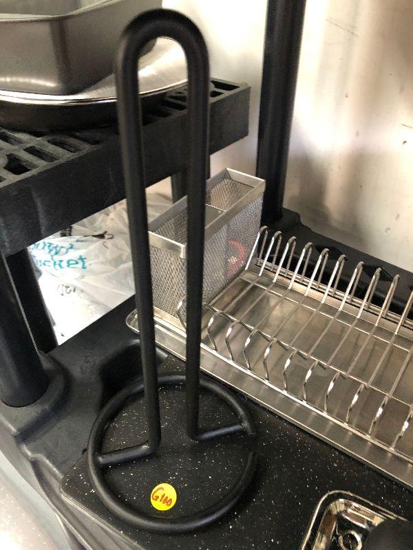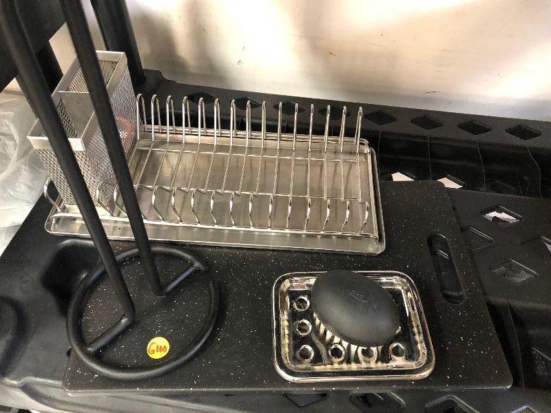 Black and silver kitchen items, dish drainer, paper towel holder, cutting board, and a scrub brush on silver tray. Bring container for moving.