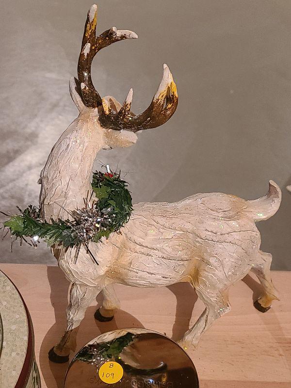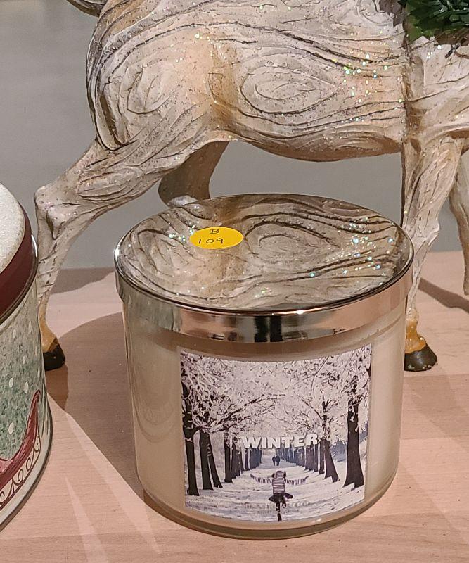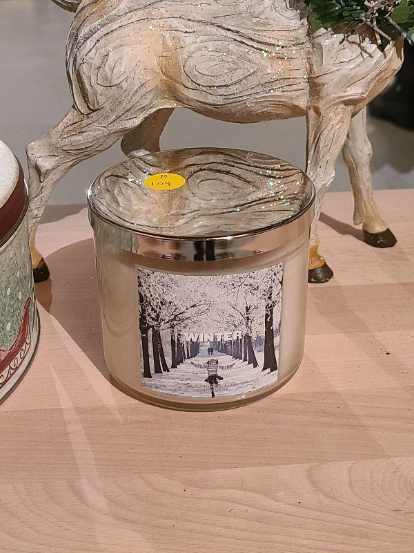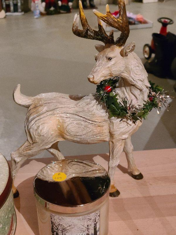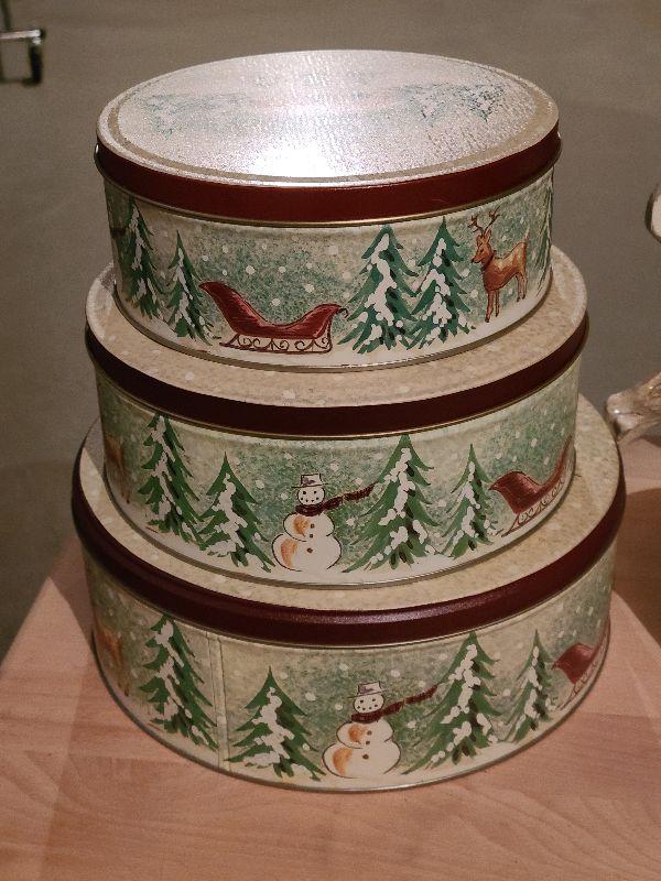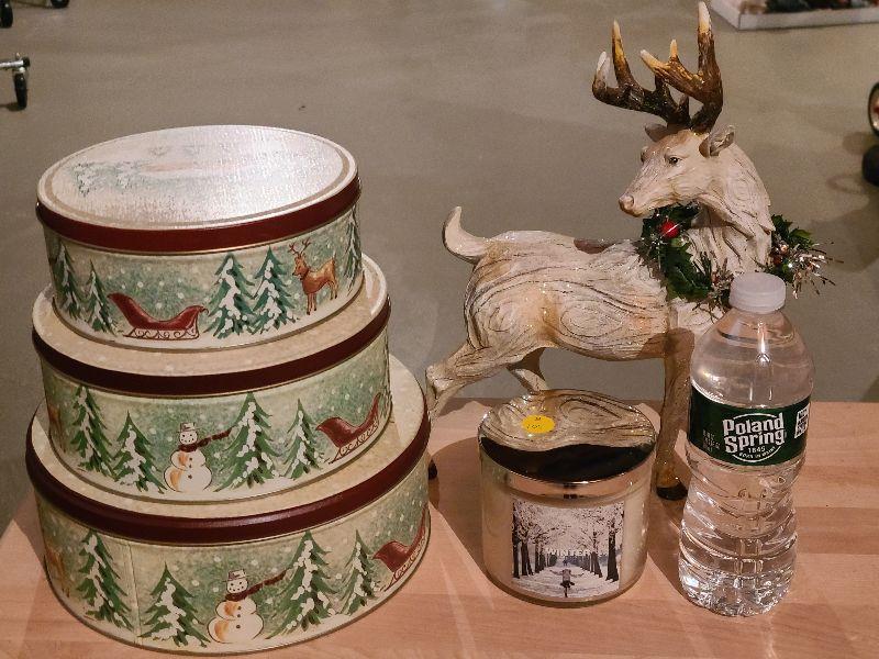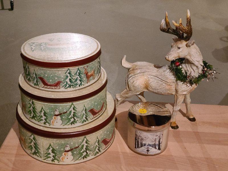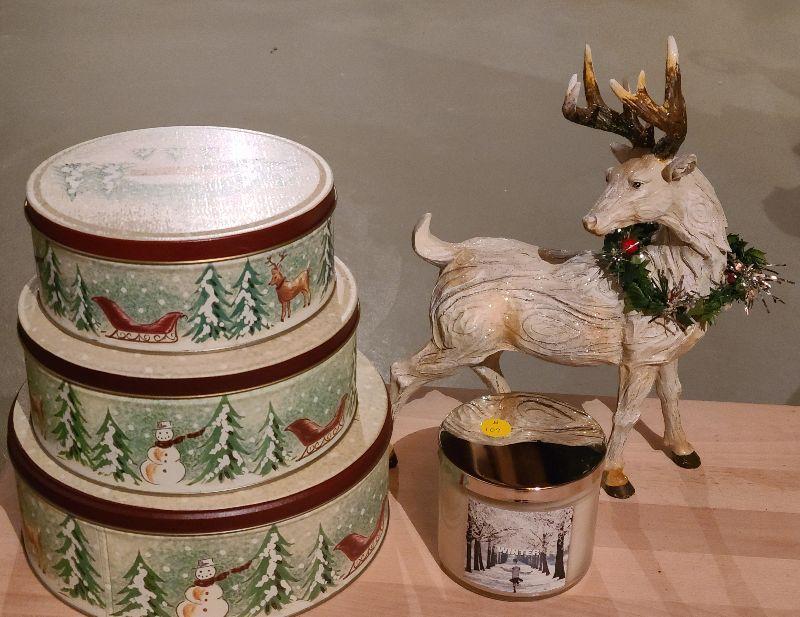 Nice lot of stacking holiday tins, candle and reindeer. Please see pics for condition and sizing
