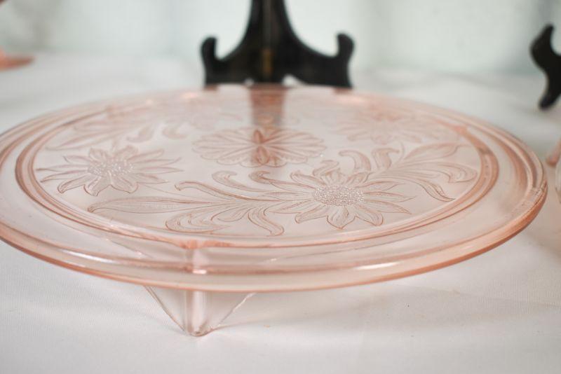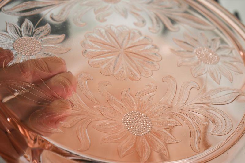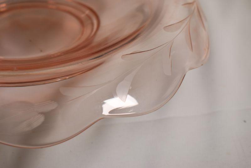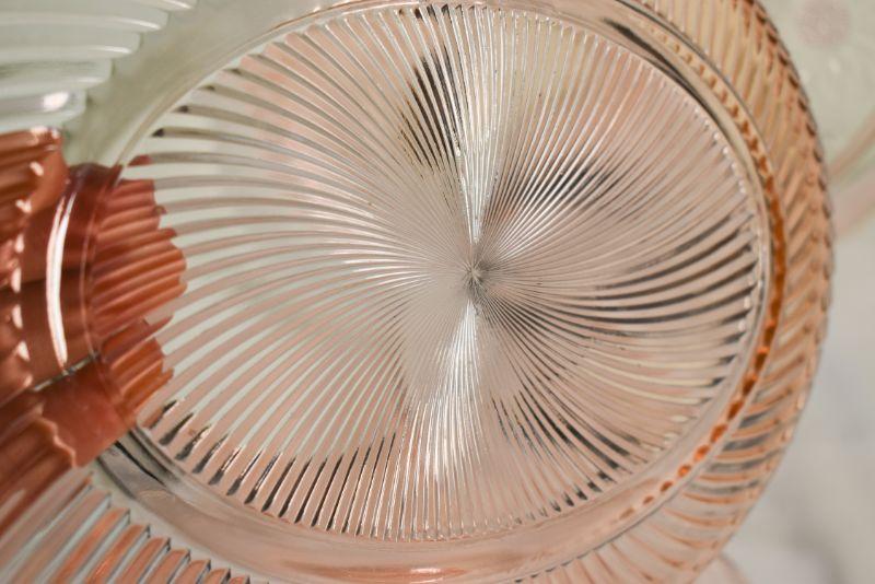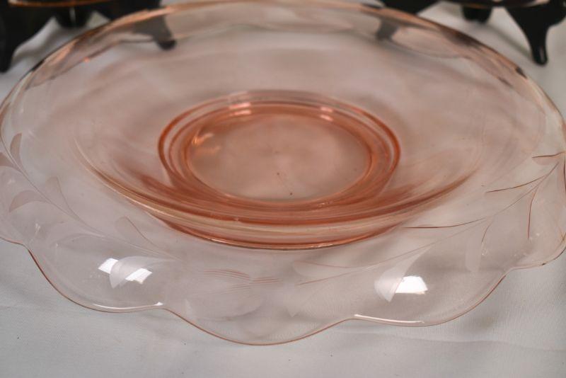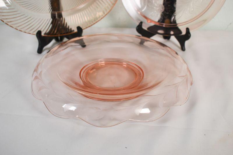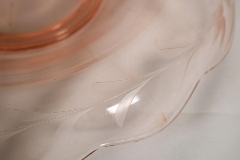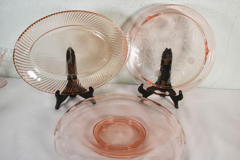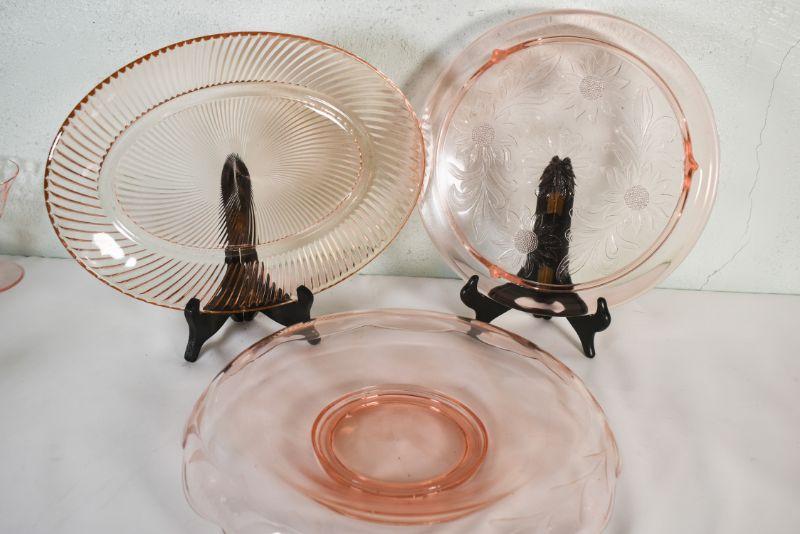 Nice selection of pink depression glass. A fluted oval platter, a round serving tray, and a scalloped bowl. No chips.