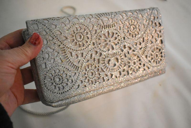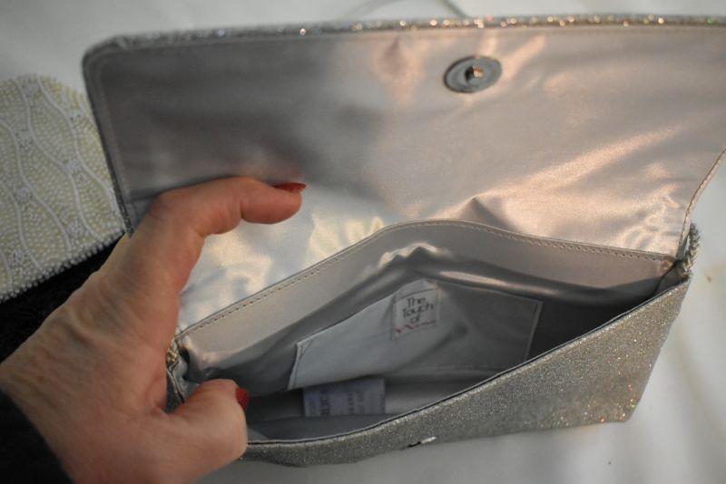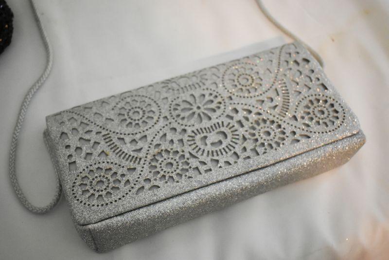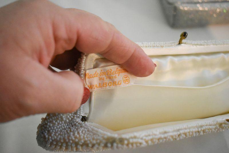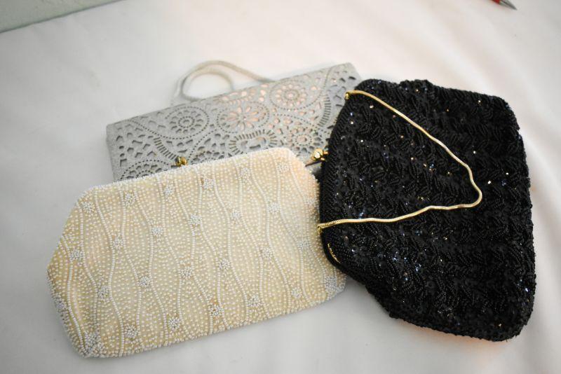 Hand beaded bags, Walborg made in Belgium, a Richere made in Hong Cong, and The Touch of Nina, a laser cut purse..