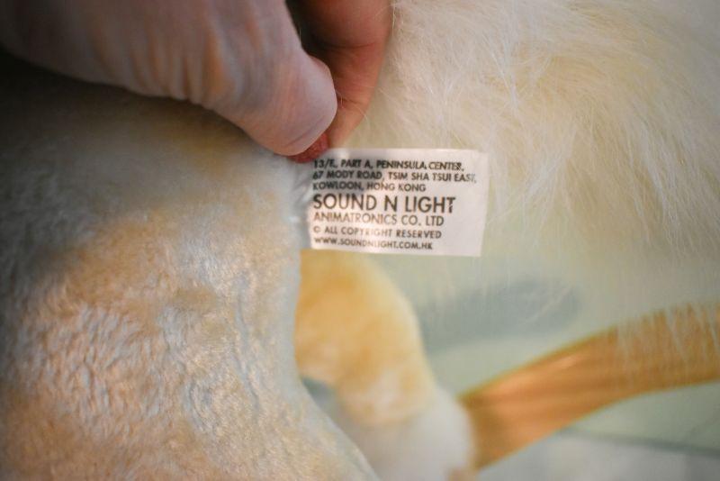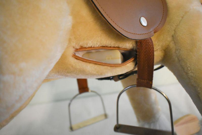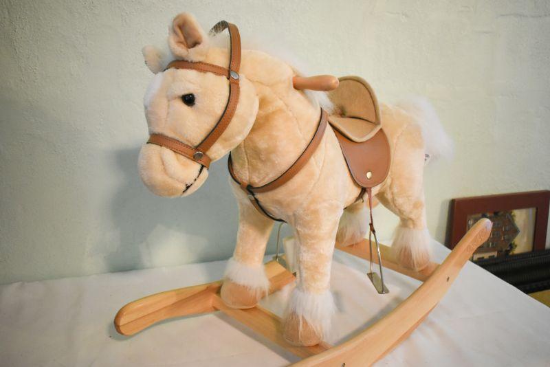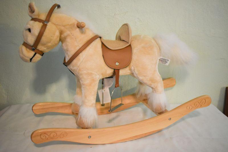 Sound N Light rocking horse. Furry horse with saddle and stirrups on wooden rockers. Untested. 33x23.