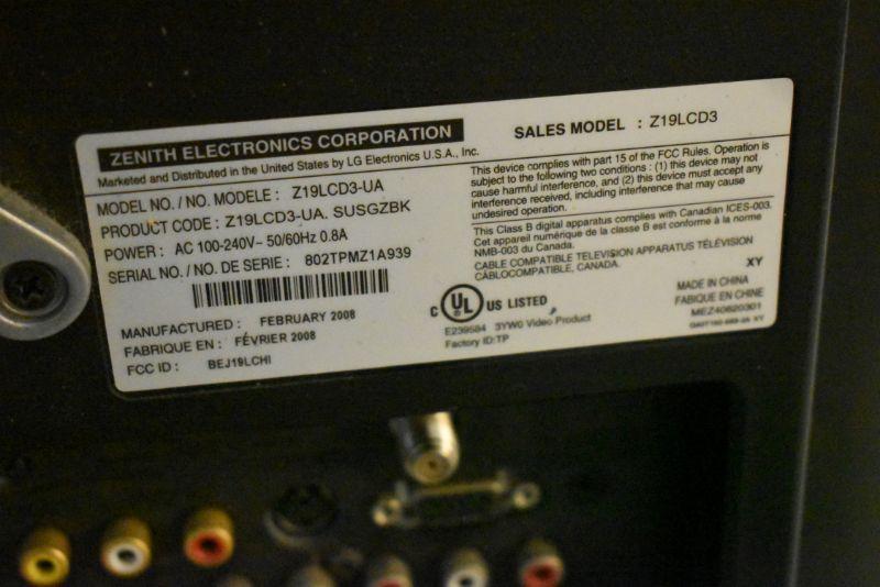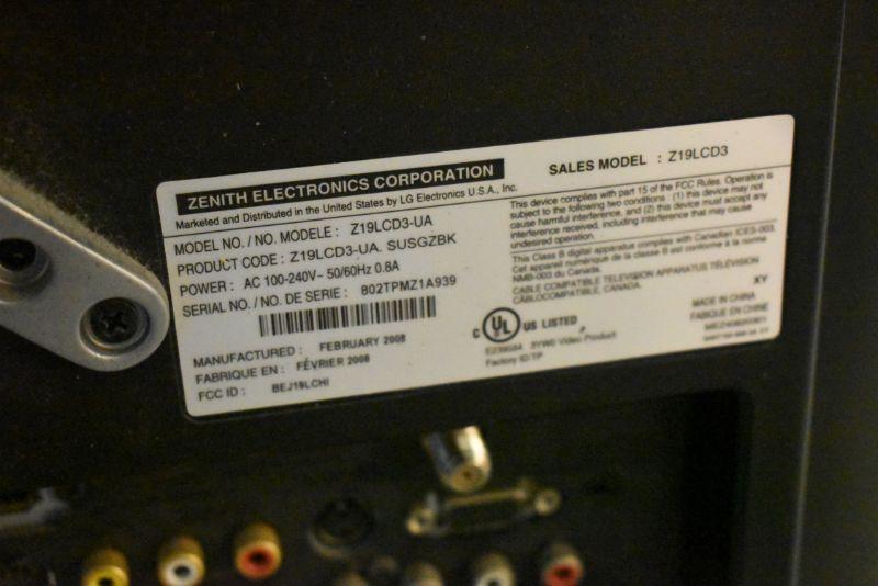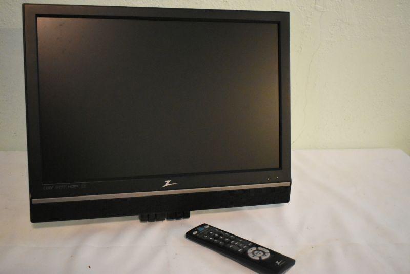 Zenith, 19 inch flat screen tv. Mounting hardware attached. Untested.