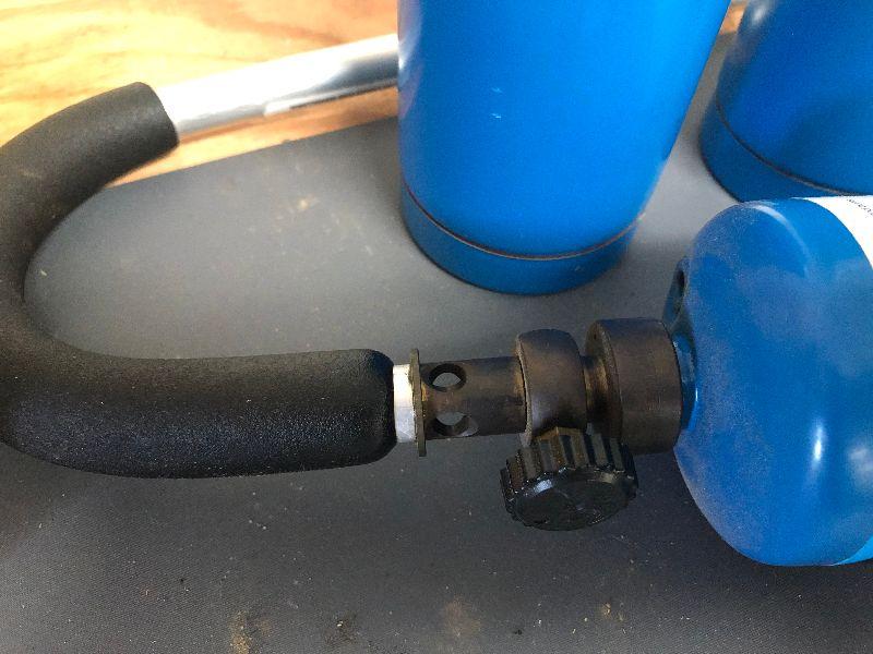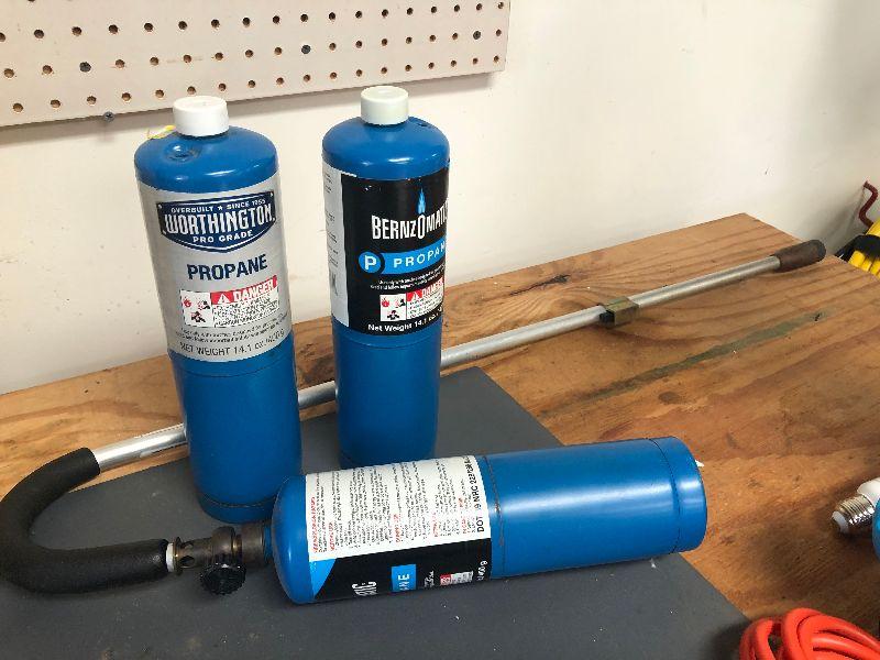 Three containers of propane and a hose.
