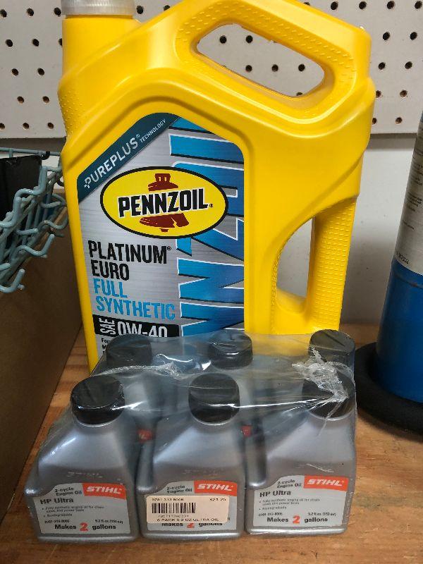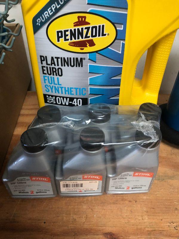 Pennzoil synthetic and Stihl engine oil.