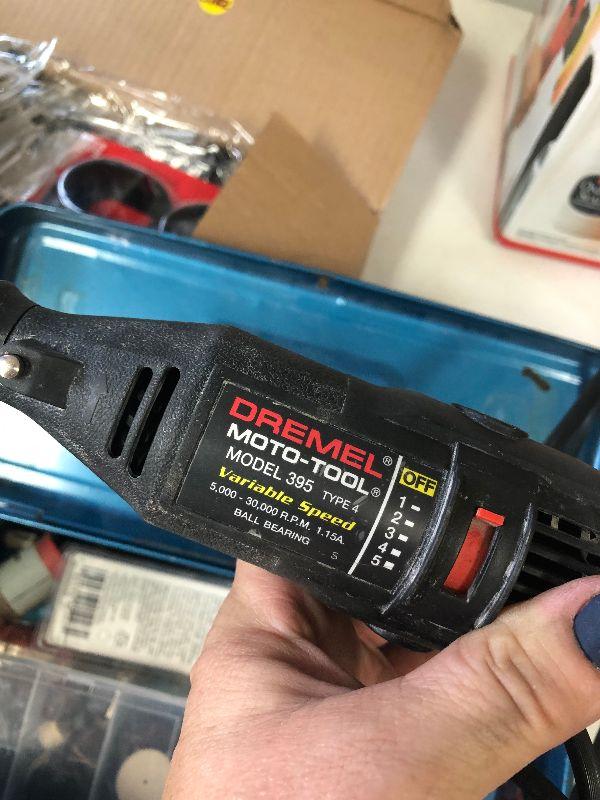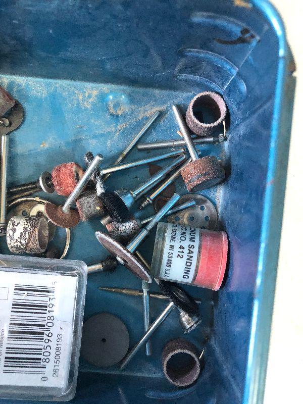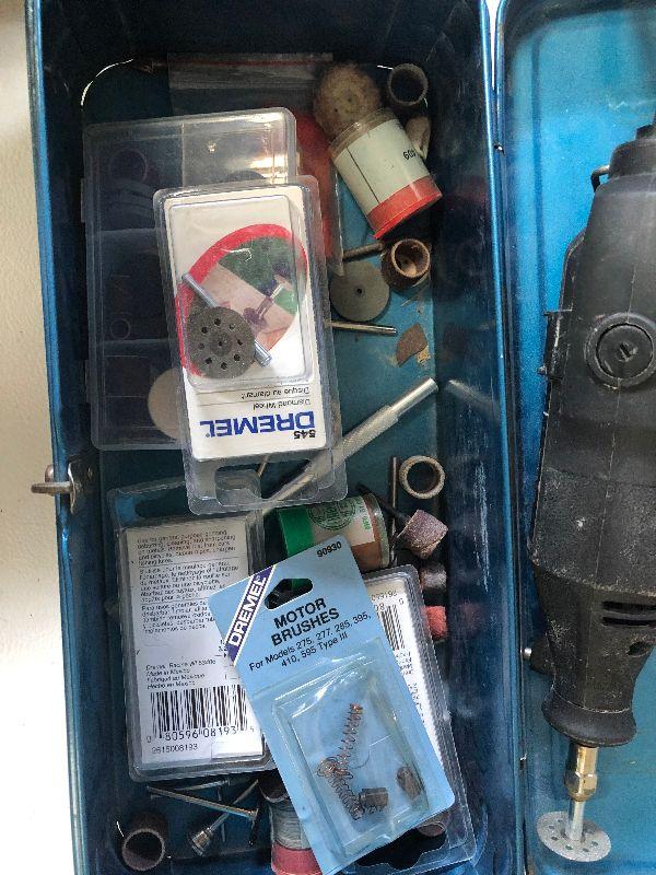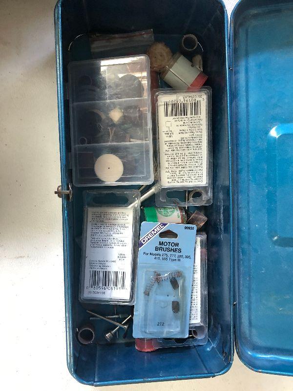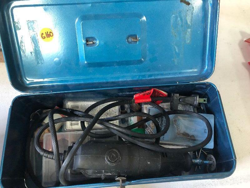 Dremel tool in metal tool box with, assorted fittings. Untested.