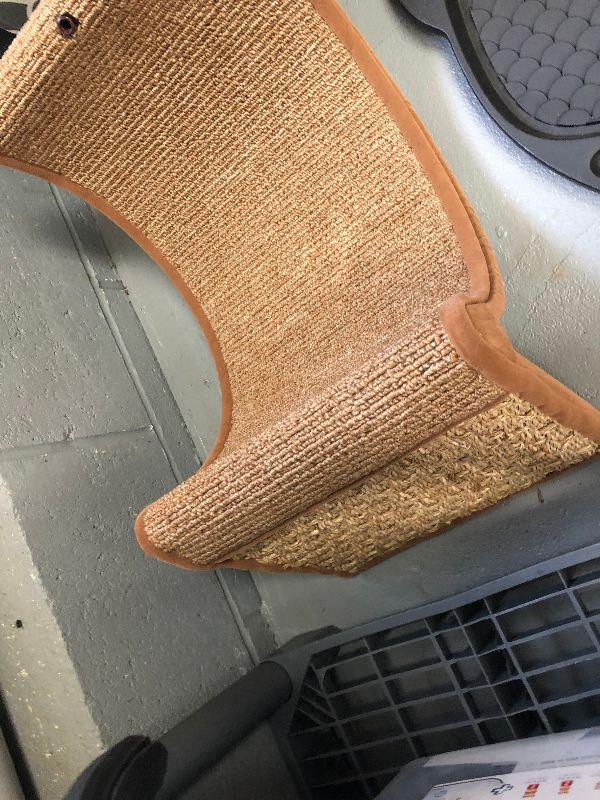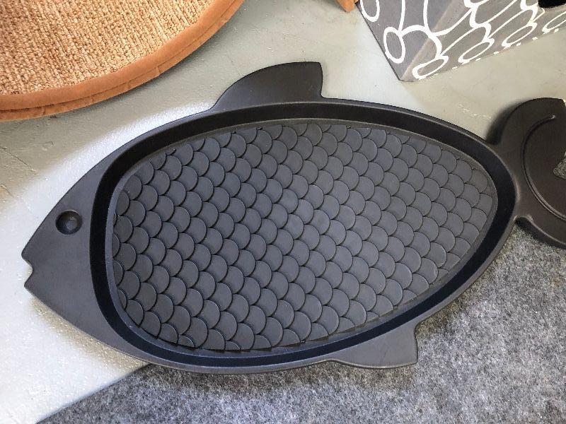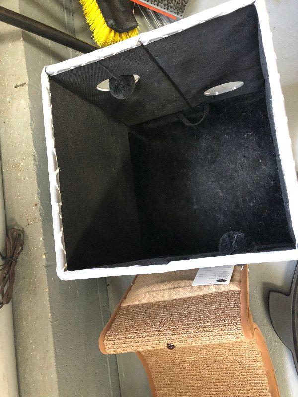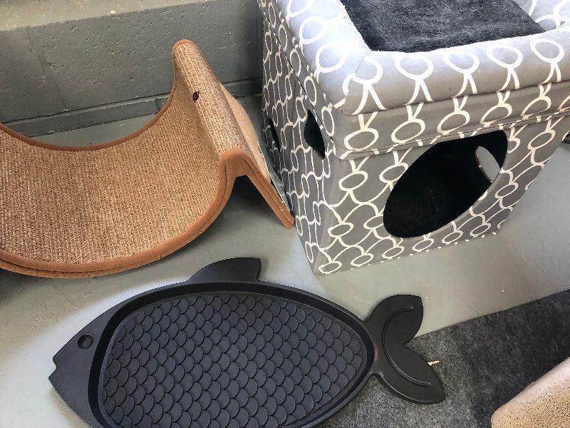 Cube bed, can sleep inside or perch on top, a scratching post, and a fish place mat.