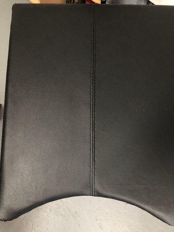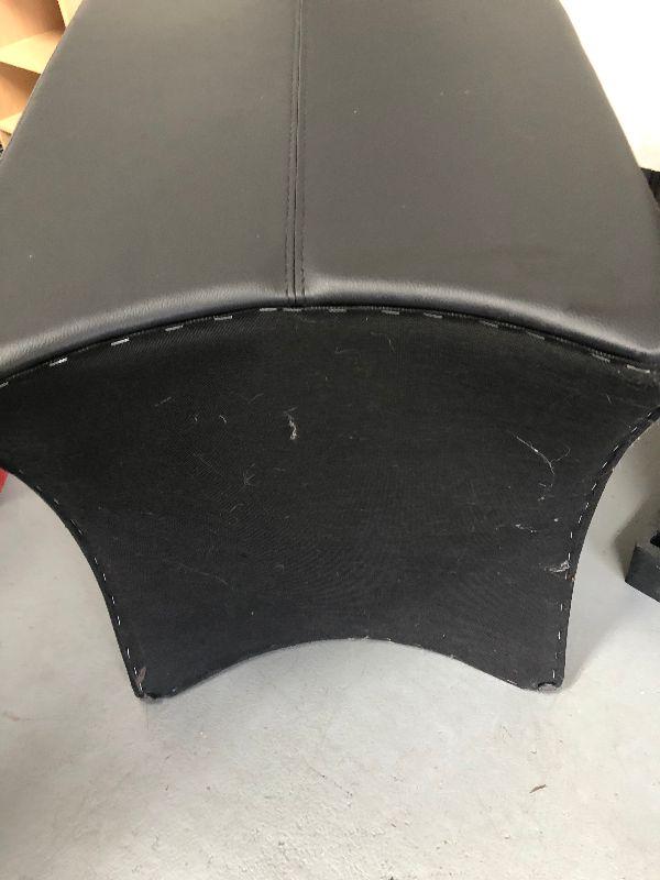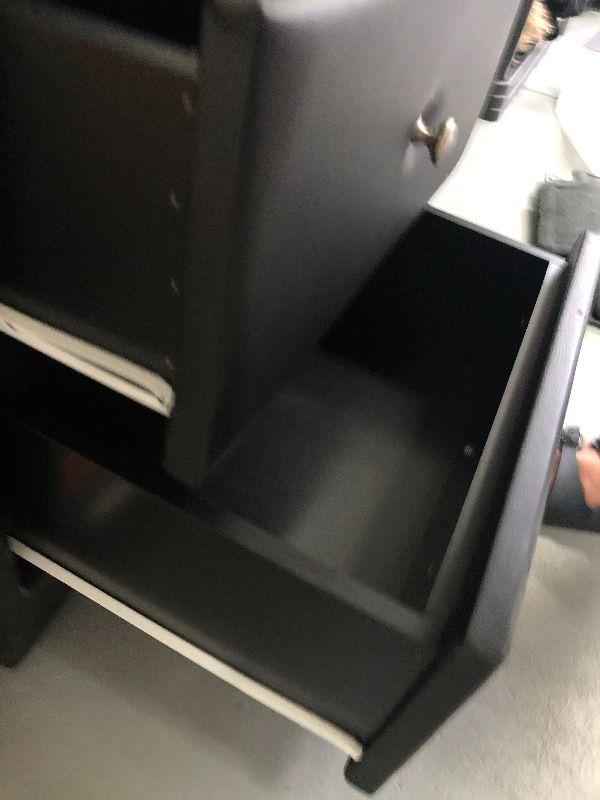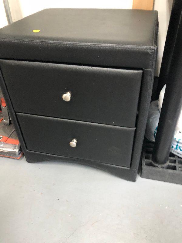 Wood side table with two drawers, the piece is covered in leather. No rips.