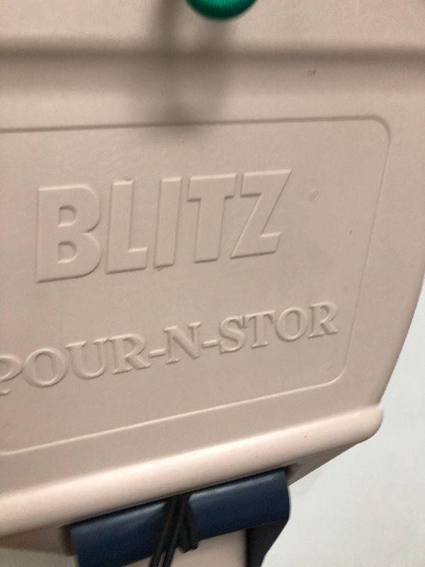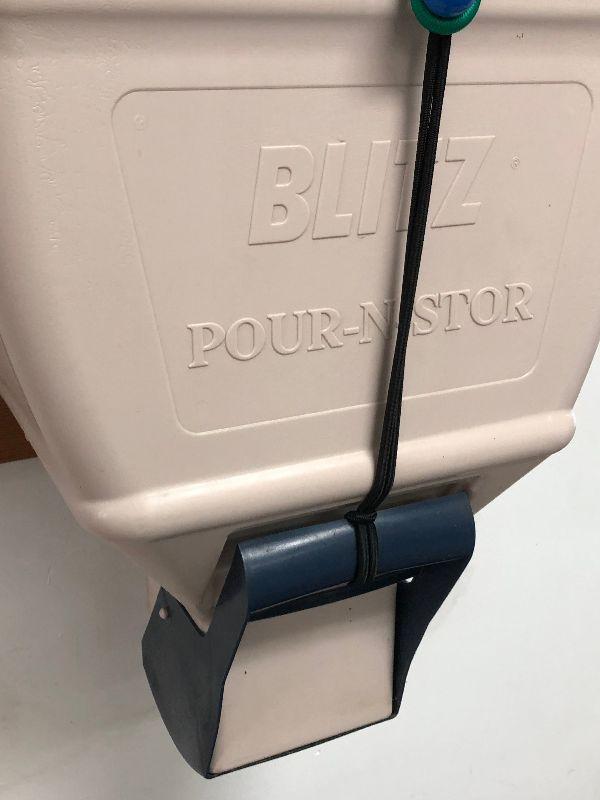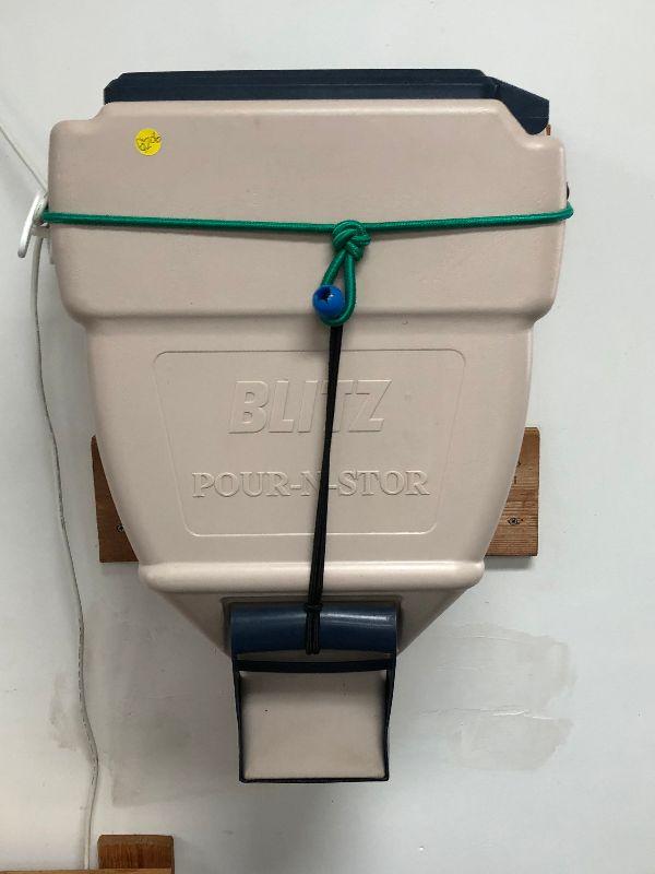 Wall mounted pour and store will hold 40 pounds of dog food.