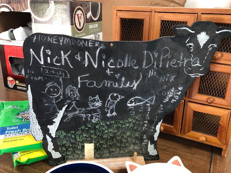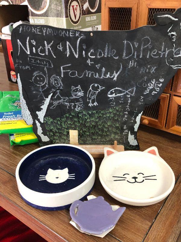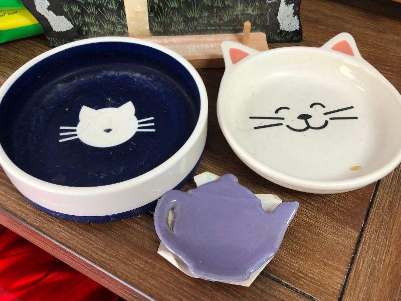 Two ceramic dishes, one in shape of cat head, a cow chalk board and wooden chalk holder.