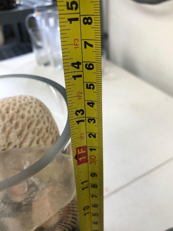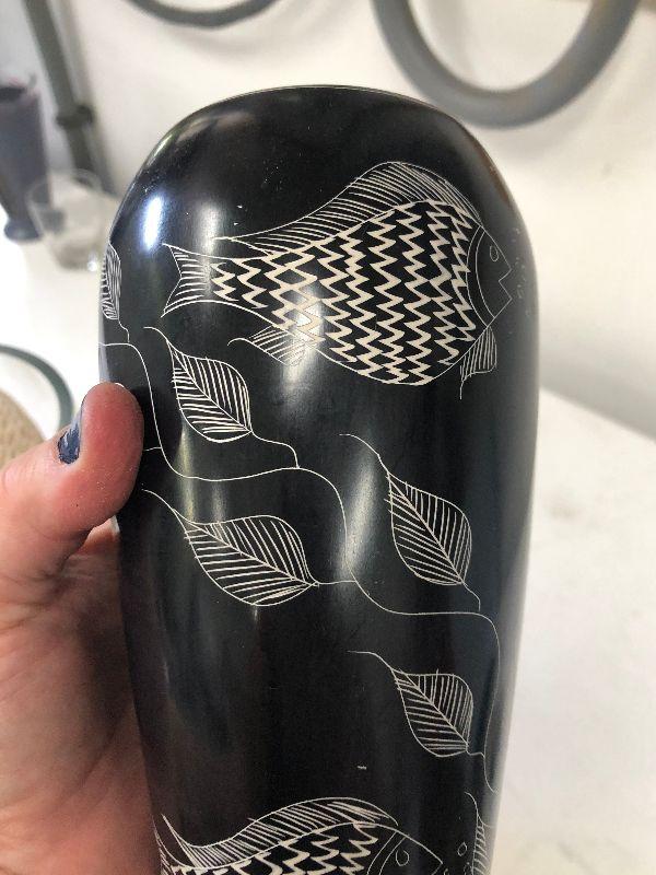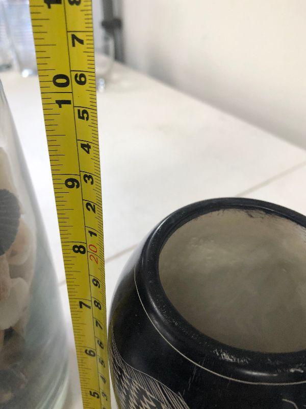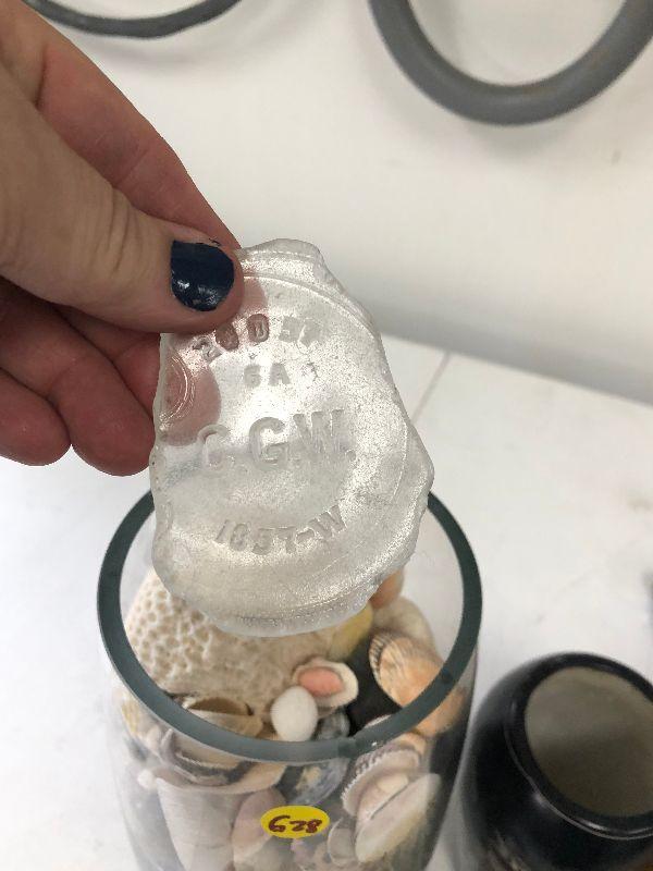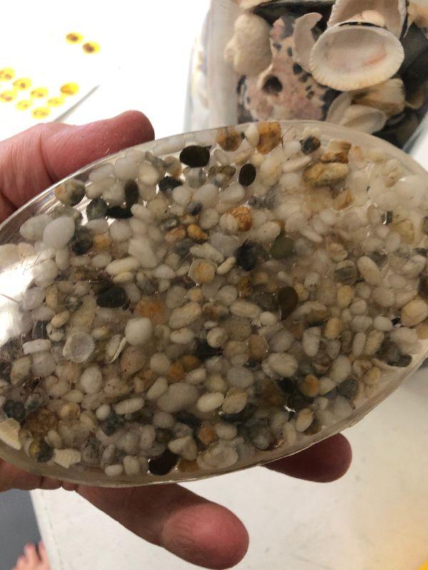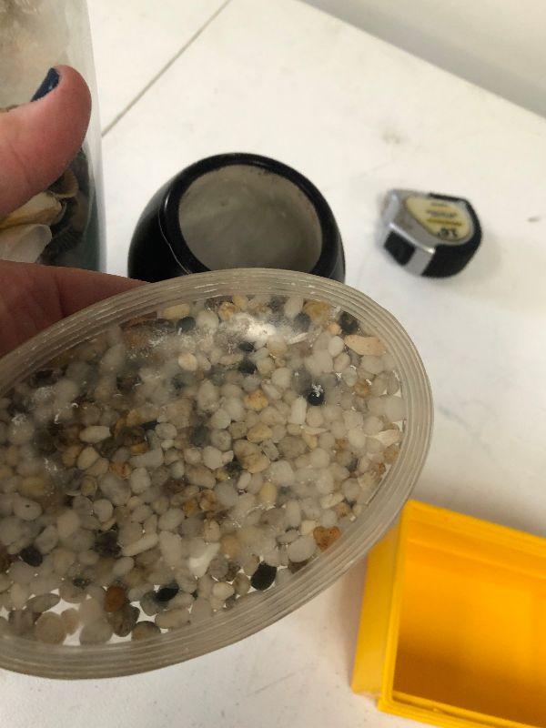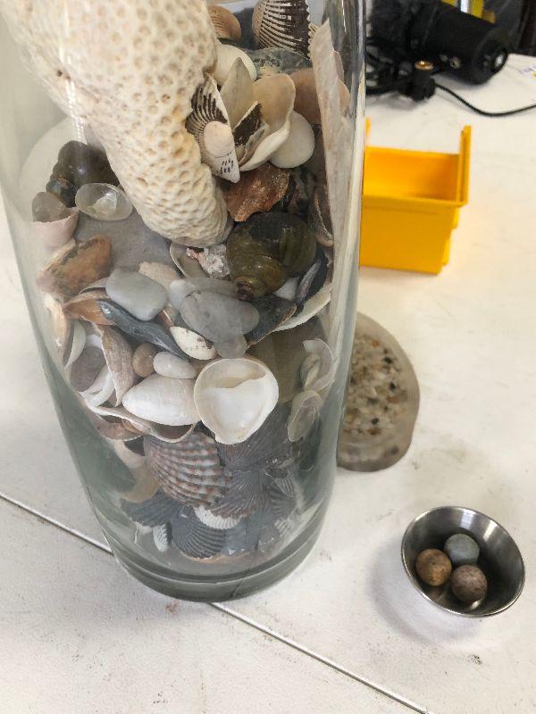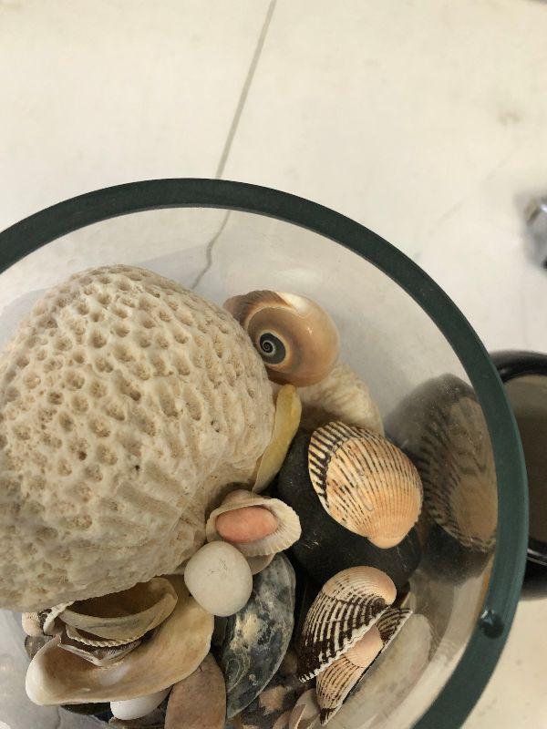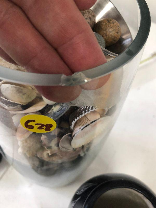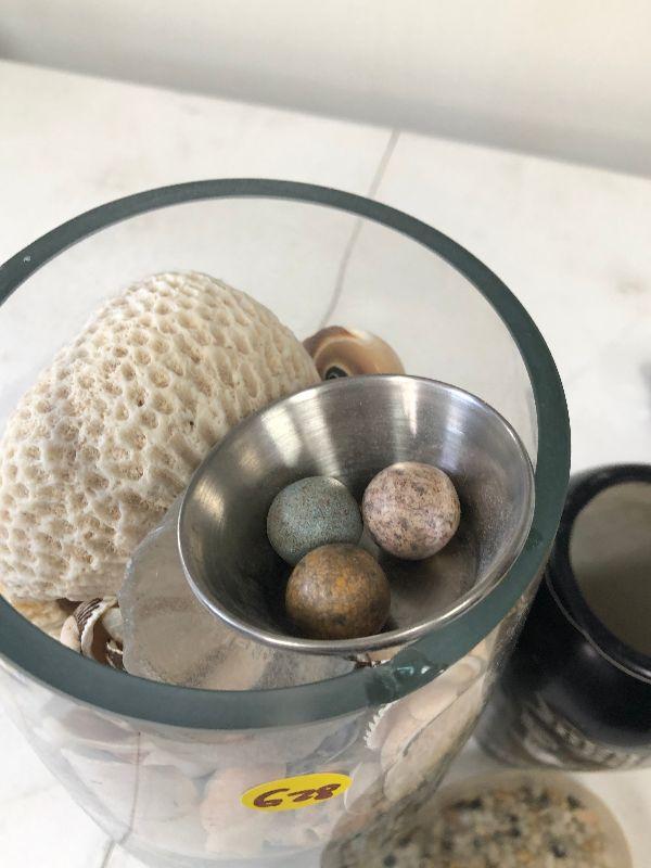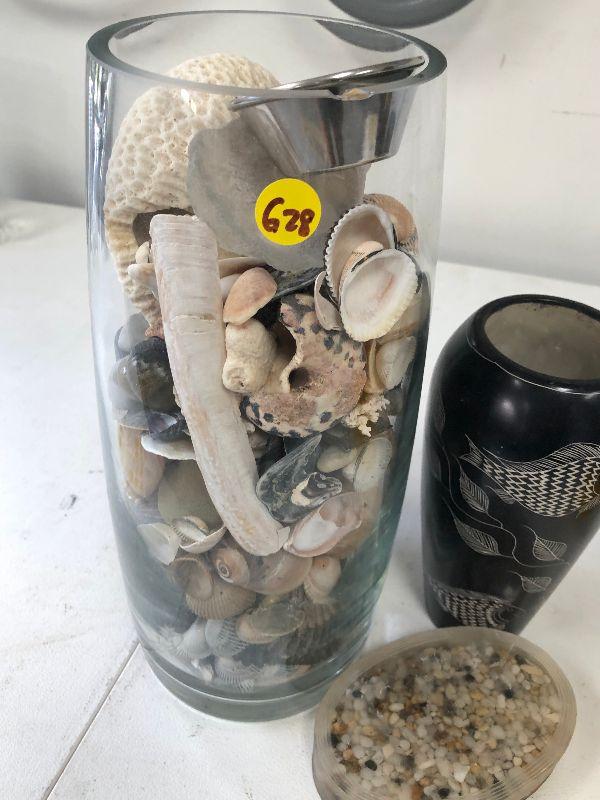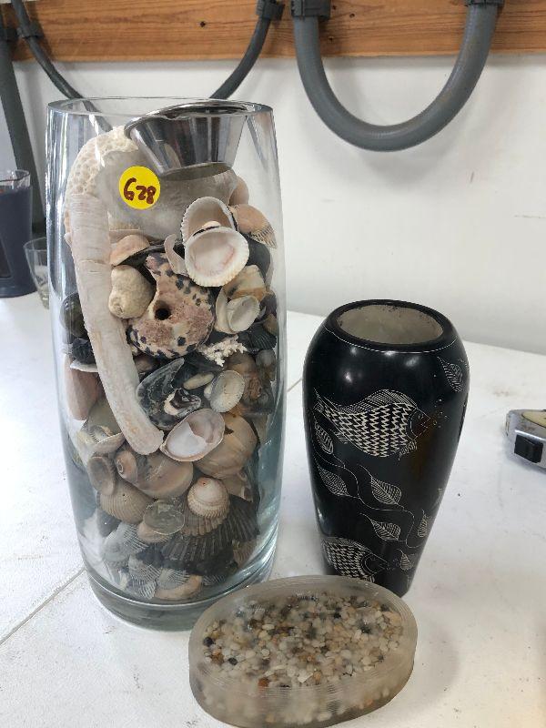 Clear glass vase filled with sea shells, a black and white vase with fish, and an acrylic paper weight filled with pebbles.