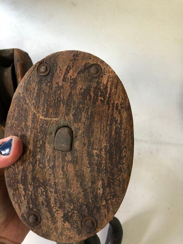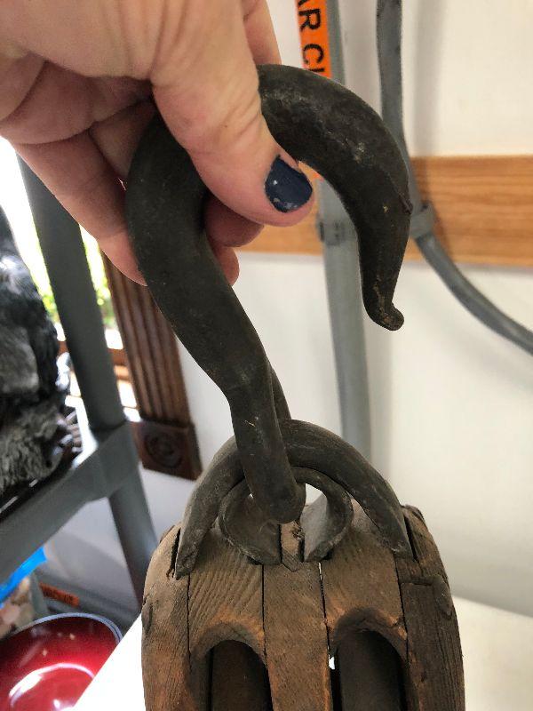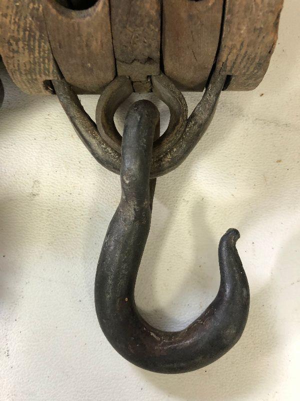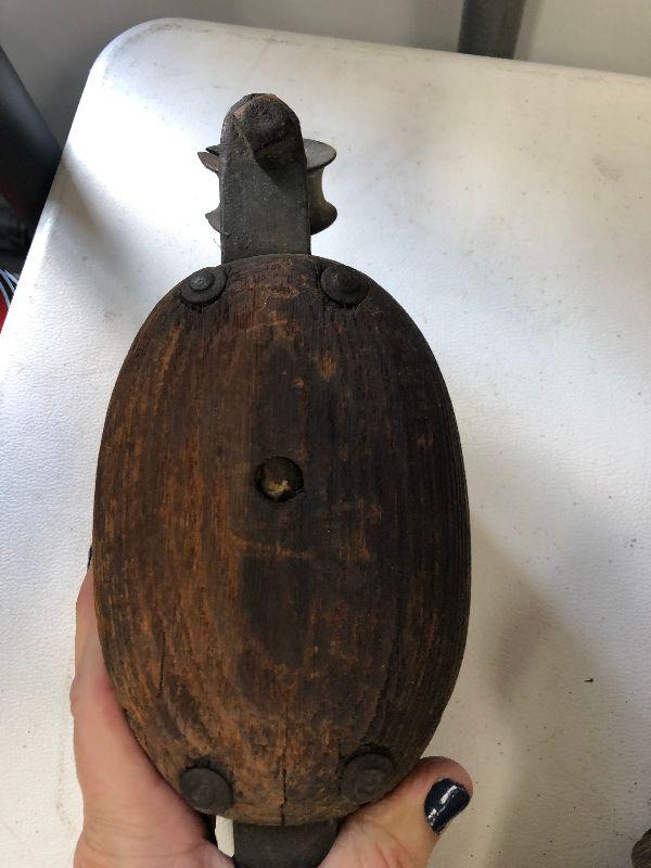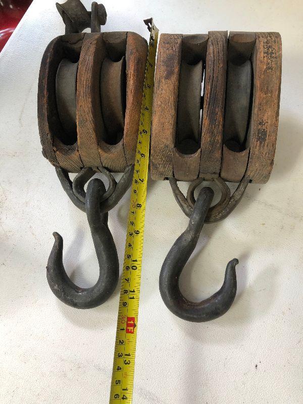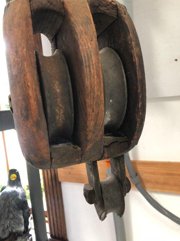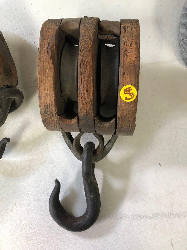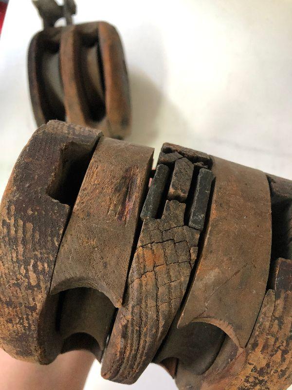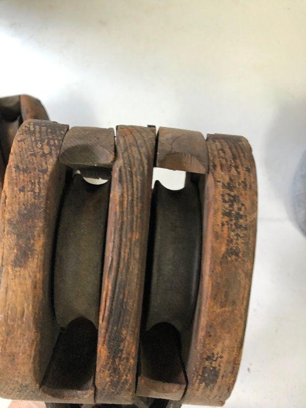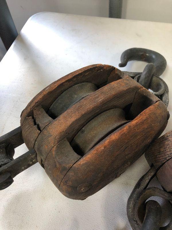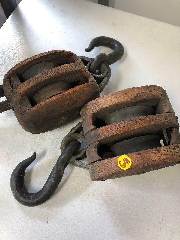 Antique iron and wood pulleys.