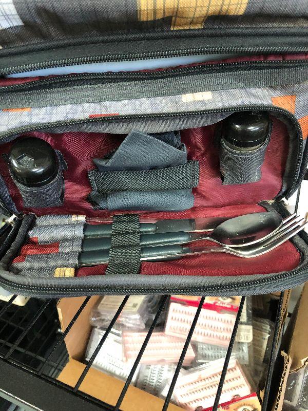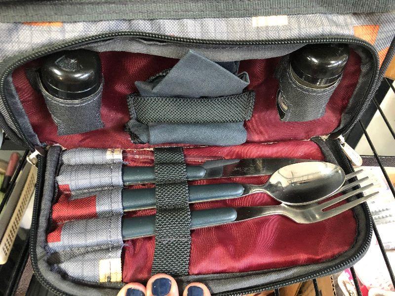 Loaded with eating utensils, napkins, s&p, even a container for the cold stuff.