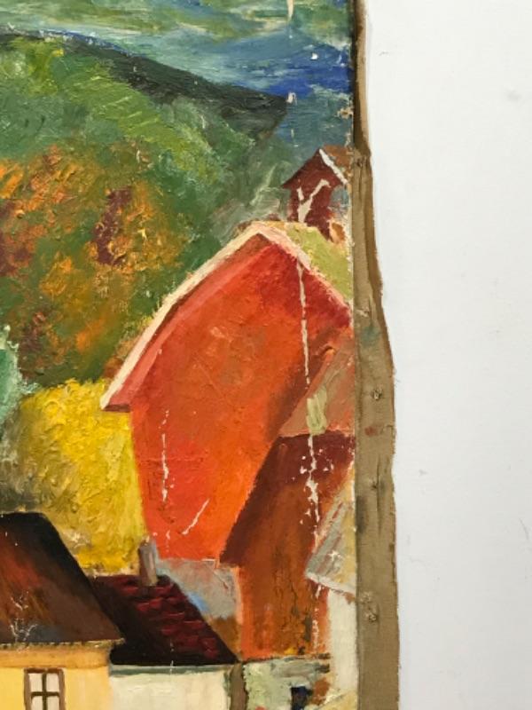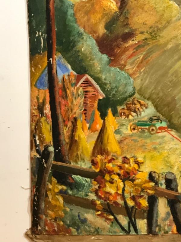 Glen Ranney original oil painting “Harvest in the Hills Scenery” on canvas without stretchers, measures 28-1/2” long and 24” tall. Some paint chipping (see photos).