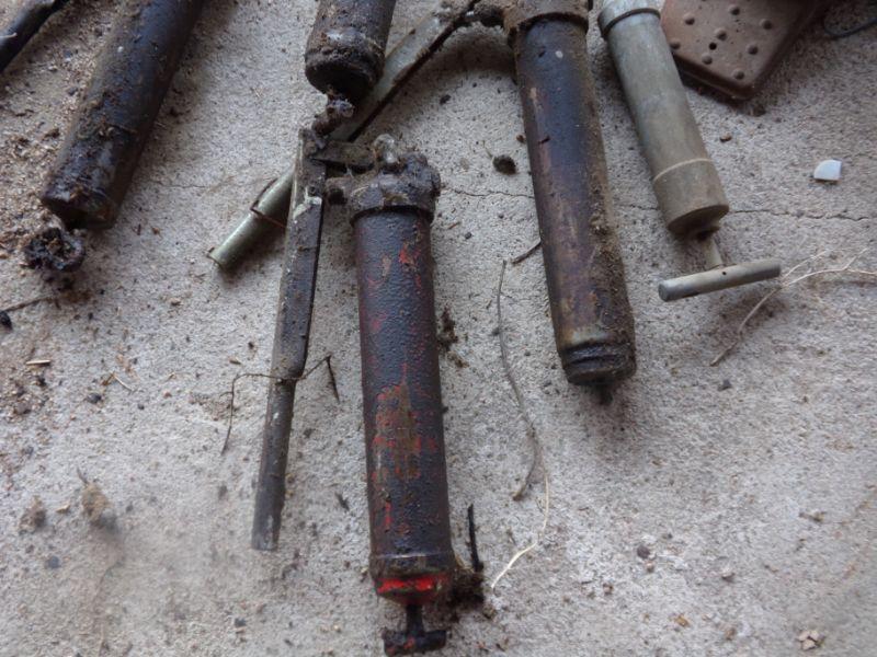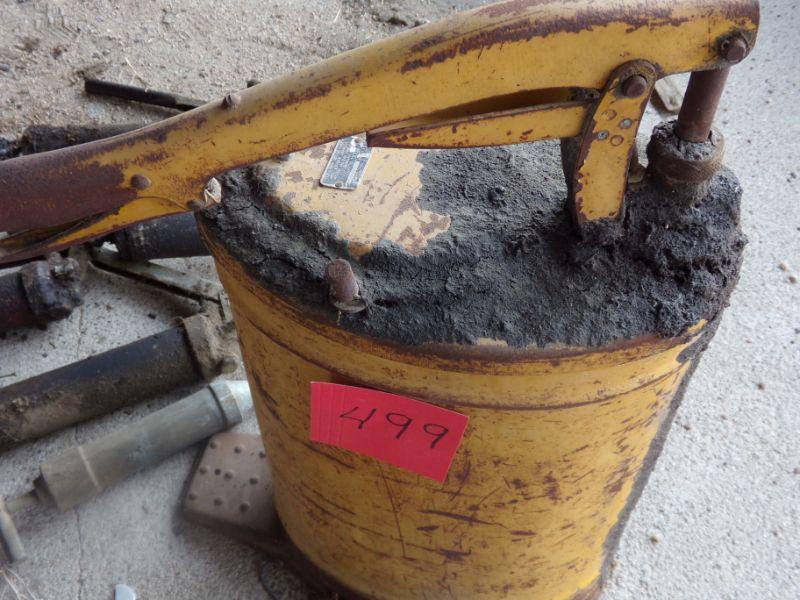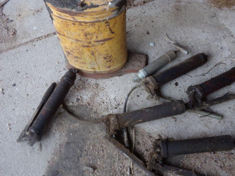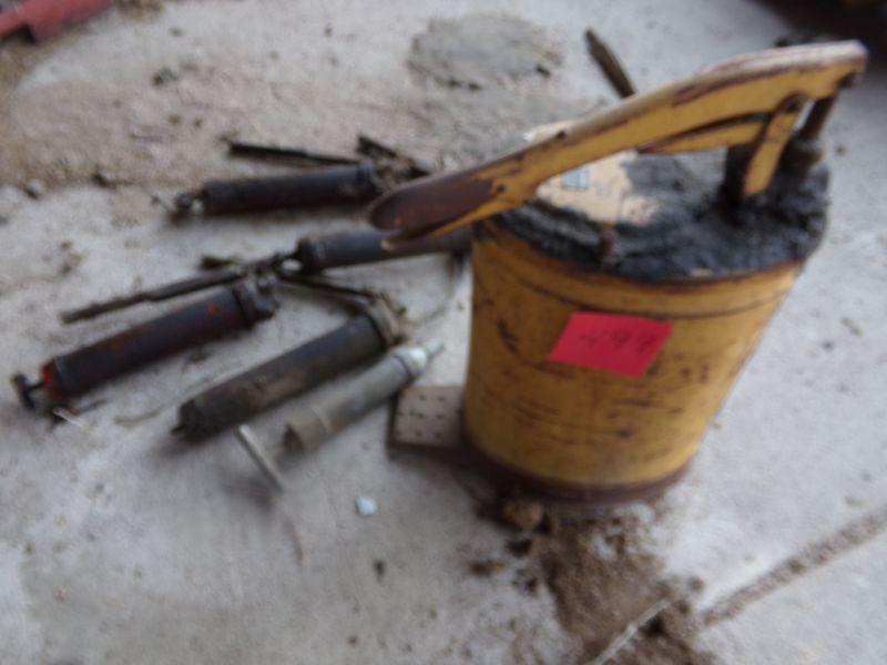SEVERAL GREASE GUNS AND A GREASE CAN WITH HAND PUMP.