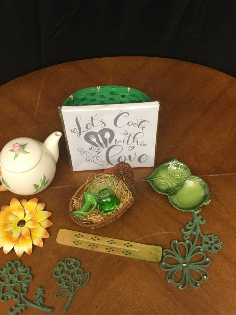 home decor:lot green basket, tea pot, small basket, 2 small green jars/glass, incense burner, 2 resin wall hanging flowers, owl spoon rest, yellow metal garden flower, "Lets cook with Love" sign.;
